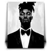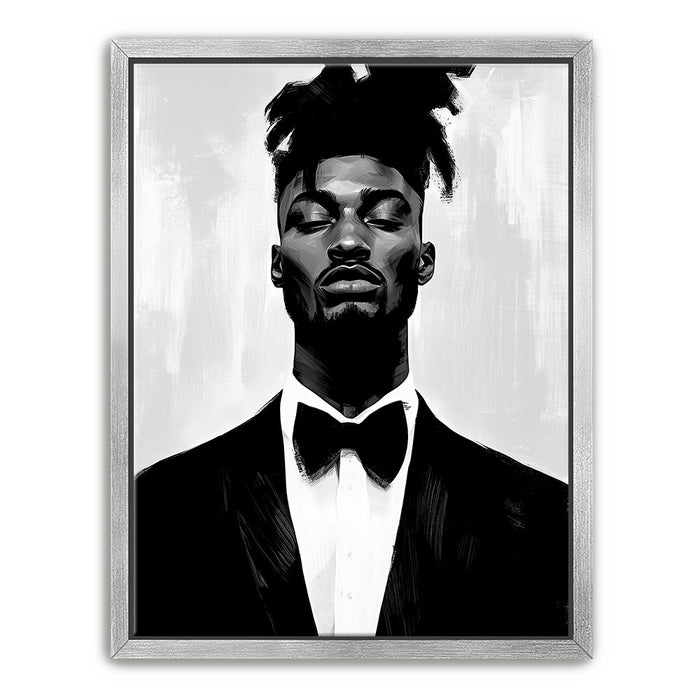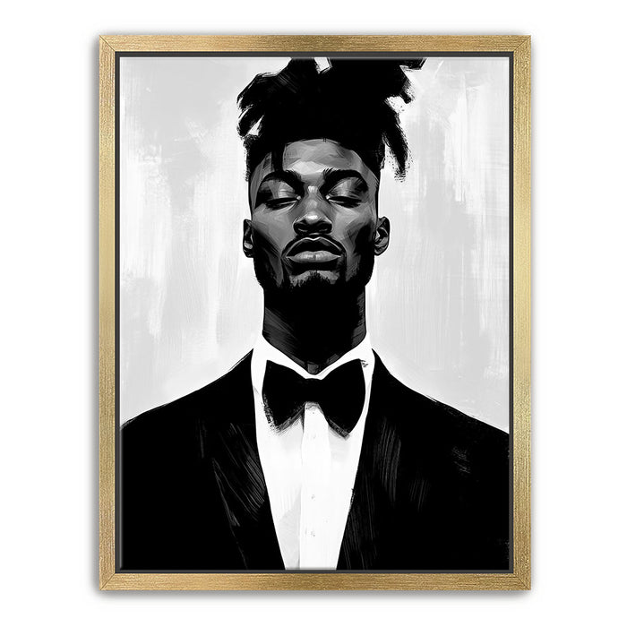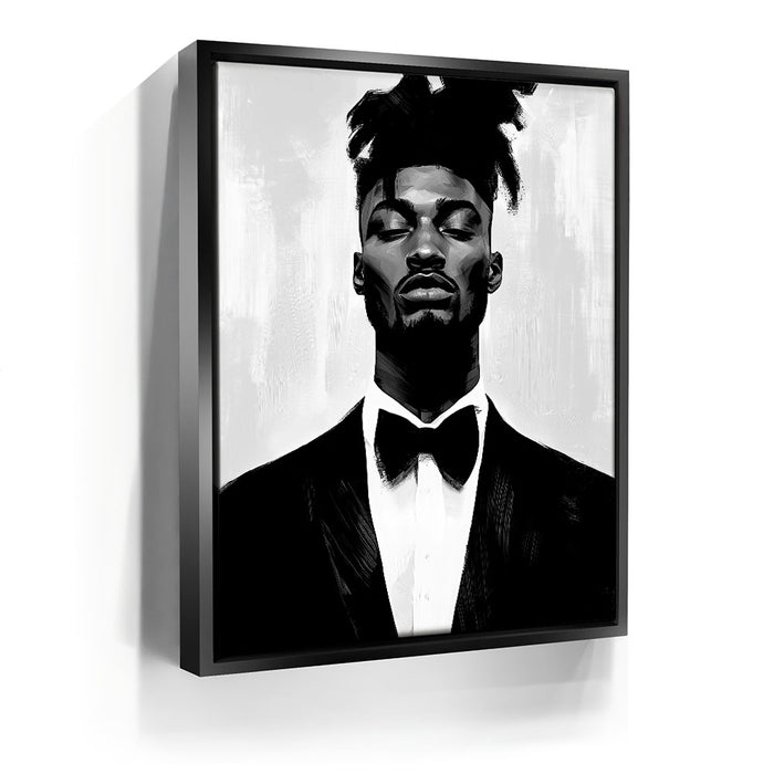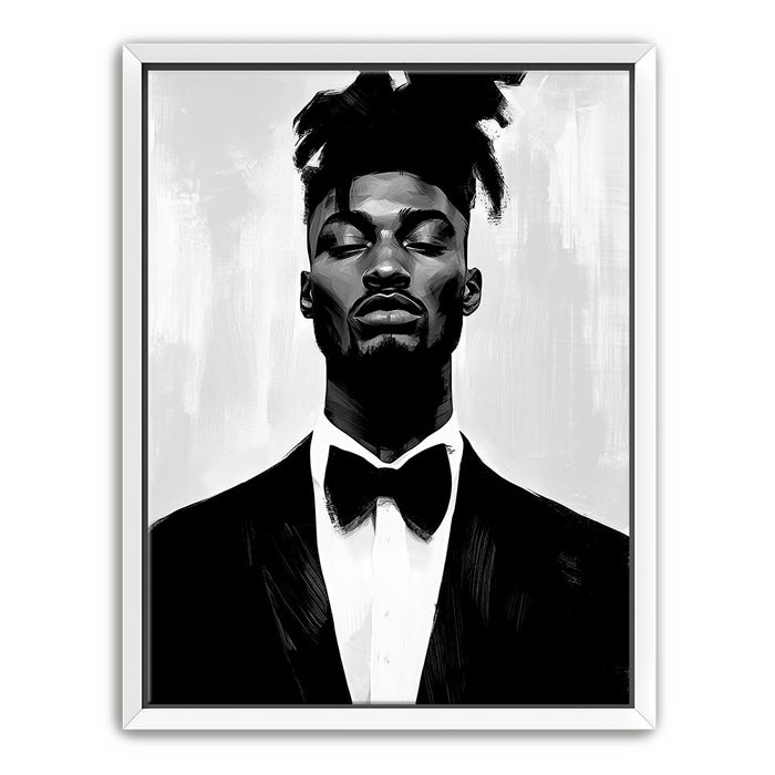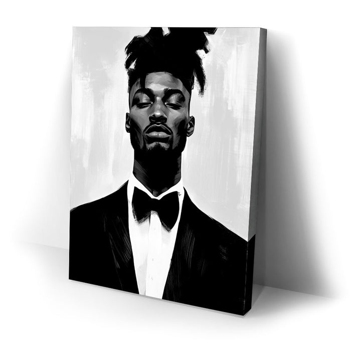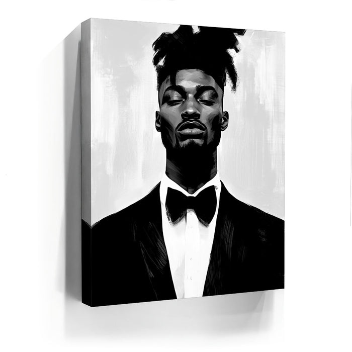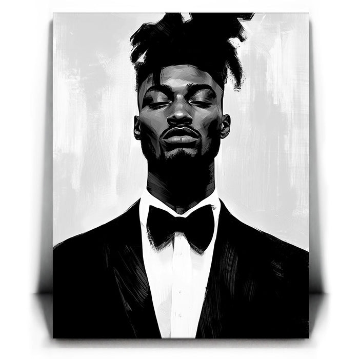 "Black Tie Energy" by Kandise King is a striking black-and-white digital portrait that captures confidence and elegance. Featuring a modern, formal aesthetic, the subject exudes sophistication, with bold brushstrokes emphasizing his sharp tuxedo and commanding presence. This artwork embodies empowerment and timeless style, making it a perfect addition to contemporary art collections.