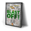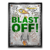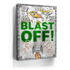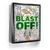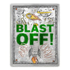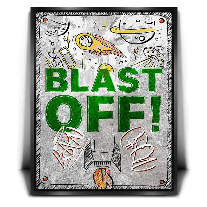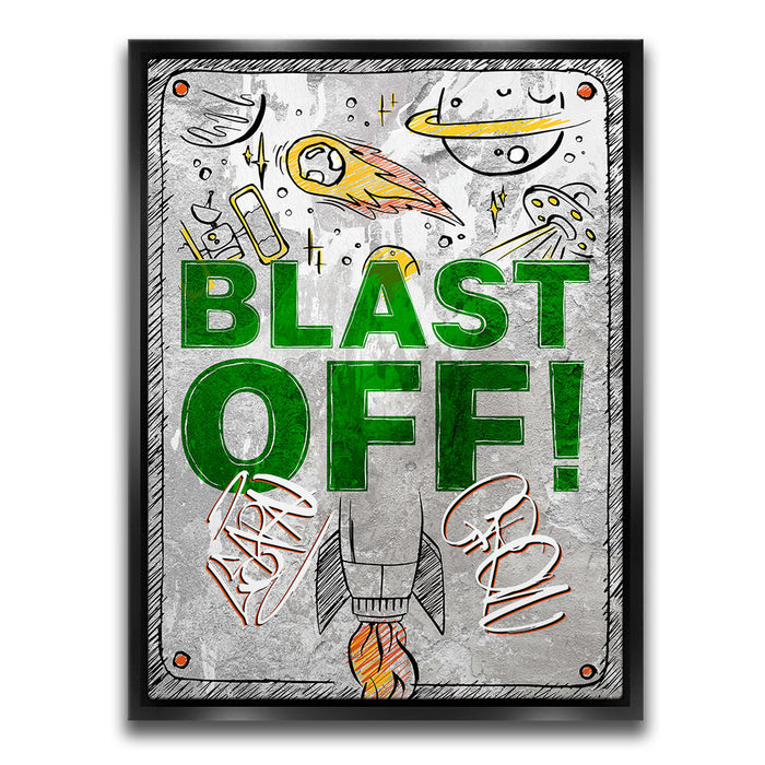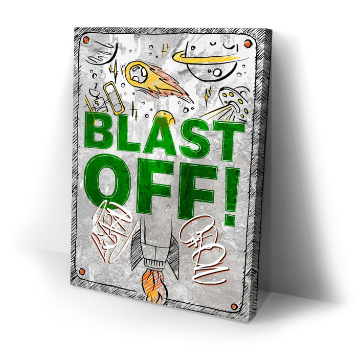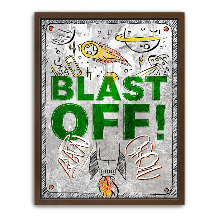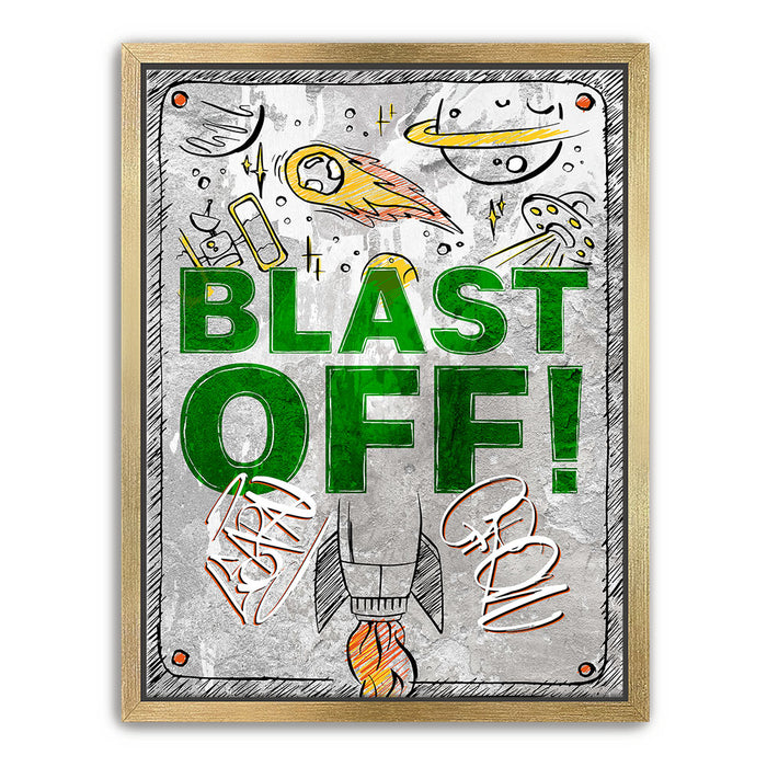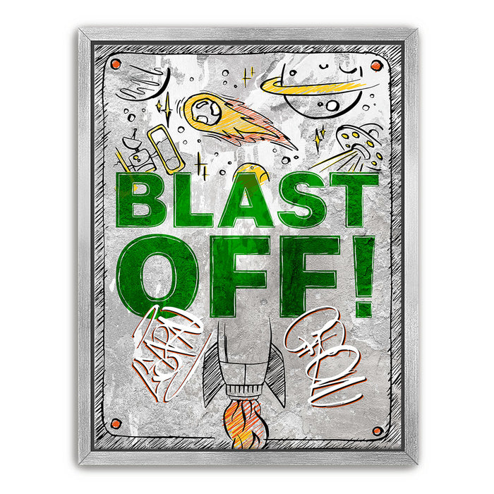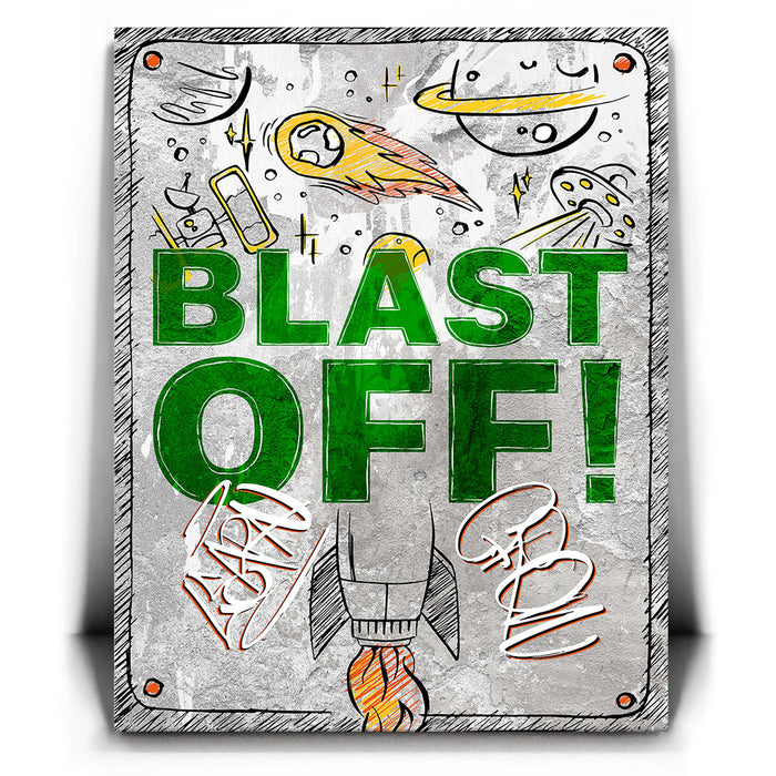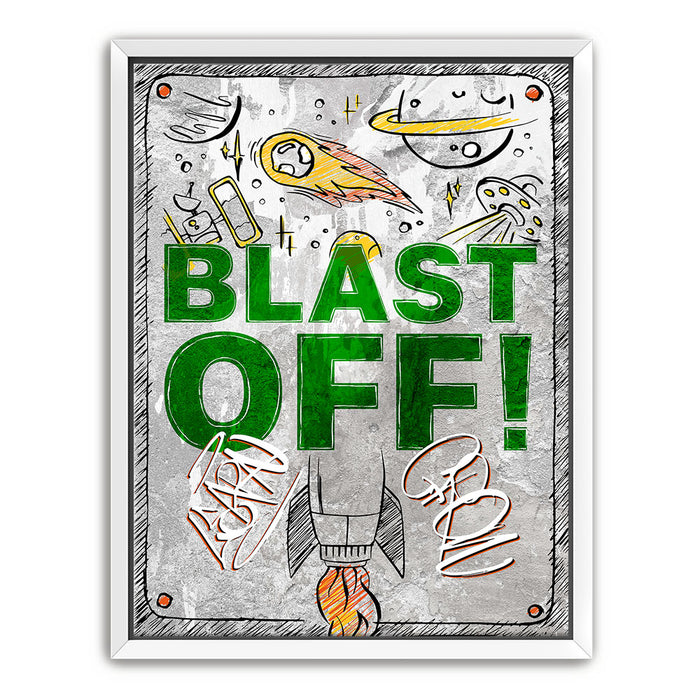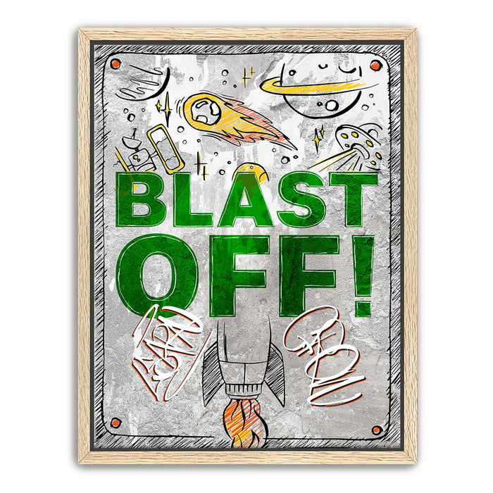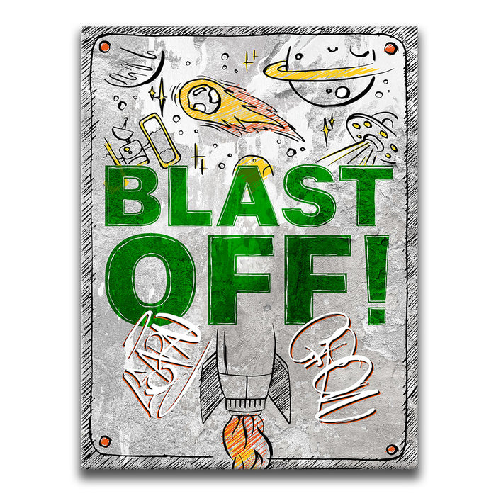 "Blast Off" is an energetic and playful artwork featuring a rocket launching into space surrounded by celestial elements like planets, comets, and UFOs. The bold green text and dynamic illustrations evoke a sense of adventure and excitement, making it ideal for inspiring creativity and curiosity in viewers. This piece captures the wonder of space exploration with a fun, vibrant style.
