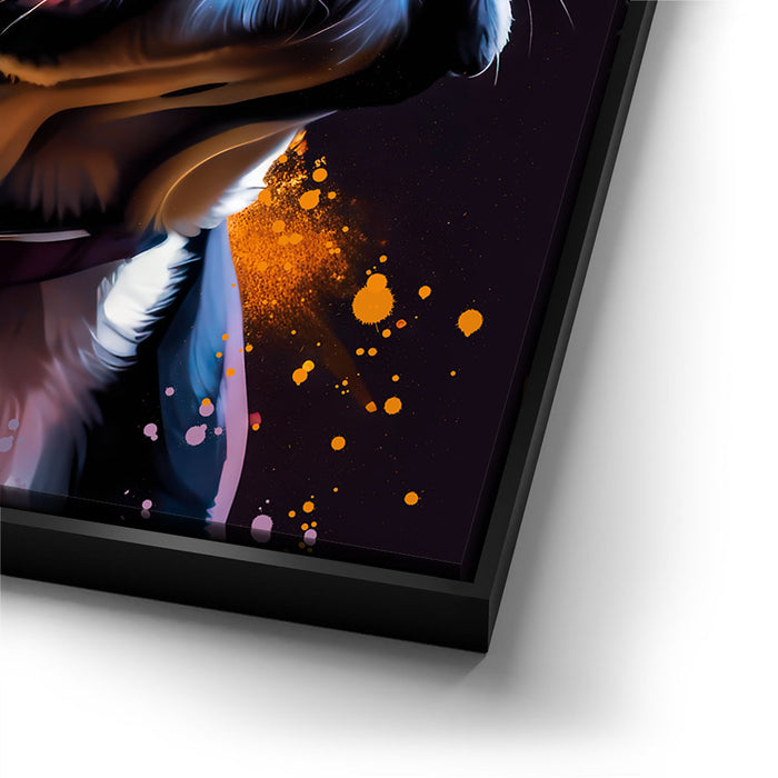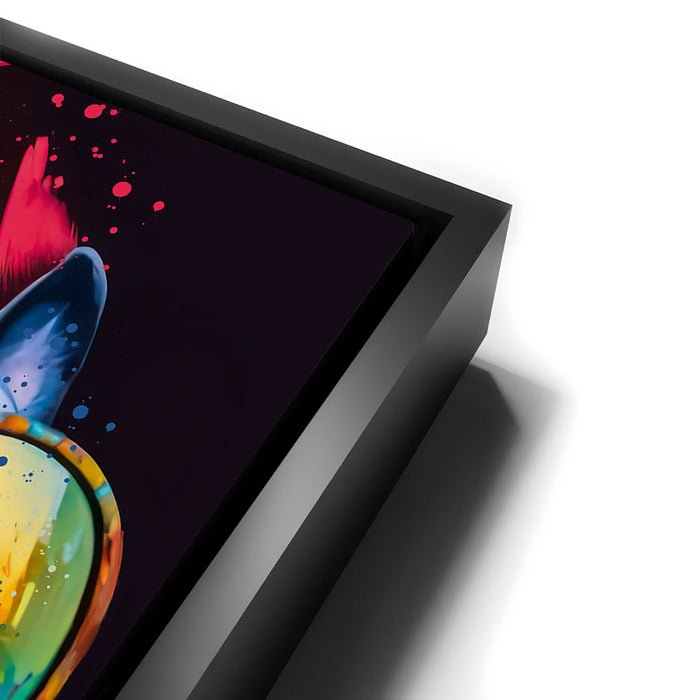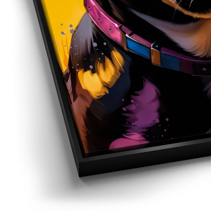 The playful composition and dynamic color palette make this piece a perfect statement for dog lovers and art enthusiasts alike. Its modern aesthetic and whimsical vibe add a fun, energetic touch to any space, showcasing the artist's creativity and flair for personality-filled subjects.