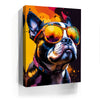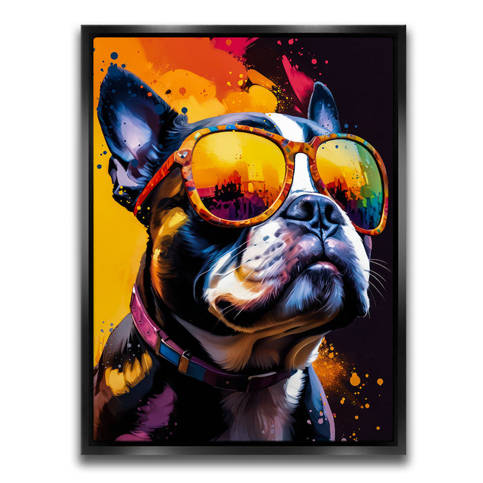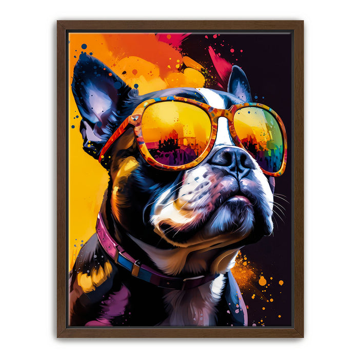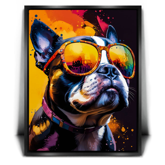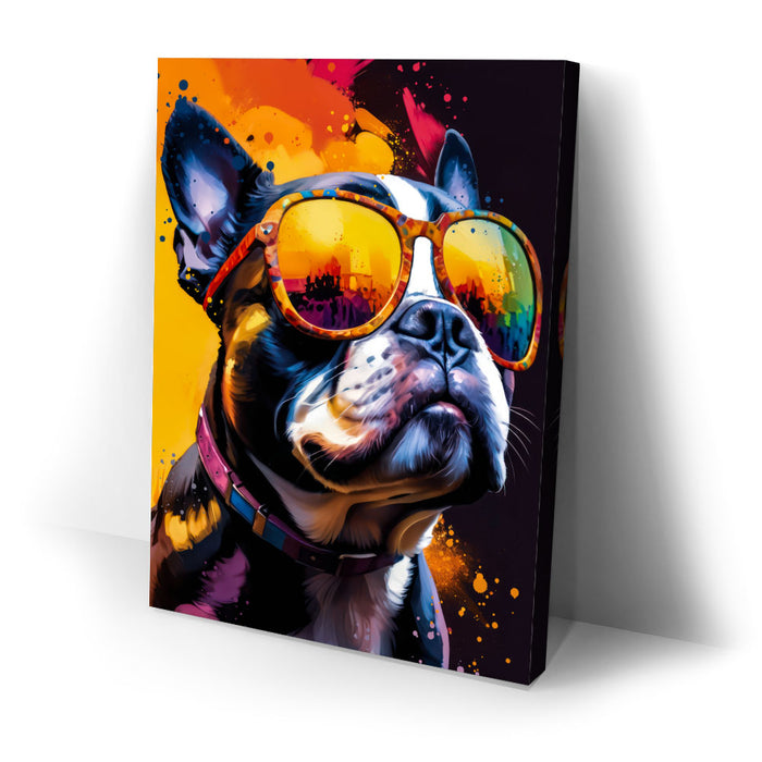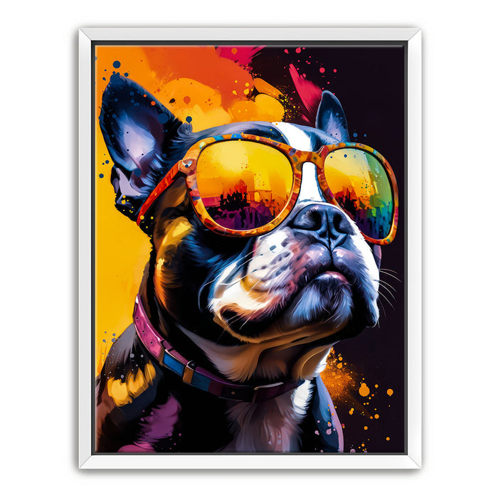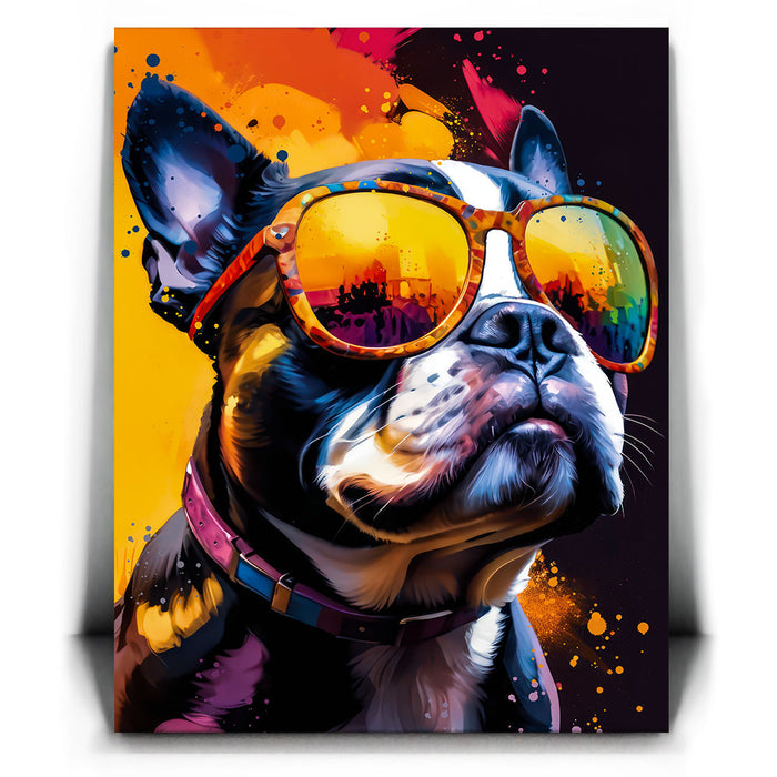 "Boston Terrier Cool" by Stella Ygris is a vibrant and lively portrayal of a Boston Terrier donning colorful, reflective sunglasses. This eye-catching artwork blends bold splashes of color with the dog's confident expression, capturing a sense of charisma and charm that is both humorous and stylish.