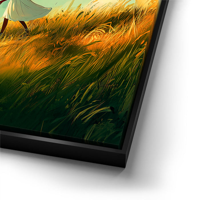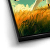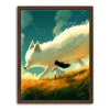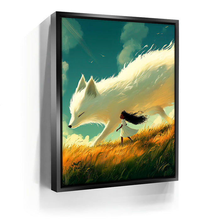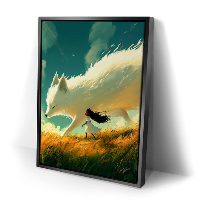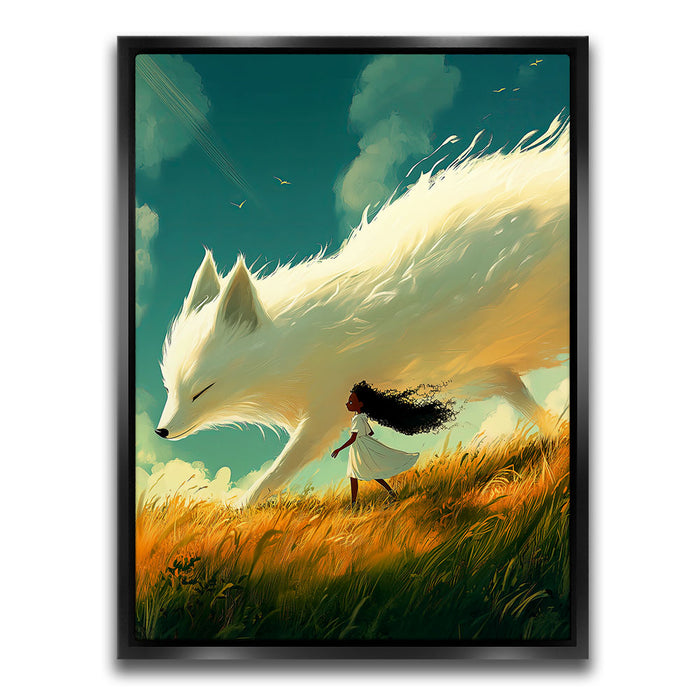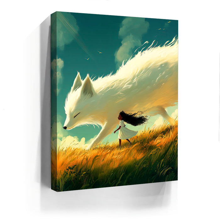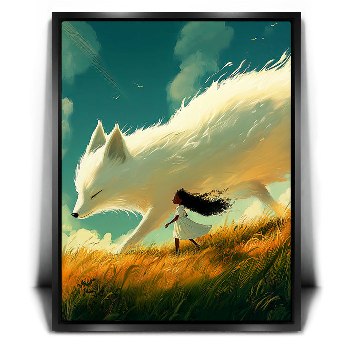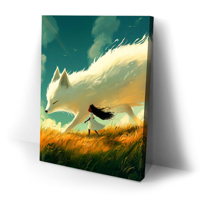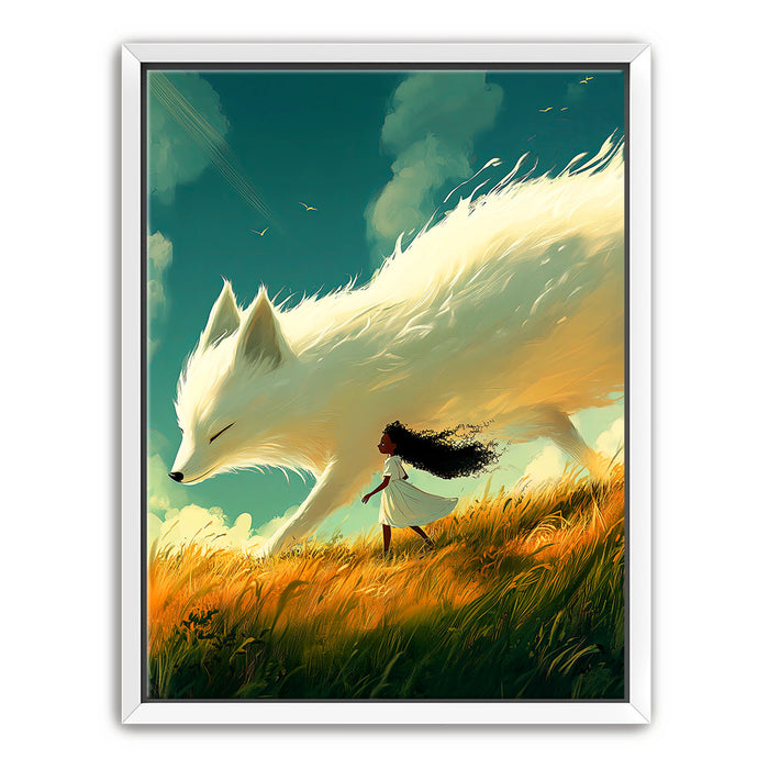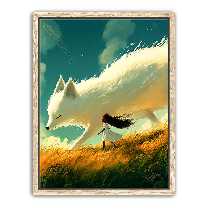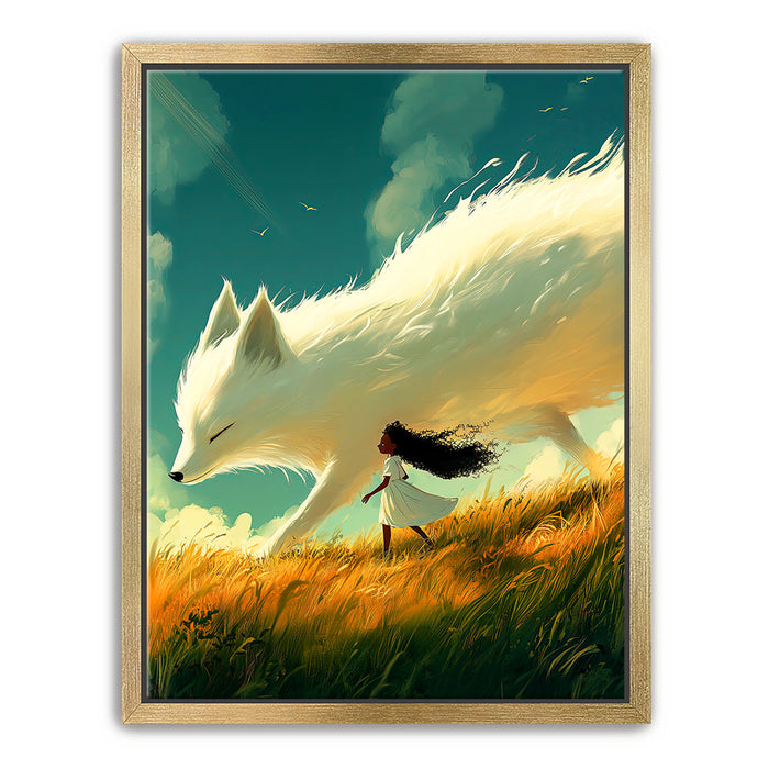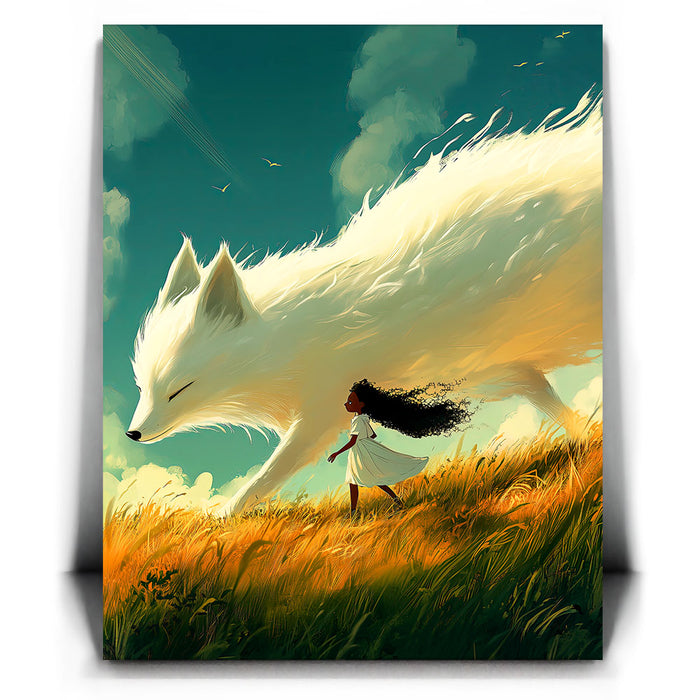 "Bound by Spirit" by Kandise King is a mesmerizing artwork that portrays the mystical connection between a young girl and a majestic, ethereal fox. Set against a serene, sunlit field and a vivid sky, this piece exudes a sense of wonder, harmony, and the profound bond between nature and spirit. The luminous fox and flowing composition create a dreamlike atmosphere that captivates viewers.