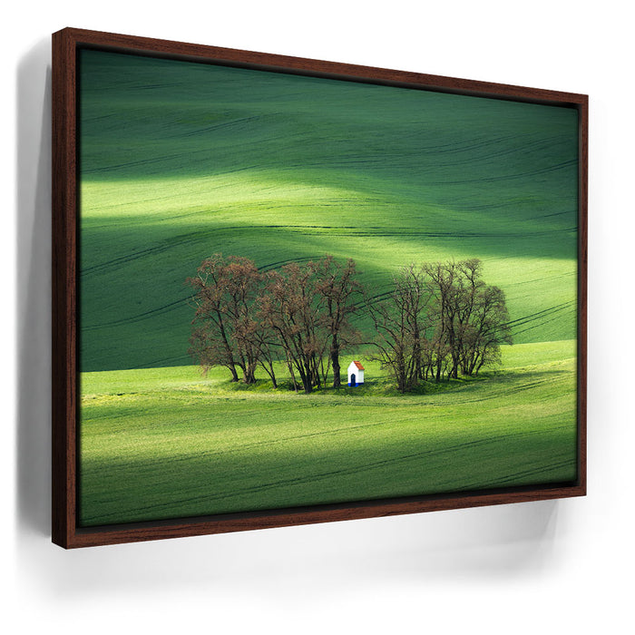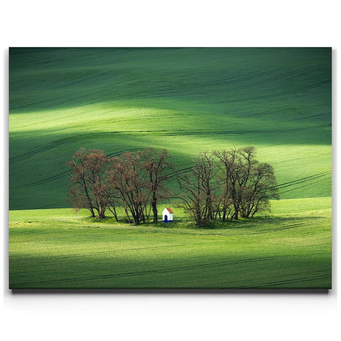 "Brushstrokes of Spring" by Marcin Zajac presents a dreamlike countryside scene where light dances across rolling green fields. A cluster of bare trees and a tiny white chapel with a red roof stand in quiet contrast, evoking peace, simplicity, and rural charm.
