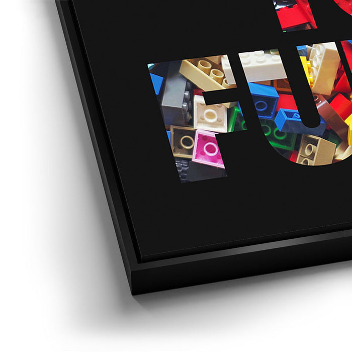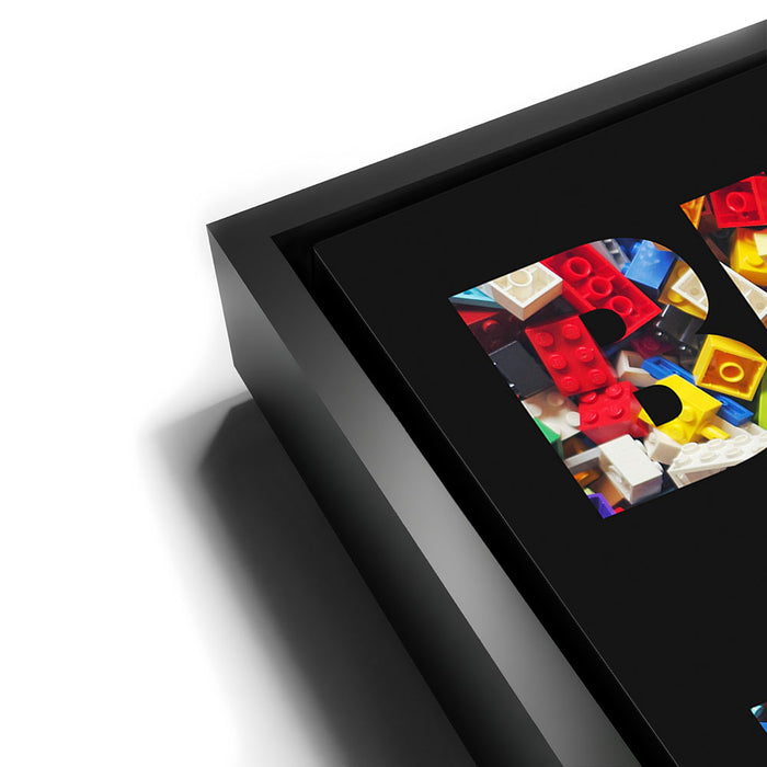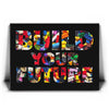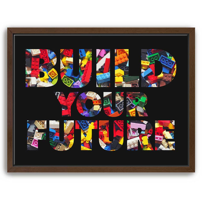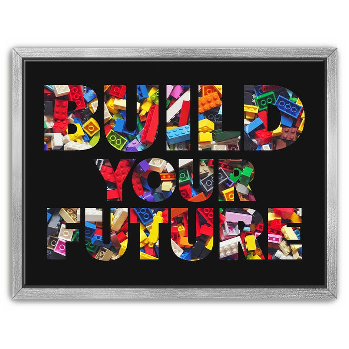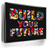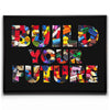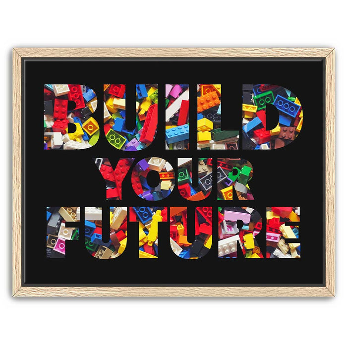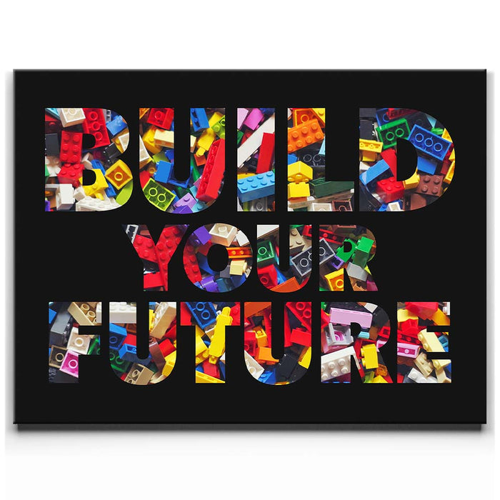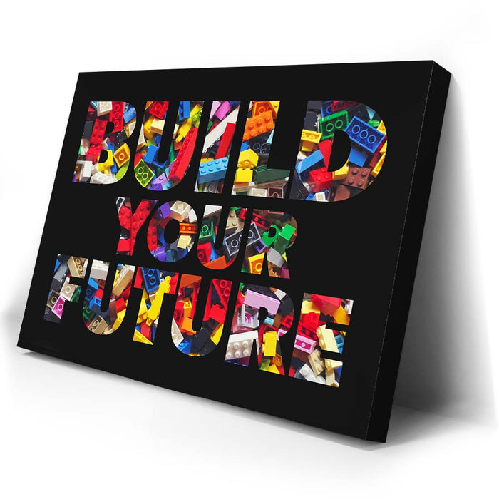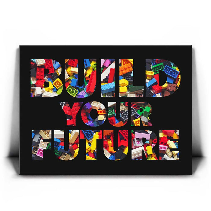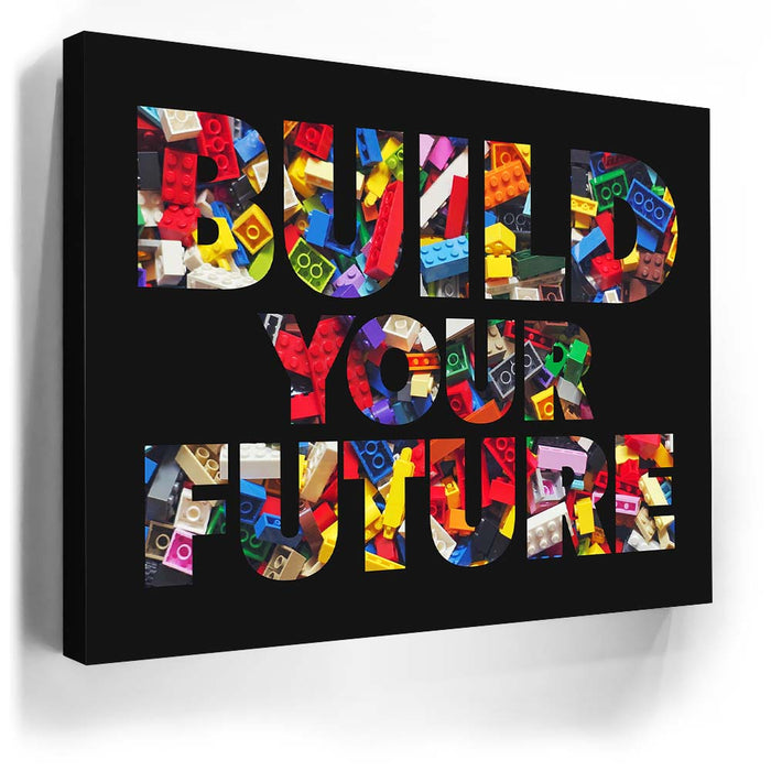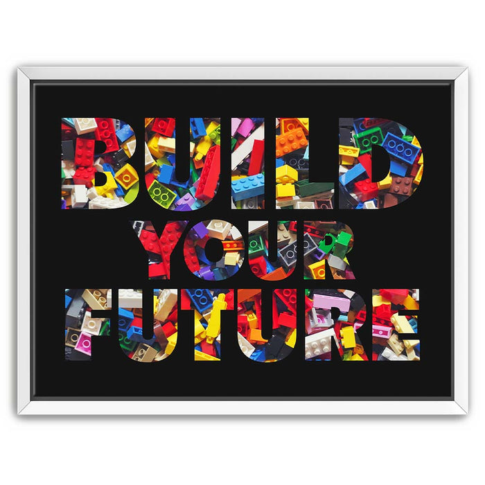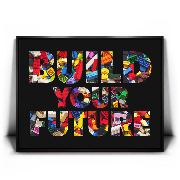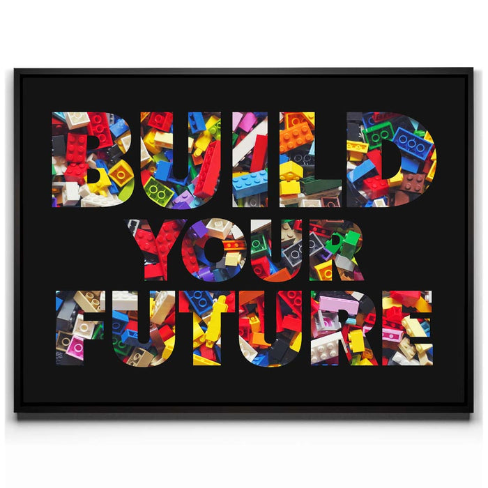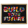 This vibrant artwork titled "Build Your Future - Black" combines the power of words with the energy of color. The bold typography of the phrase "Build Your Future" is filled with colorful building blocks, symbolizing creativity, potential, and the power of imagination. The black background provides a striking contrast, making the words pop and emphasizing the message of motivation and positivity.