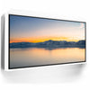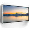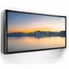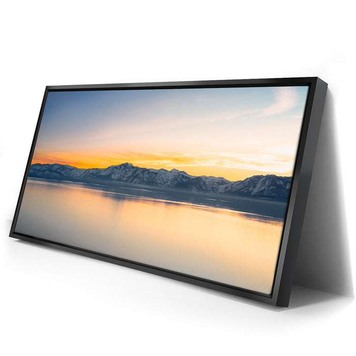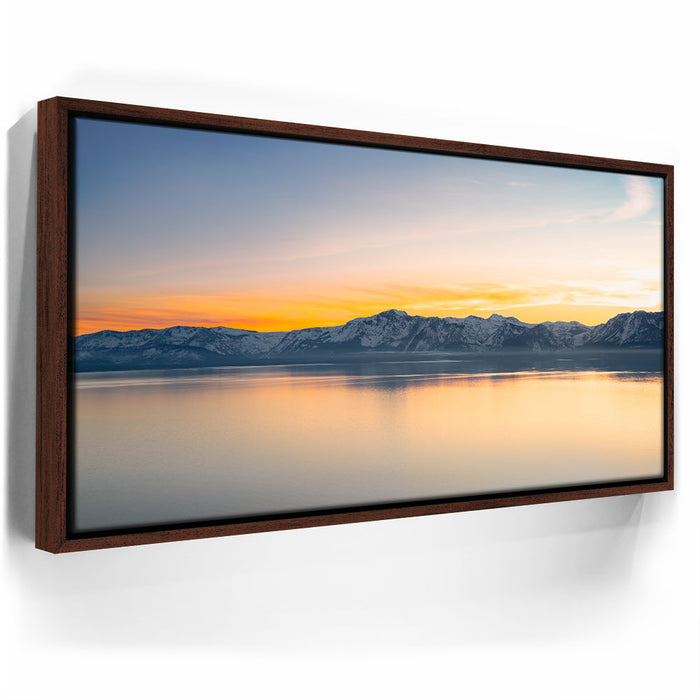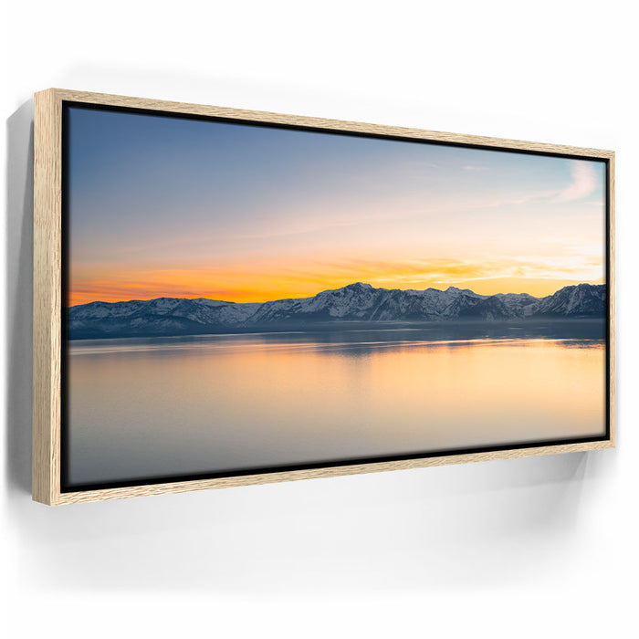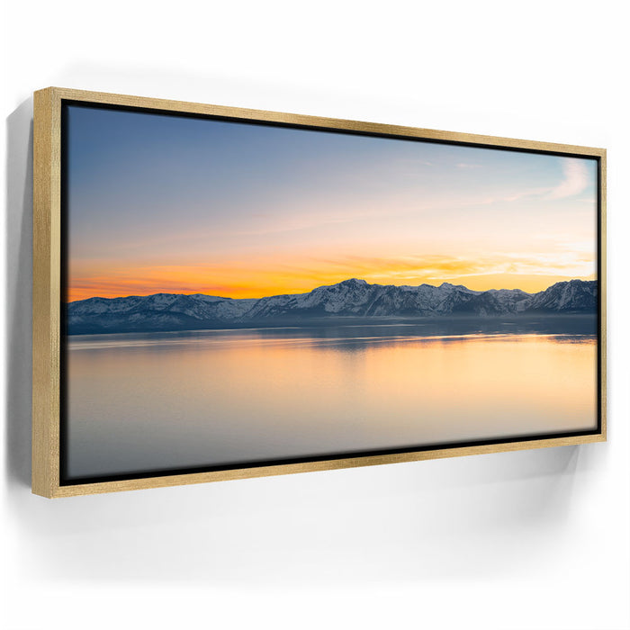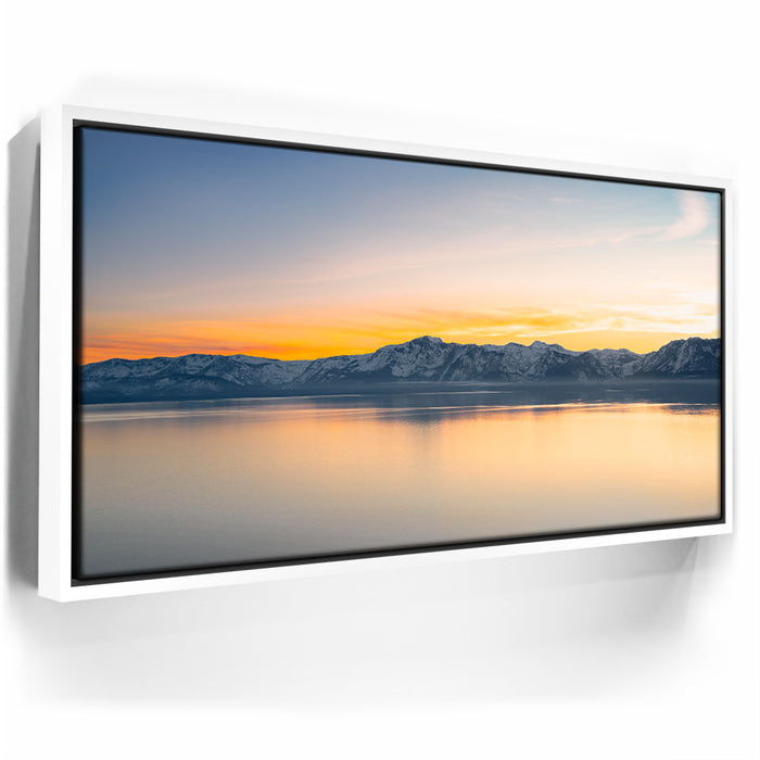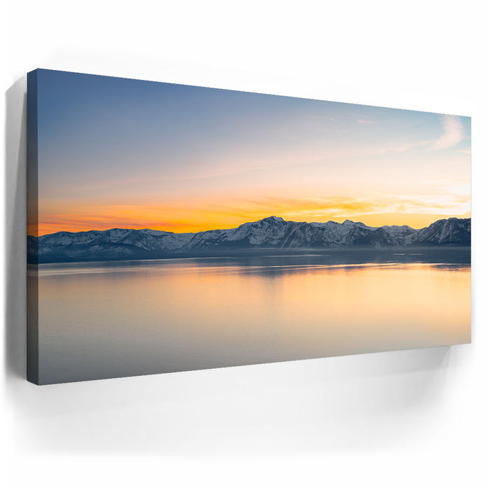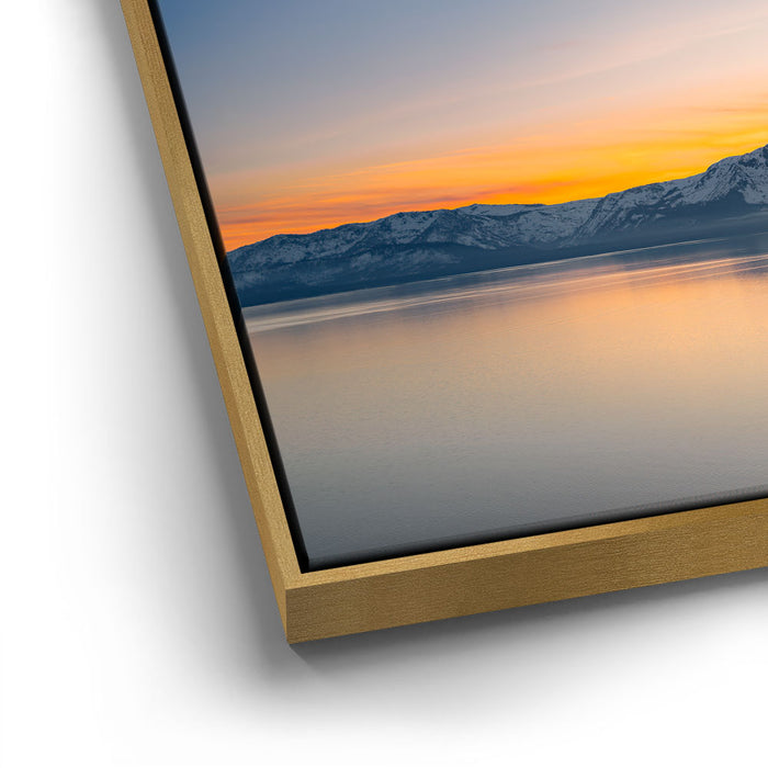 “Calm on the Western Front - Lake Tahoe” by Daniel Heck captures the serene beauty of a Tahoe sunset with golden light reflecting softly across the still waters. Snow-dusted Sierra Nevada mountains rise in the distance, their silhouettes blending with the glowing horizon to create a peaceful and timeless landscape.