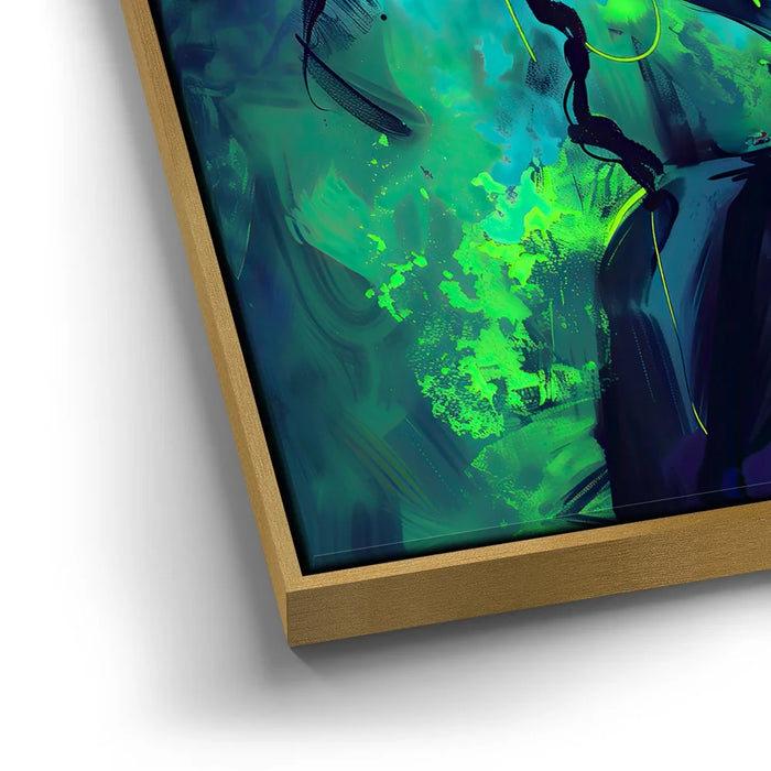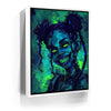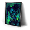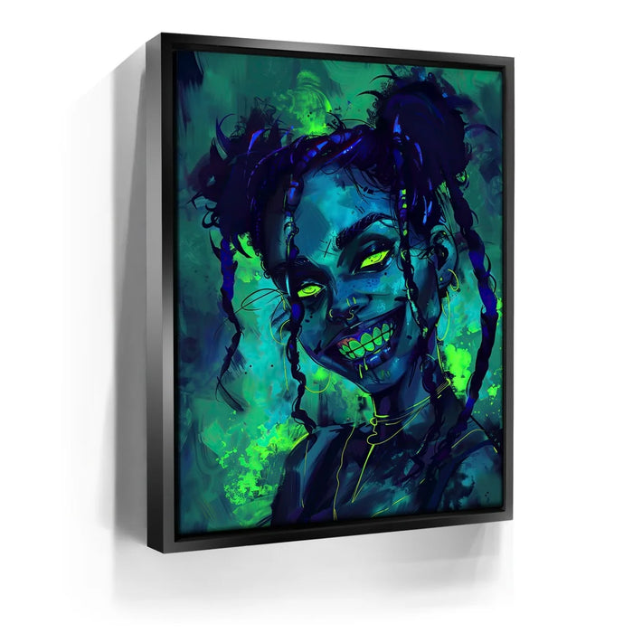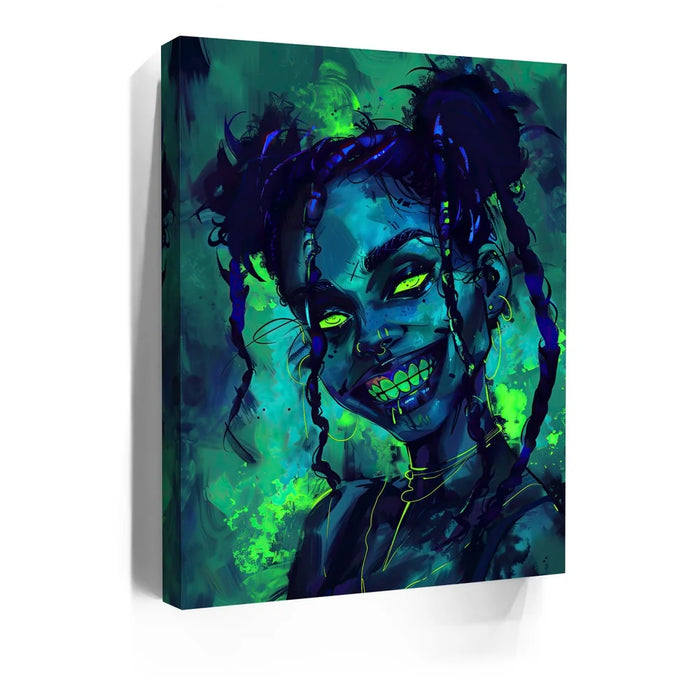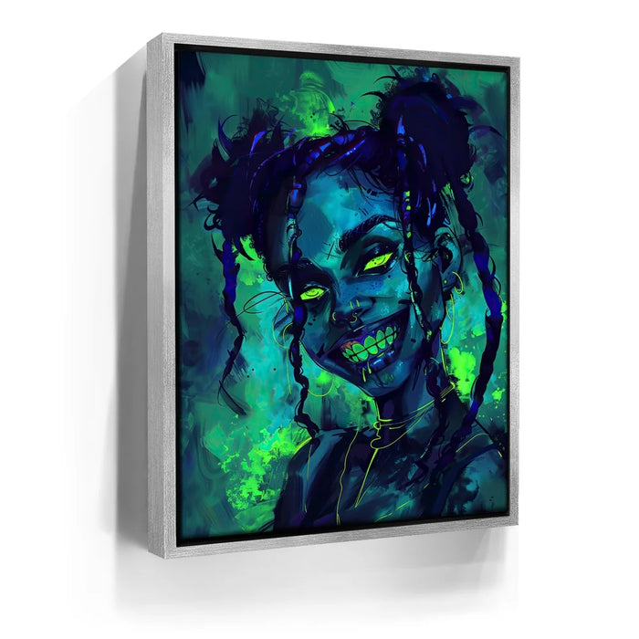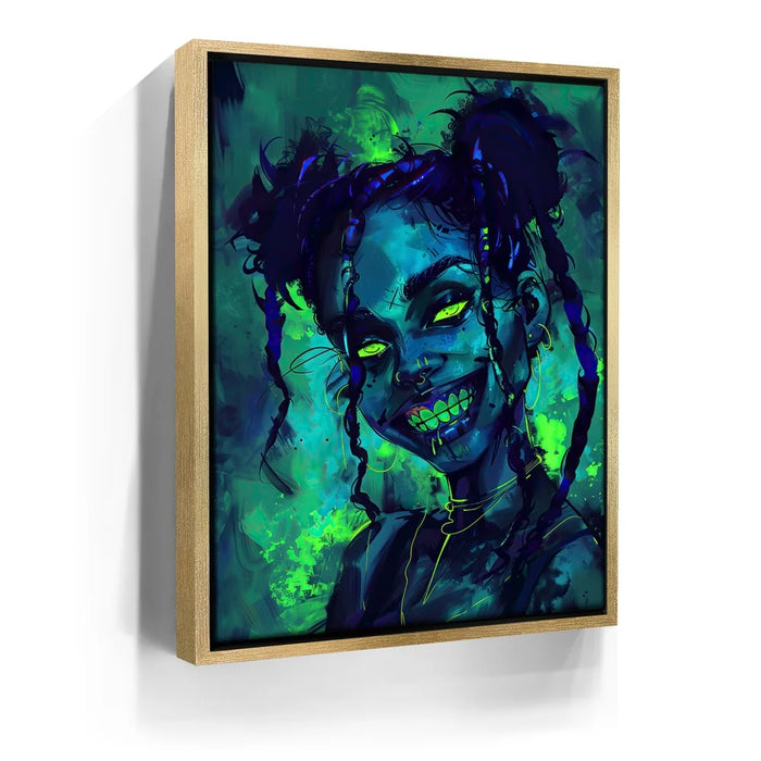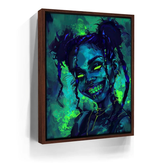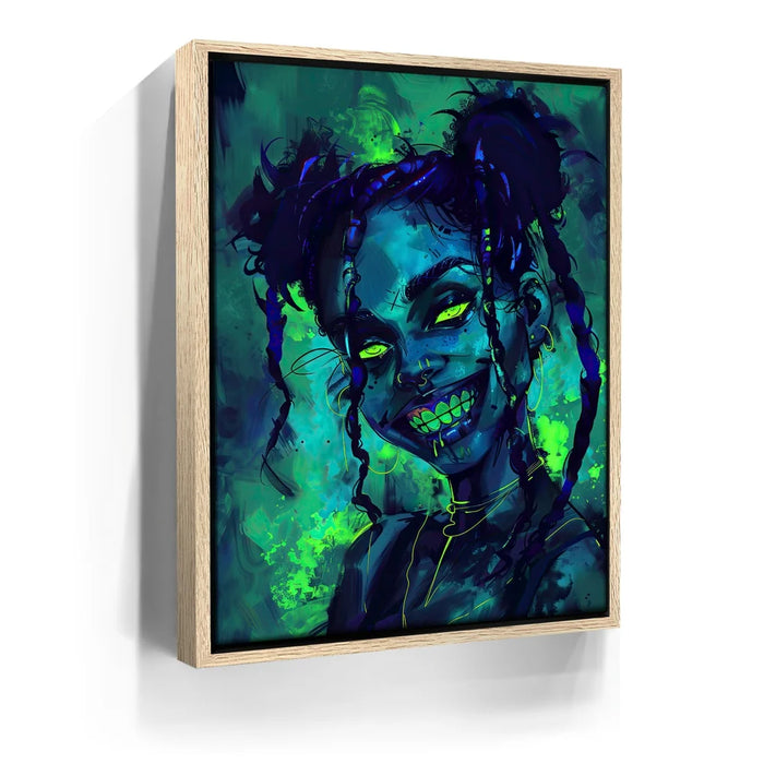 "Calypso" by Kandise King is an electrifying artwork that merges vibrant neon tones with an otherworldly character. With piercing green eyes and a mischievous grin, the subject exudes an intense, chaotic energy, evoking themes of rebellion and supernatural allure. The dynamic brushstrokes and glowing accents create a surreal and captivating composition.