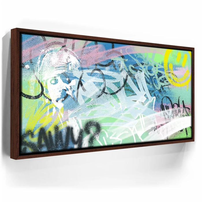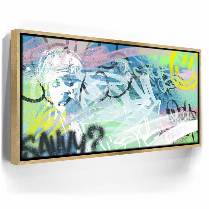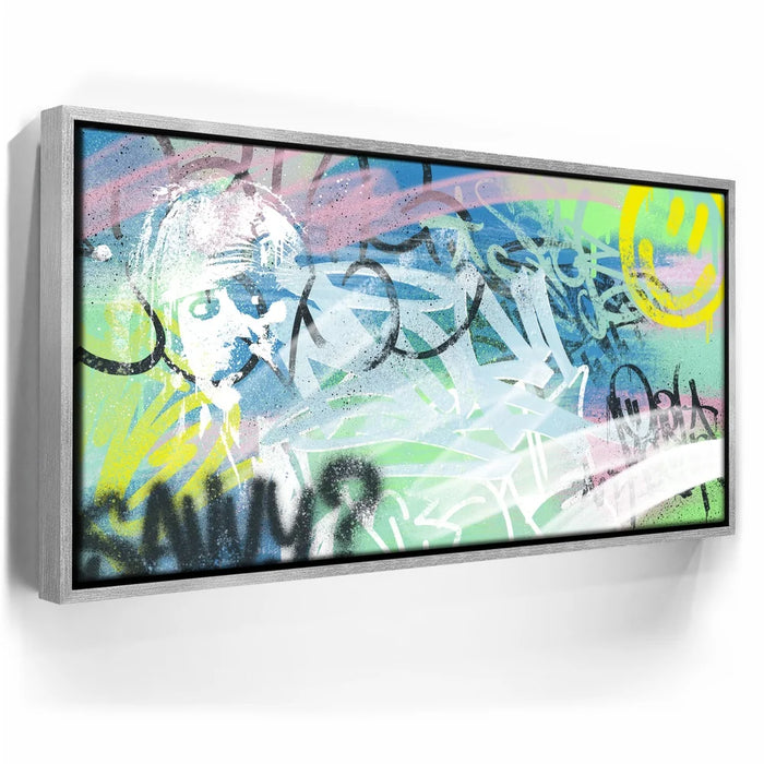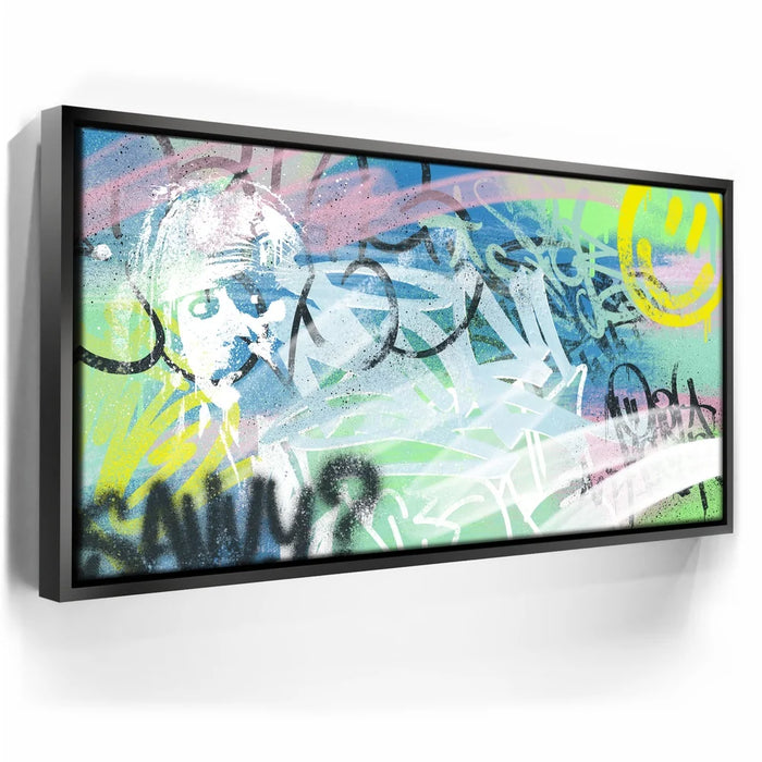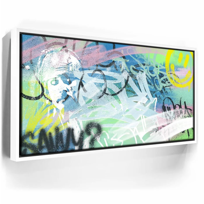 This piece thrashes with layered chaos—spray-painted scribbles, tags, and streaks clashing in every direction. Buried beneath the storm, the ghostly face of Captain Jack emerges, his hollow eyes peering through the graffiti like a phantom caught between worlds. The messy overlay of colors feels intentional, as if his very identity is being rewritten by the streets, by the hands of those who paint over what came before.