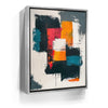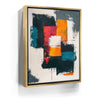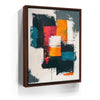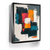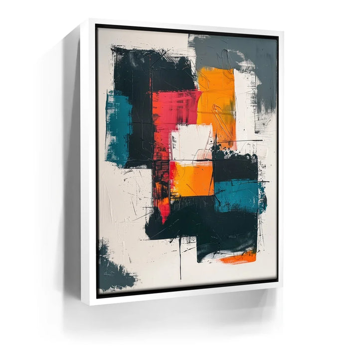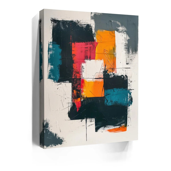 "Cascade," a colorful abstract artwork by Arend Pryor, showcases a dynamic arrangement of shapes and colors. The piece features bold blocks of red, yellow, teal, and black, interspersed with white, creating a striking contrast that draws the viewer's eye.