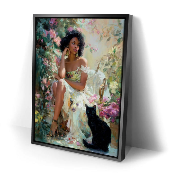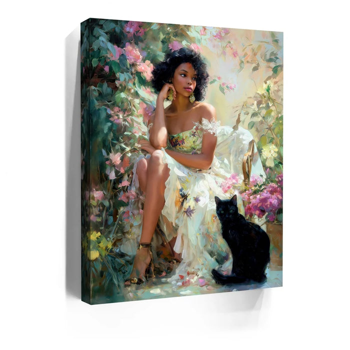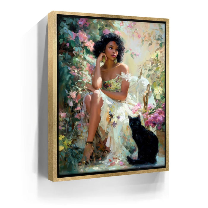 “Cat In The Blossom Hour” by Kandise King is a tender portrait that captures serenity, grace, and quiet magic. A young woman sits among blooming petals, her floral dress blending seamlessly with the lush garden around her. Beside her, a sleek black cat gazes forward — a symbol of mystery and intuition. The sunlight filters softly through the blossoms, painting her skin in warm, romantic tones that evoke timeless beauty.
