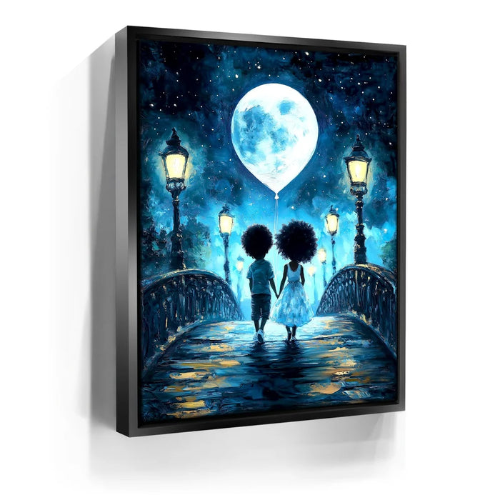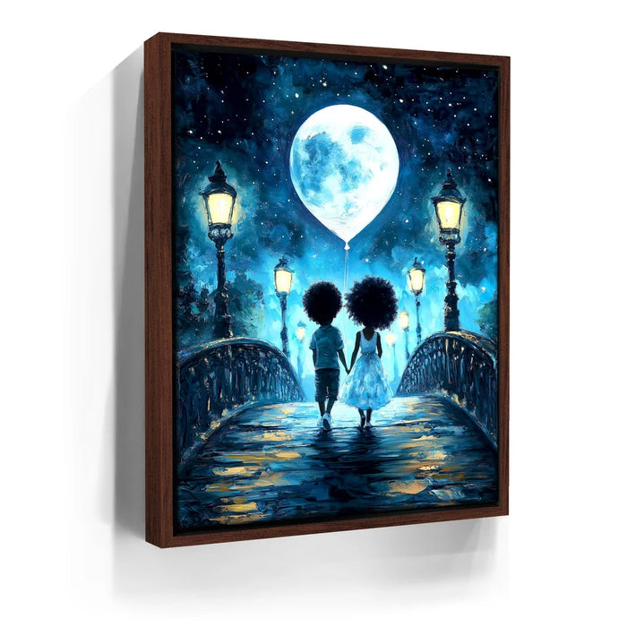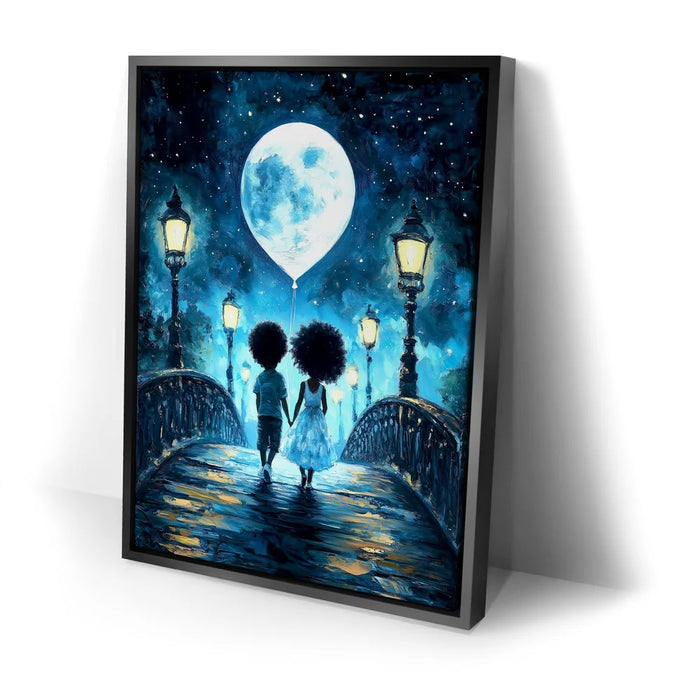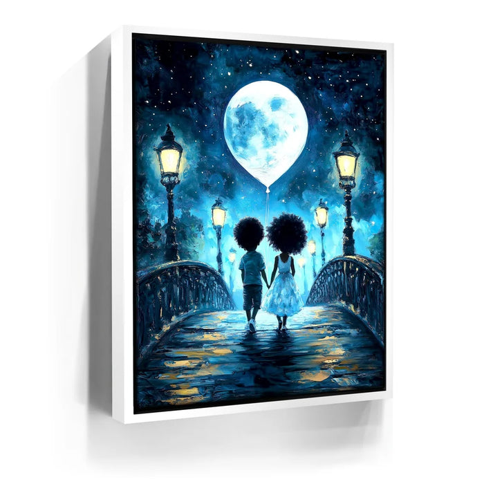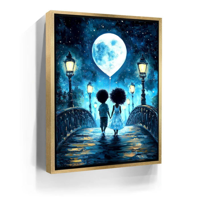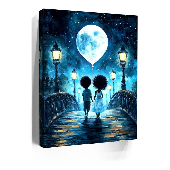 "Celestial Stroll" by Kandise King is a breathtaking journey into a dreamlike world where childhood innocence meets cosmic wonder. This artwork features two children walking hand in hand across a bridge, illuminated by glowing streetlamps under a star-filled sky. A striking element is the moon, reimagined as a balloon, symbolizing boundless imagination and the magic of exploration.