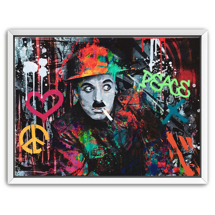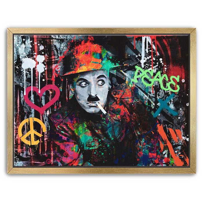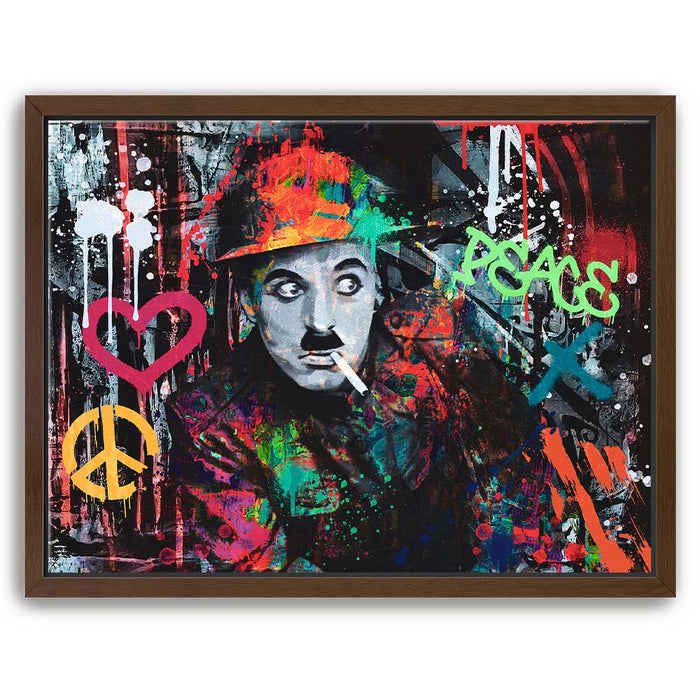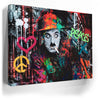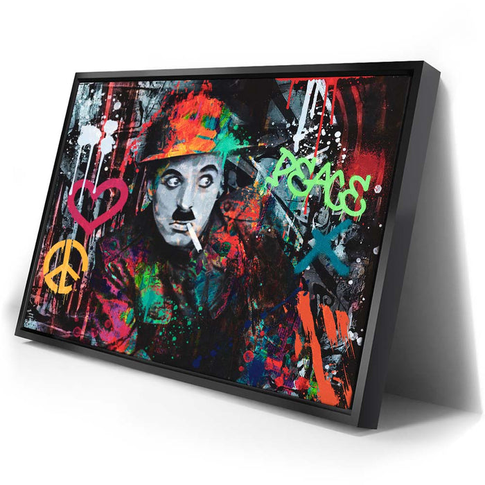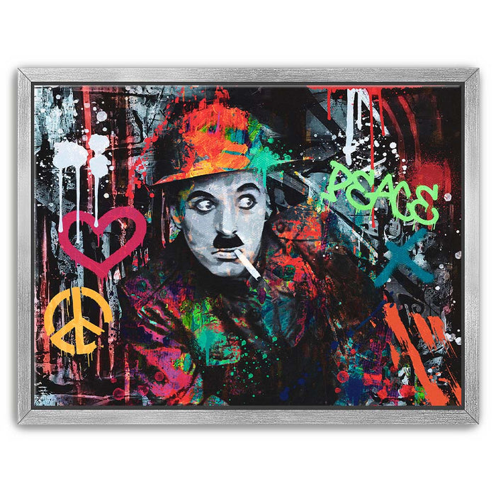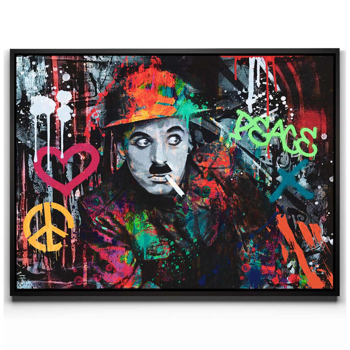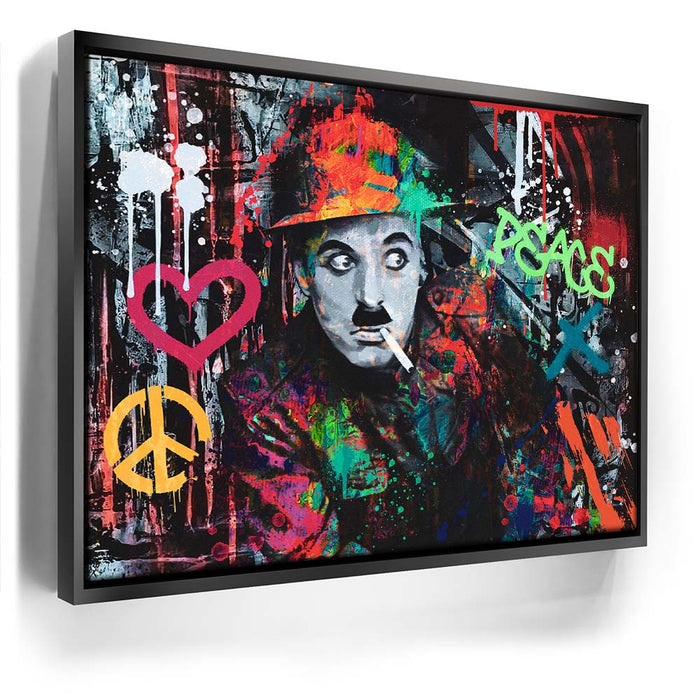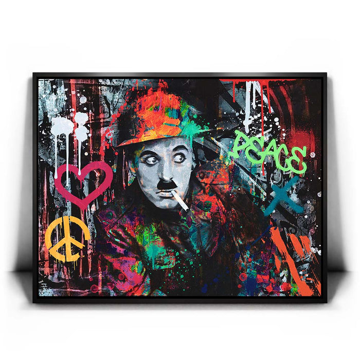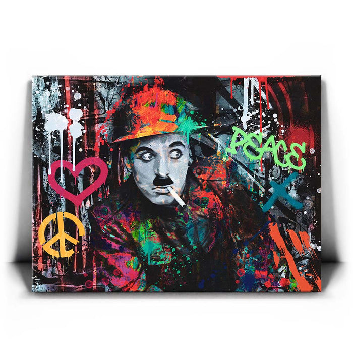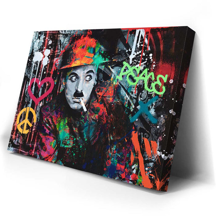 Perfect for those who appreciate the fusion of classic cinema and street art, this landscape-oriented piece enhances any space, from home theaters to creative studios. Celebrate the legacy of Charlie Chaplin with this dynamic and expressive artwork that embodies both humor and artistic innovation.