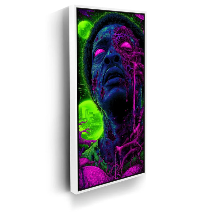 With its bold contrast, graphic depth, and cosmic edge, this piece showcases a powerful fusion of Black futurism, horror aesthetics, and psychedelic art. Every detail reinforces the theme of mutation and resilience, making the artwork both haunting and mesmerizing.
