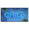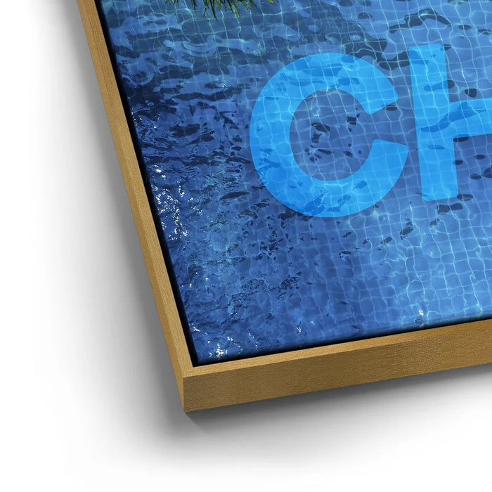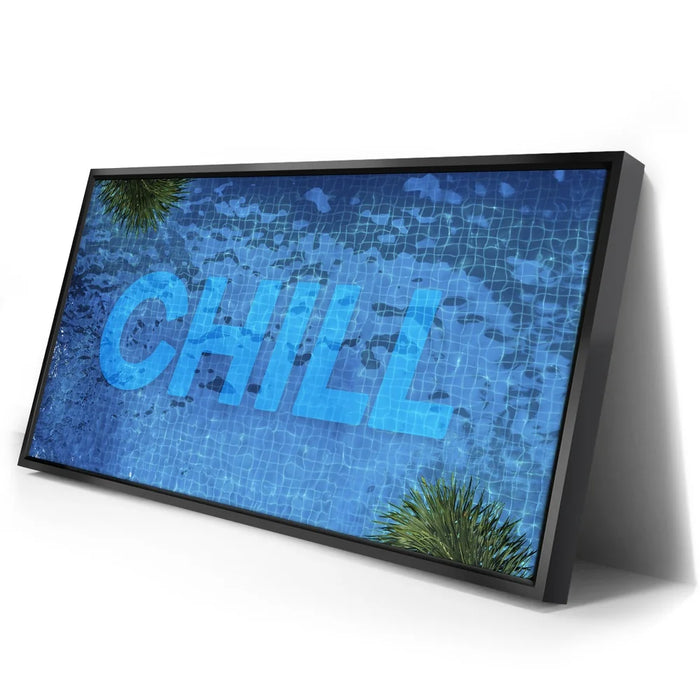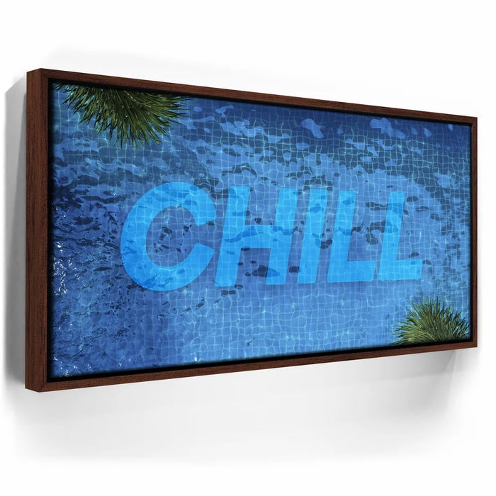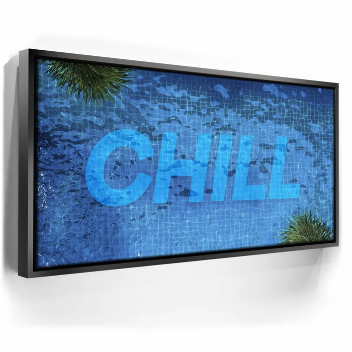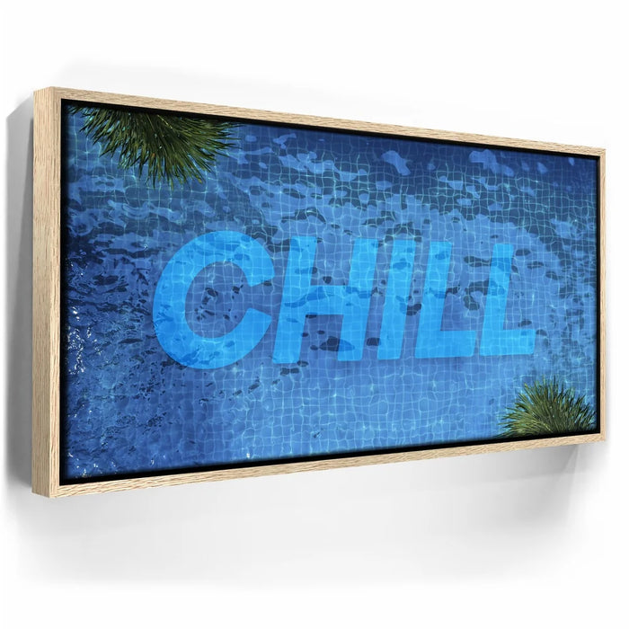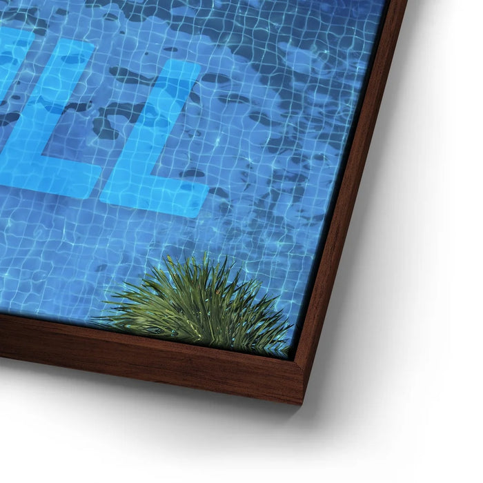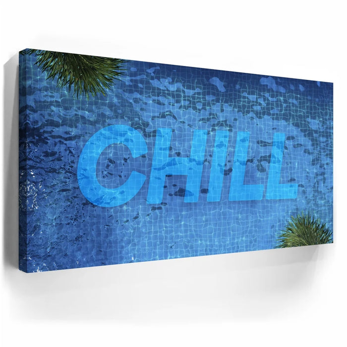 This refreshing artwork, titled "Chill," perfectly captures the essence of summertime relaxation. The word "CHILL" is subtly integrated into the cool, light blue water of a swimming pool, evoking a sense of calm and tranquility. Surrounded by lush palm trees, this piece brings to mind lazy summer days spent by the pool, soaking up the sun.