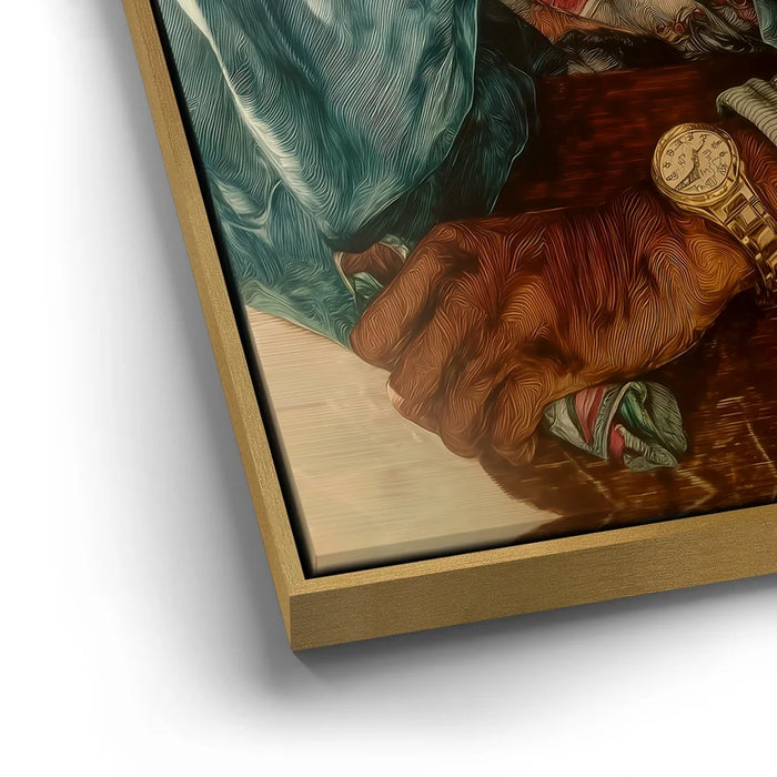 “Chillonomics 101” by Kandise King is a whole mood—effortlessly cool, unbothered, and dripping with retro flair. The artwork blends warm, textured tones with vintage-inspired style: mirrored glasses, a patterned cap, a silky jacket, and that classic slouched pose that says I’ve got time, but don’t waste it. Every detail adds to the vibe, from the gold watch to the relaxed expression that anchors the entire composition.
