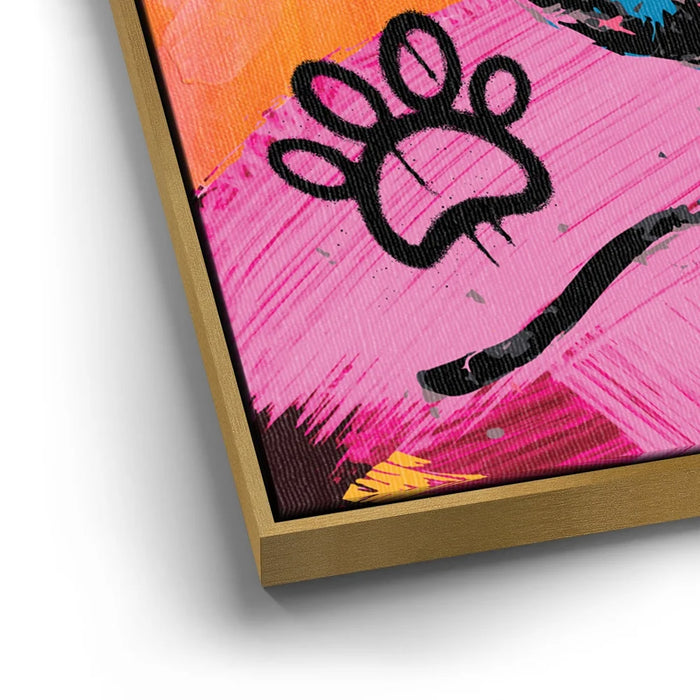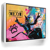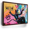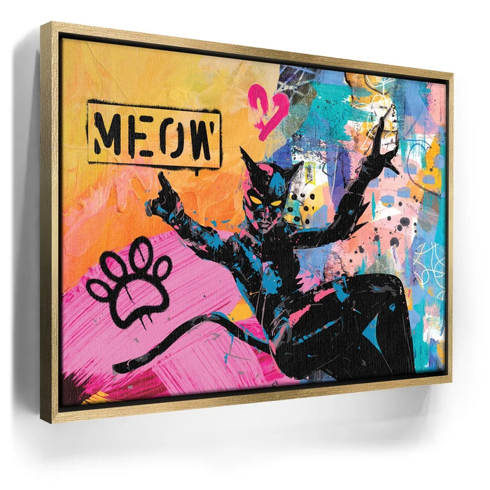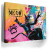 The layered backdrop of paw prints, spray-painted hearts, and bold “MEOW” graffiti tag adds a mischievous wink to the piece. It’s equal parts fierce and fun—a celebration of confidence, femininity, and unapologetic self-expression. The result is an artwork that feels alive, as if the character herself might leap off the canvas and into the street, claws at the ready, daring the world to play by her rules.