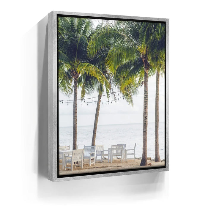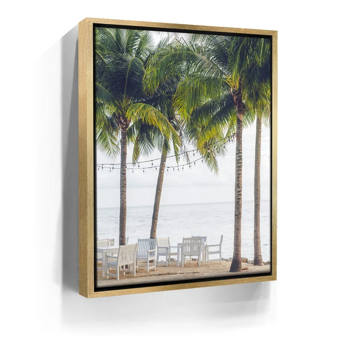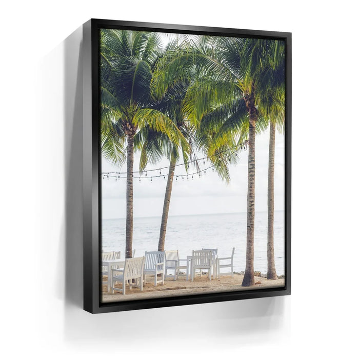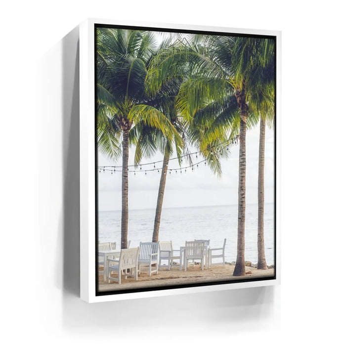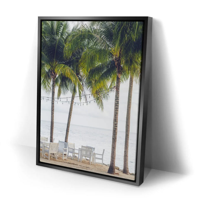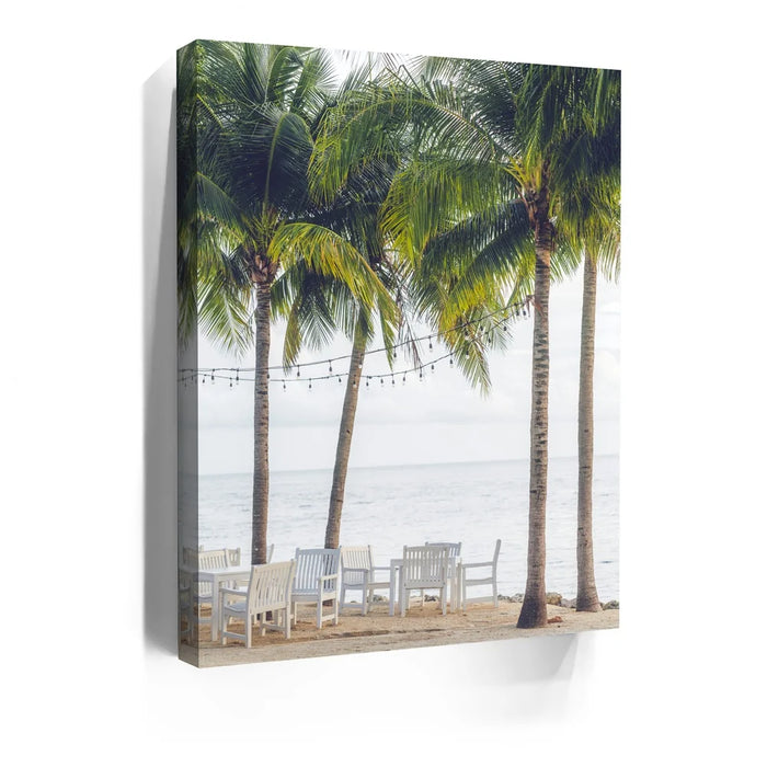 In Coastal Calm, Barbarossa paints a serene vision of seaside tranquility where swaying palms frame a quiet shoreline retreat. The soft haze of ocean mist blends seamlessly with pale sands and sunlit greens, evoking the rhythm of gentle tides and slow, unhurried moments. Empty chairs wait beneath string lights, hinting at laughter shared or peace found in solitude. This piece captures the soul of coastal living — simple, soothing, and timelessly peaceful.