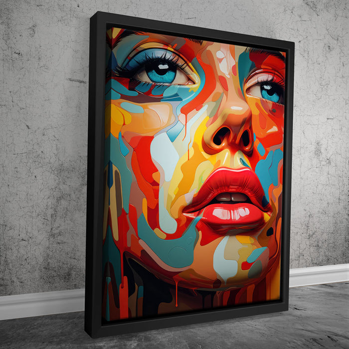 "Colorful You" is a striking portrait of a beautiful woman featuring vibrant colors and dynamic paint splatter. This abstract wall art captures the essence of beauty through bold color splashes, from the woman's red lips to her piercing blue eyes. The use of colorful abstract techniques brings the portrait to life, offering a modern twist on traditional self-portrait styles.