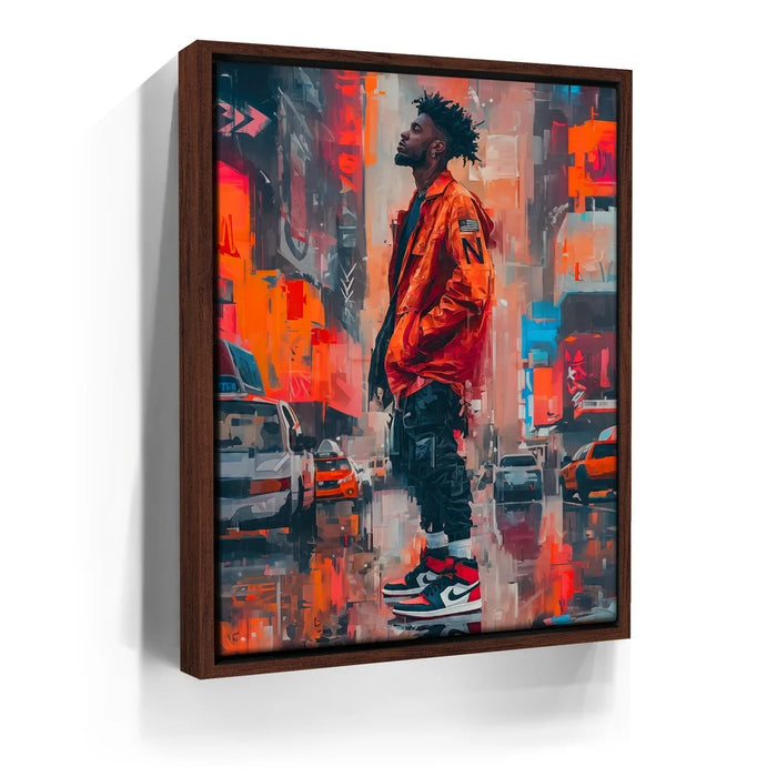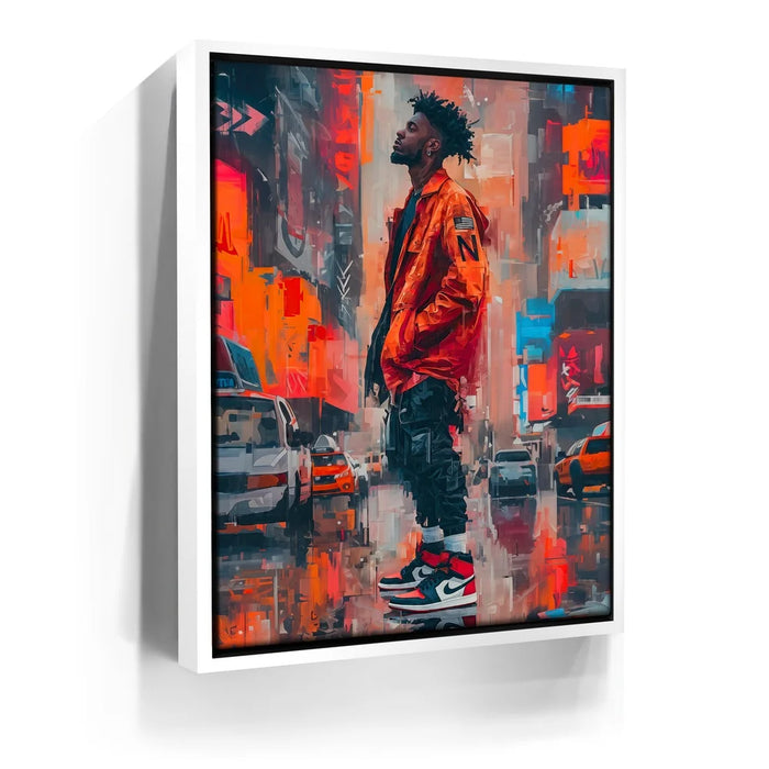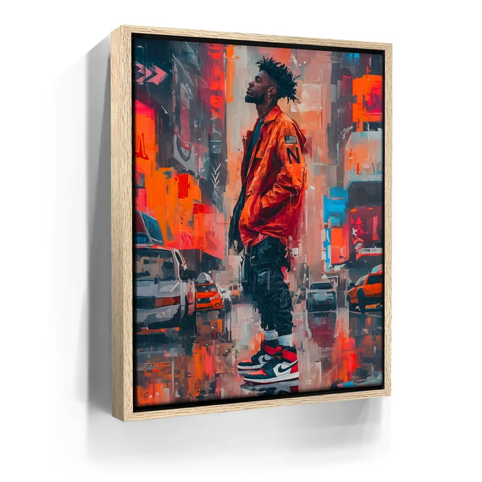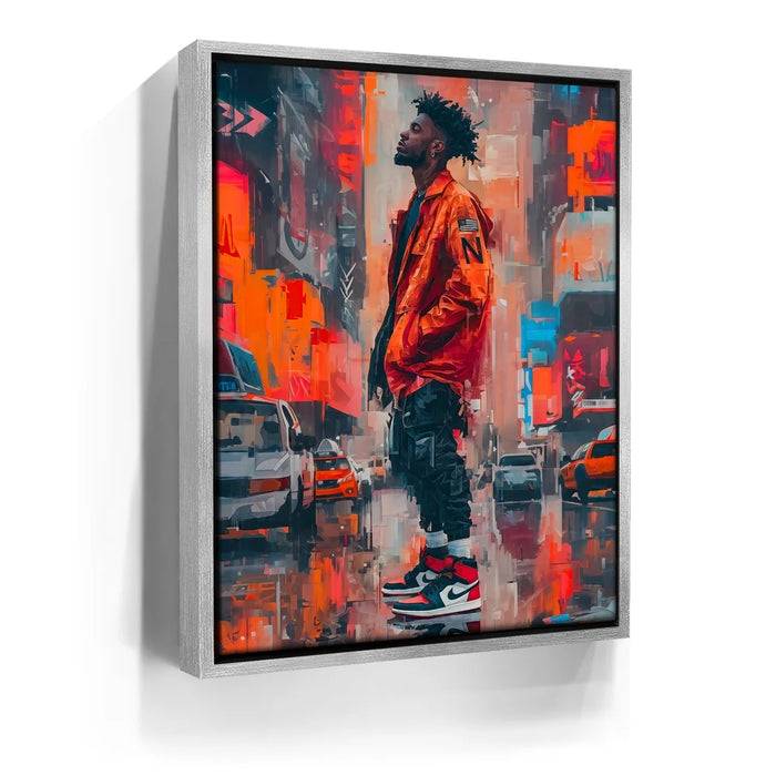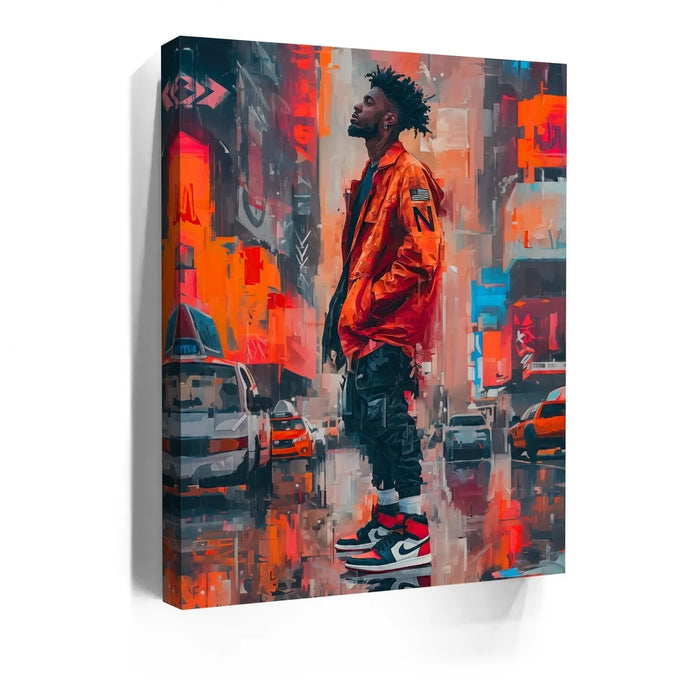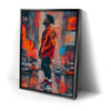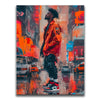 “Colorwalk” by Kandise King is a striking urban portrait that blends contemporary street style with the energy of the city. The figure, dressed in a vivid orange jacket and iconic sneakers, stands tall against a backdrop of neon lights, taxis, and rain-slicked reflections. The bold brushstrokes and saturated palette capture the rhythm of city life while emphasizing individuality and confidence.