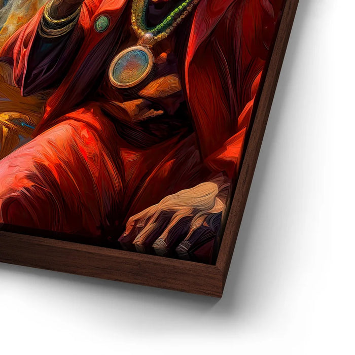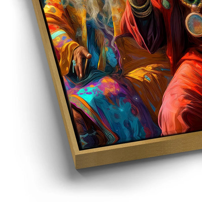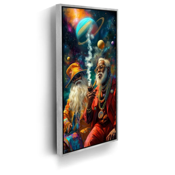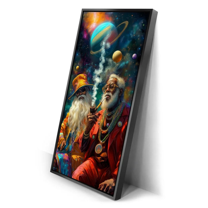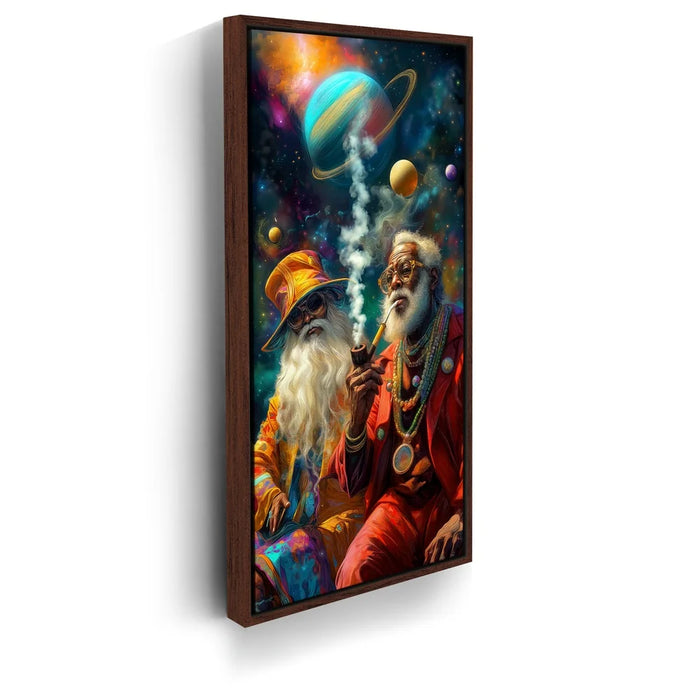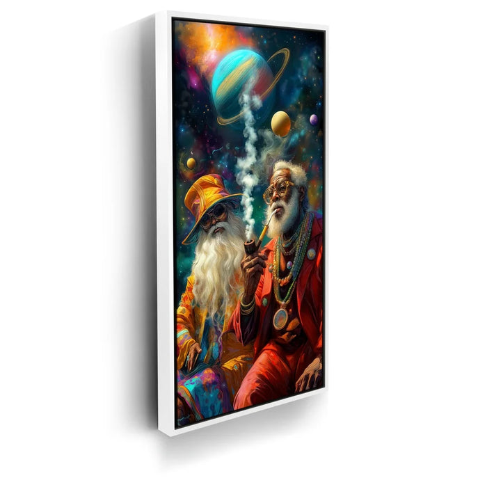 "Cosmic Journey Of The Wise" by Kandise King is a mesmerizing piece that blends surrealism with spirituality. Featuring two elder figures adorned in vibrant robes and jewelry, seated beneath a galaxy of swirling planets, the artwork captures both wisdom and wonder. Their pipes send smoke drifting into the cosmos, symbolizing knowledge, connection, and timeless reflection.