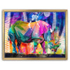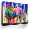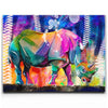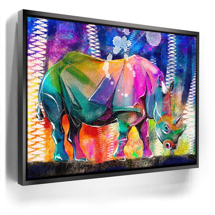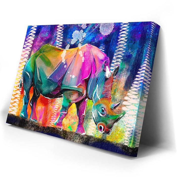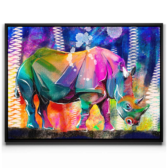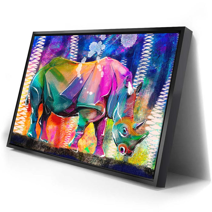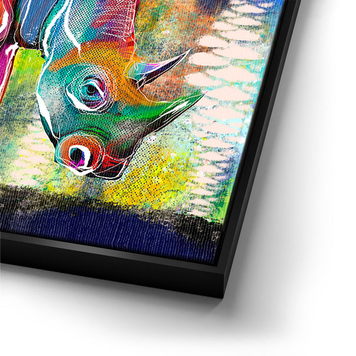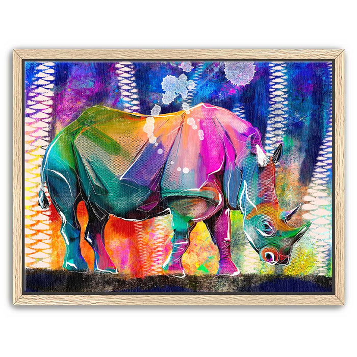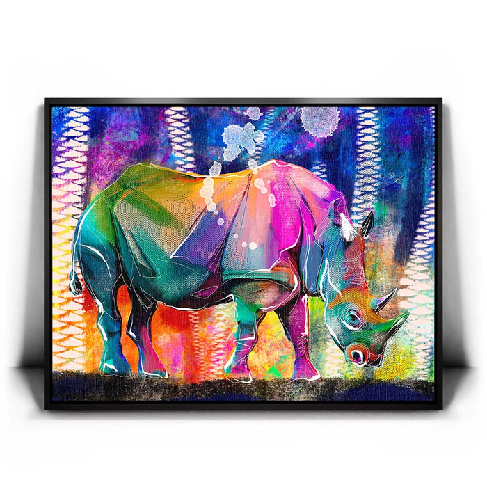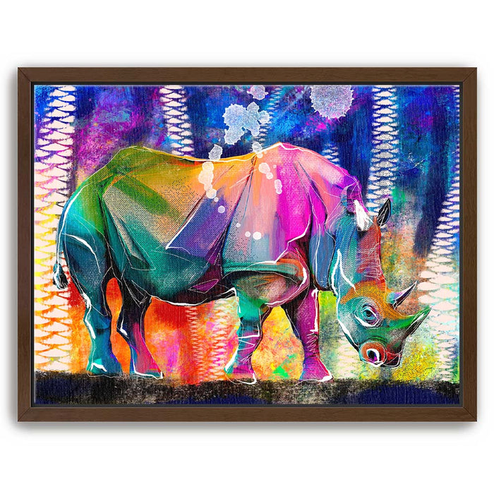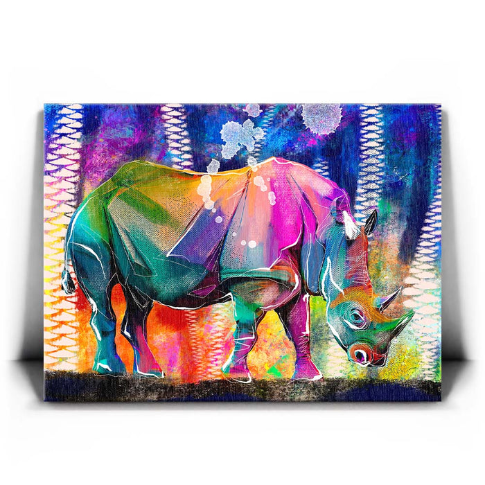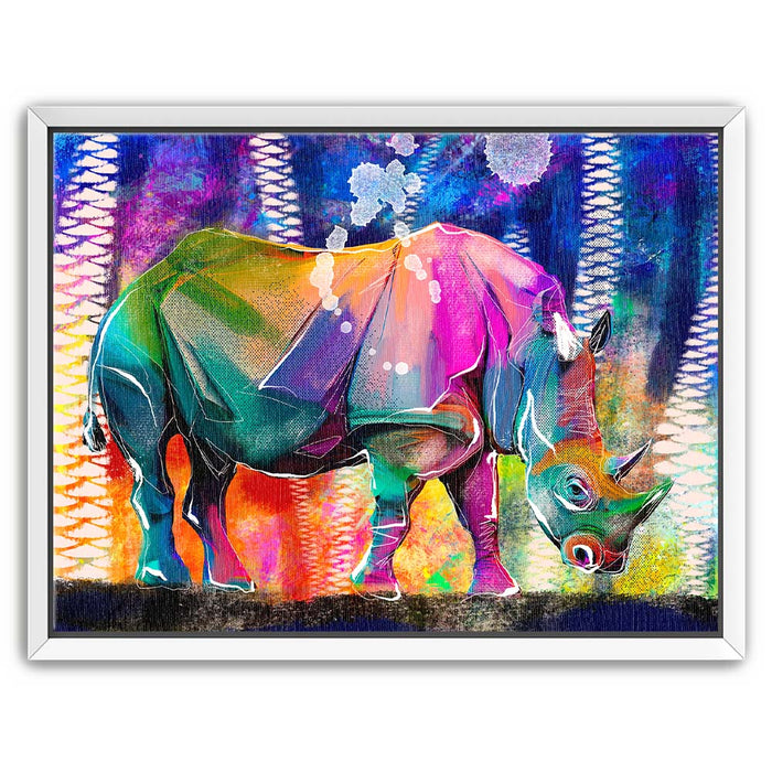 This vibrant artwork titled "Courage in Color" showcases a majestic Rhino rendered in a stunning array of colors, blending elements of abstract art with the natural beauty of wildlife. The rhino, an iconic symbol of strength and resilience among wild animals, is depicted in a bold, colorful palette that captures the viewer's attention.