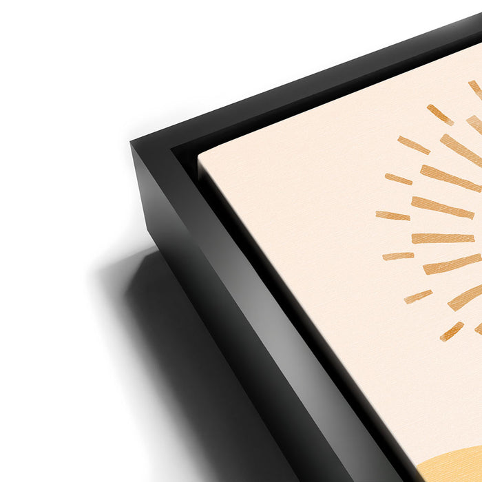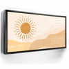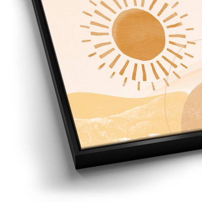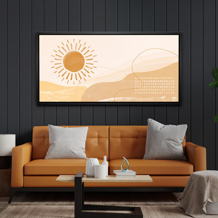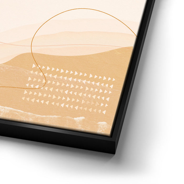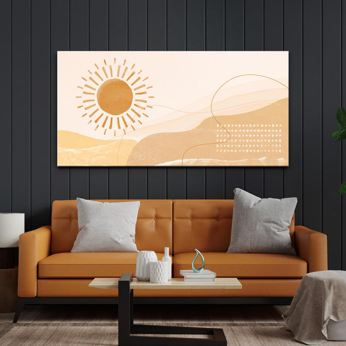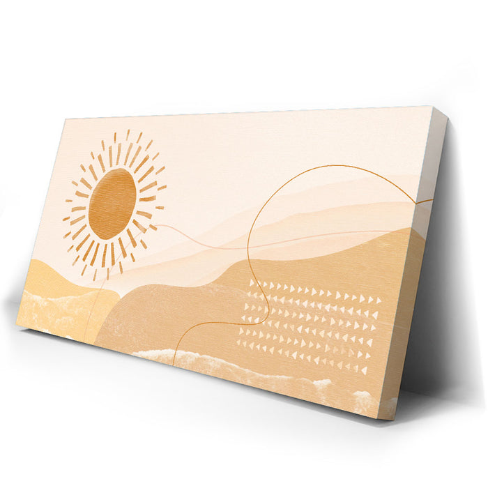 "Daybreak - Boho" is an abstract piece that captures the serene beauty of sunlight over mountain peaks. The artwork blends warm tones of sunrise and the earthy hues of mountain ranges, evoking a peaceful, bohemian vibe perfect for any modern home.