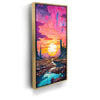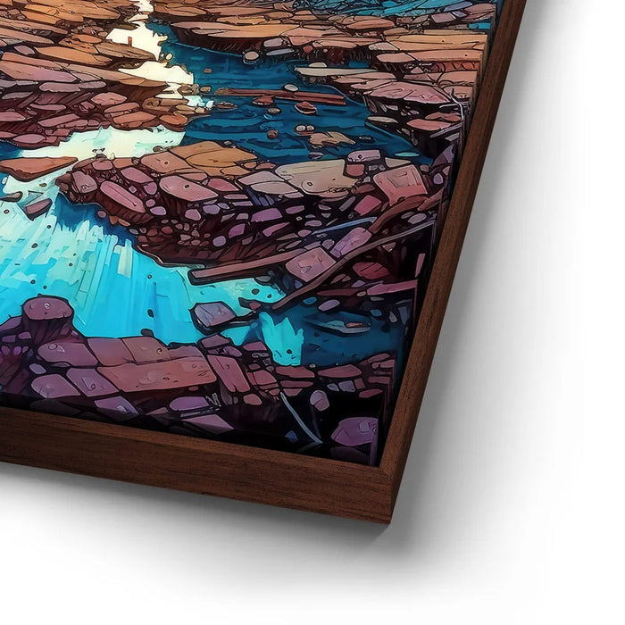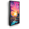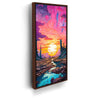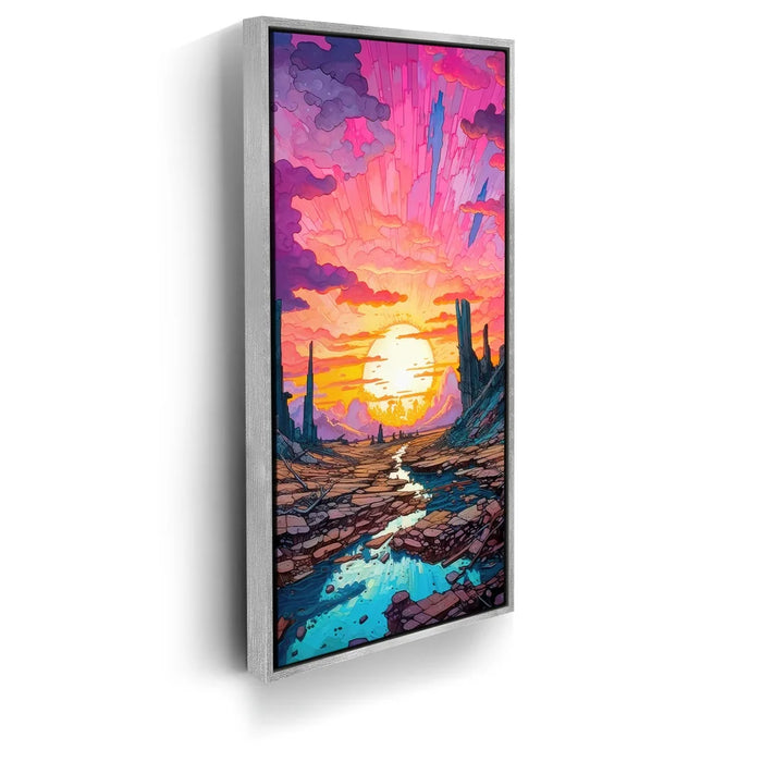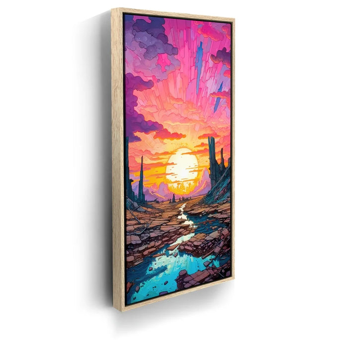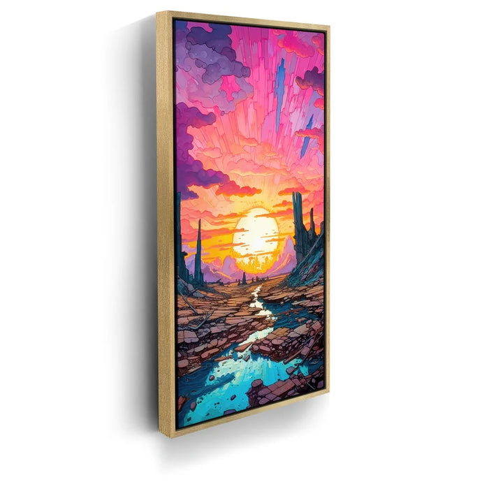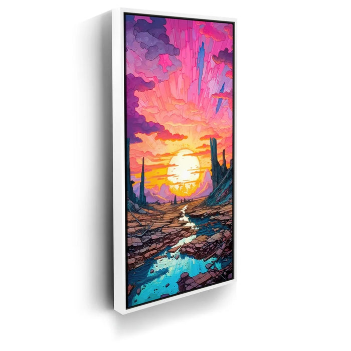 The artwork's striking use of bold colors—ranging from rich purples and pinks to fiery oranges and yellows—evokes a sense of wonder and tranquility. The scene, reminiscent of a fantastical desert, combines the beauty of nature with an otherworldly, abstract atmosphere, inviting viewers to explore a "Desert of Dreams."