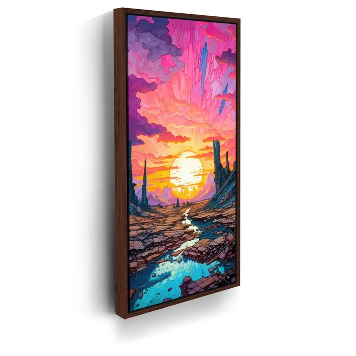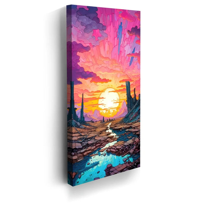 This vibrant, dream-like landscape features a stunning sunrise or sunset over a desert scene, with a dramatic sky illuminated by radiant colors. The towering mountains on either side of a winding river create an expansive valley, guiding the viewer's eyes toward the glowing sun in the center.
