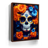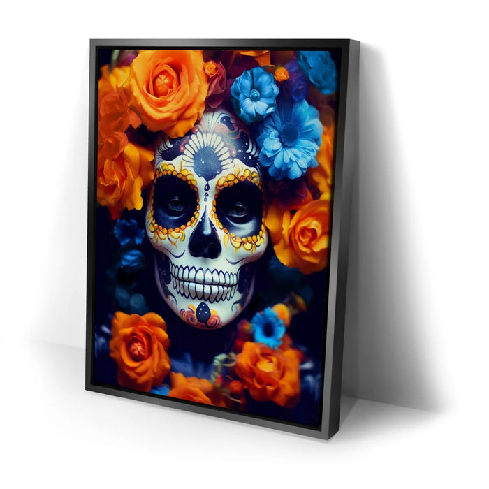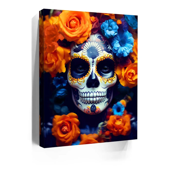 This striking portrait, titled "Dia De Los Muertos - Orange & Blue Flowers," captures the essence of the Day of the Dead celebration with vibrant, intricate face makeup surrounded by vivid orange and blue flowers. The detailed sugar skull design is complemented by the lush, colorful blooms, symbolizing the beauty of life and death. This artwork is perfect for those who appreciate the blend of tradition and modern art, making it a captivating piece for Halloween or any celebration of cultural heritage.