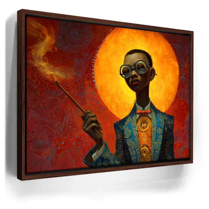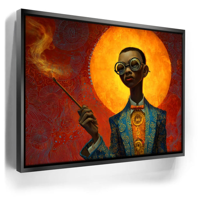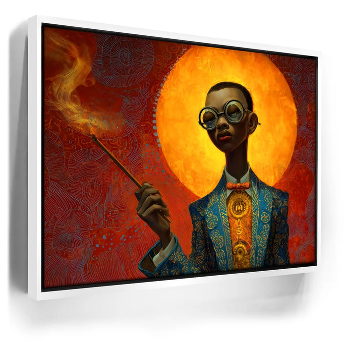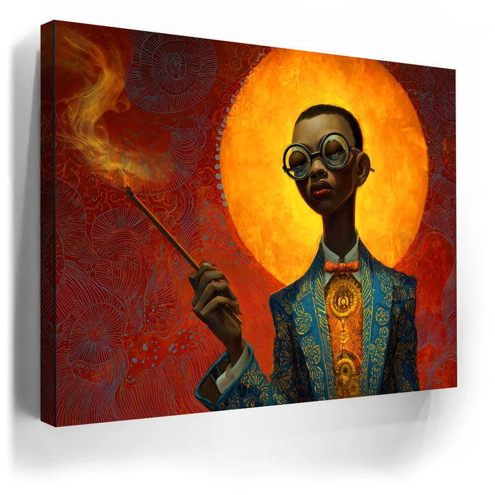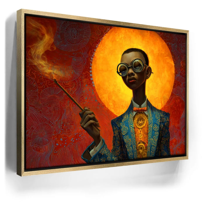 “Divine Curriculum” by Kandise King illuminates brilliance, youth, and sacred wisdom. A poised Black boy stands before a radiant golden halo, dressed in a royal blue suit etched with intricate patterns and a glowing orange tie. His expression is calm yet knowing, holding a slender wand that seems to channel light and learning from a higher source.