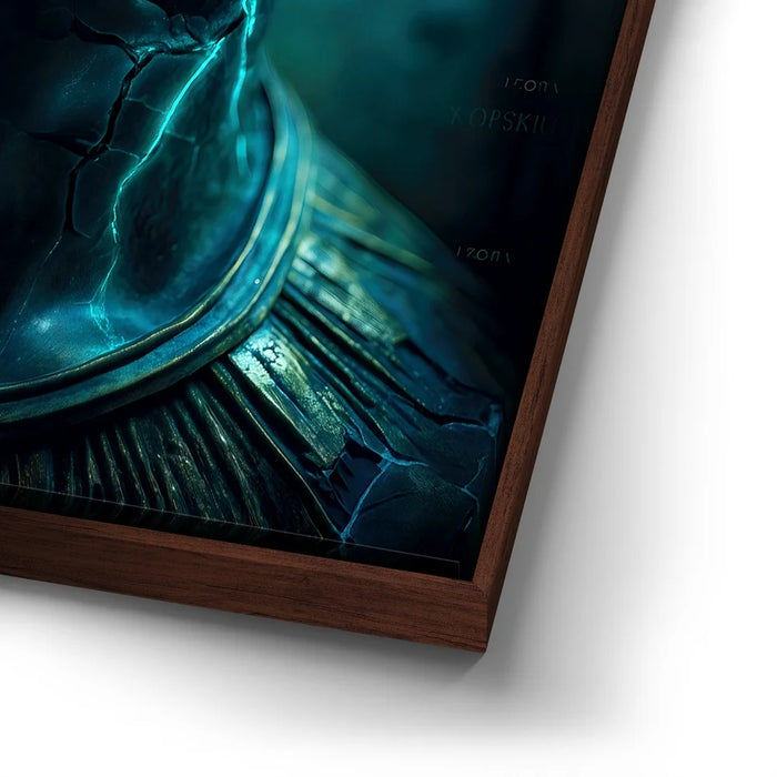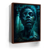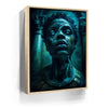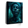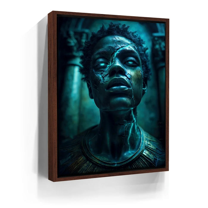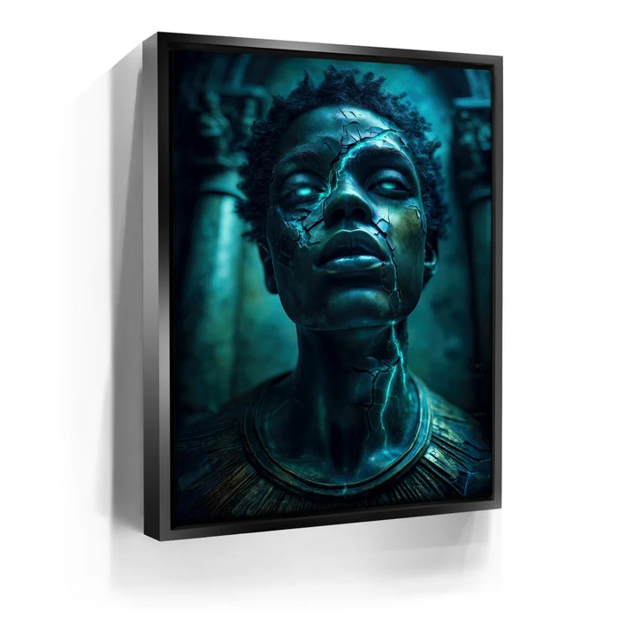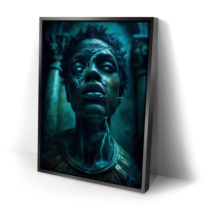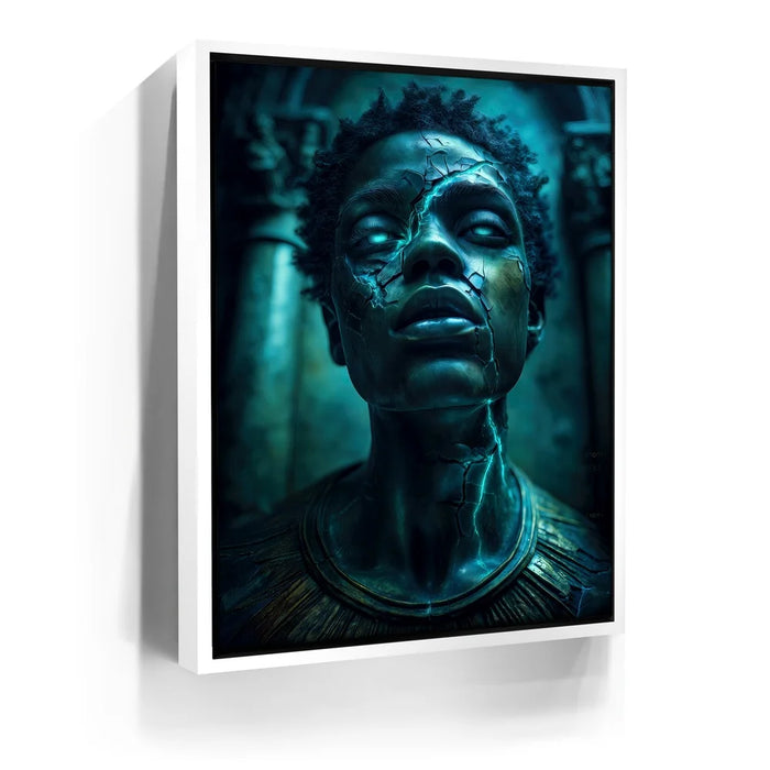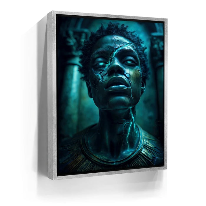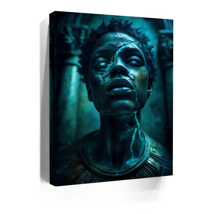 “Divine Interference” by Kandise King merges mysticism, sculpture-like beauty, and surreal energy into a haunting, powerful portrait. The cracked, stone-textured skin illuminated by electric blue lines gives the figure an ancient-yet-futuristic presence, as if touched by forces beyond the human realm. The glowing eyes and cold, ethereal lighting create an atmosphere charged with divinity, tension, and transformation.