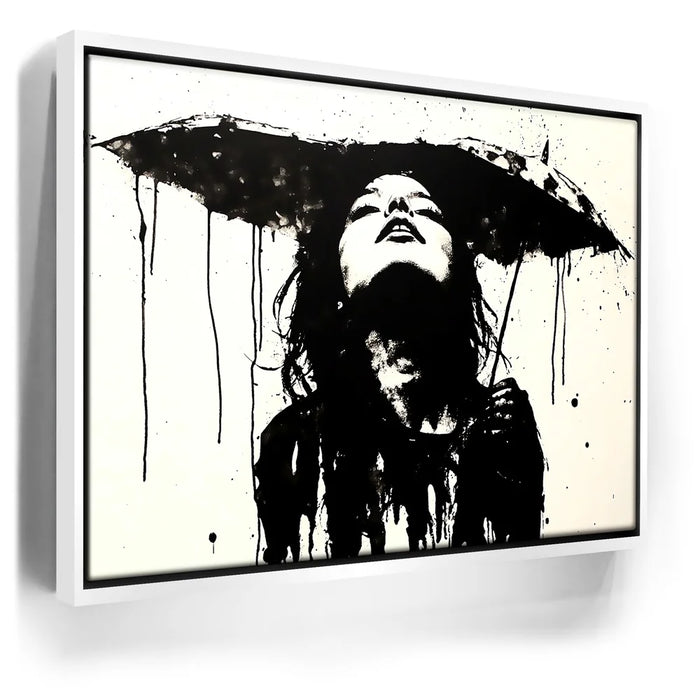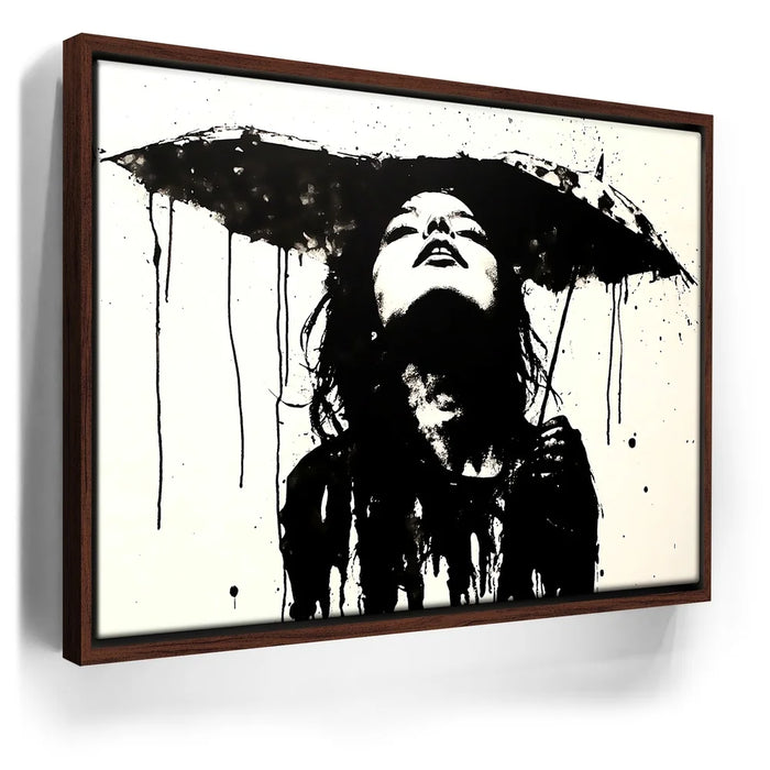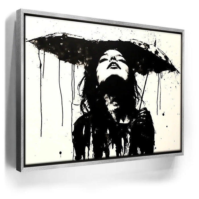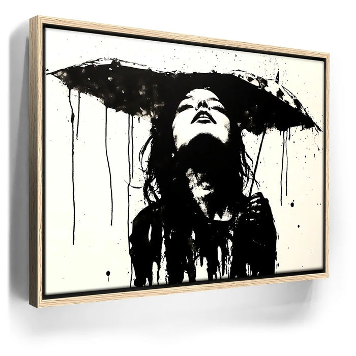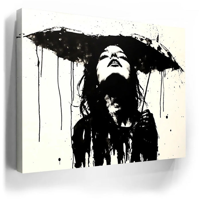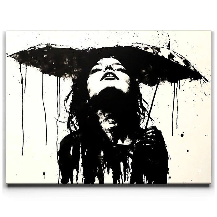 Drenched in Silence captures a powerful moment of surrender and solitude. A lone figure stands beneath an umbrella, rain cascading down like liquid ink, merging with the shadows that envelop her. The monochromatic palette heightens the emotion — raw, haunting, and introspective. This piece speaks to the quiet resilience found in stillness, where even in the storm’s downpour, there is grace in letting go and finding peace within the noise.