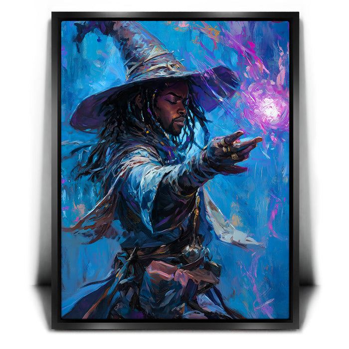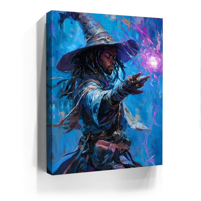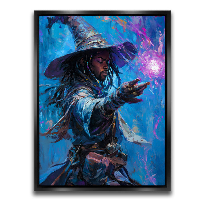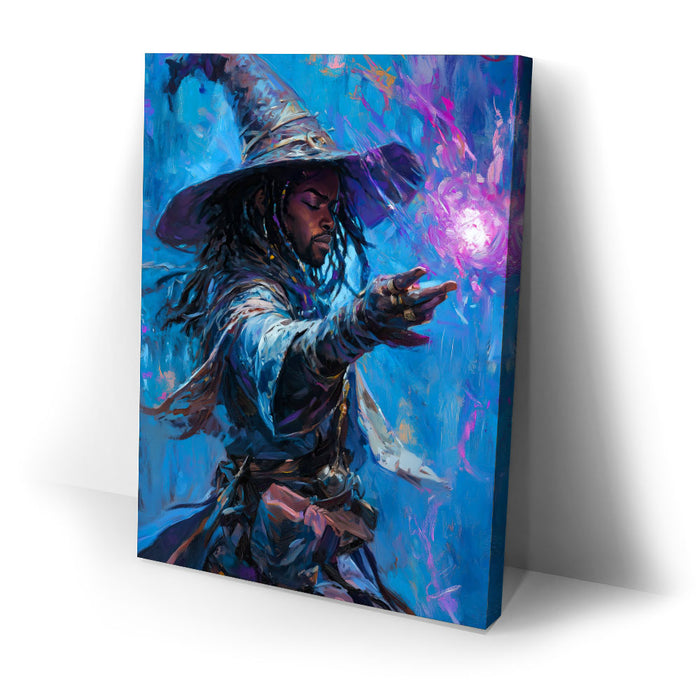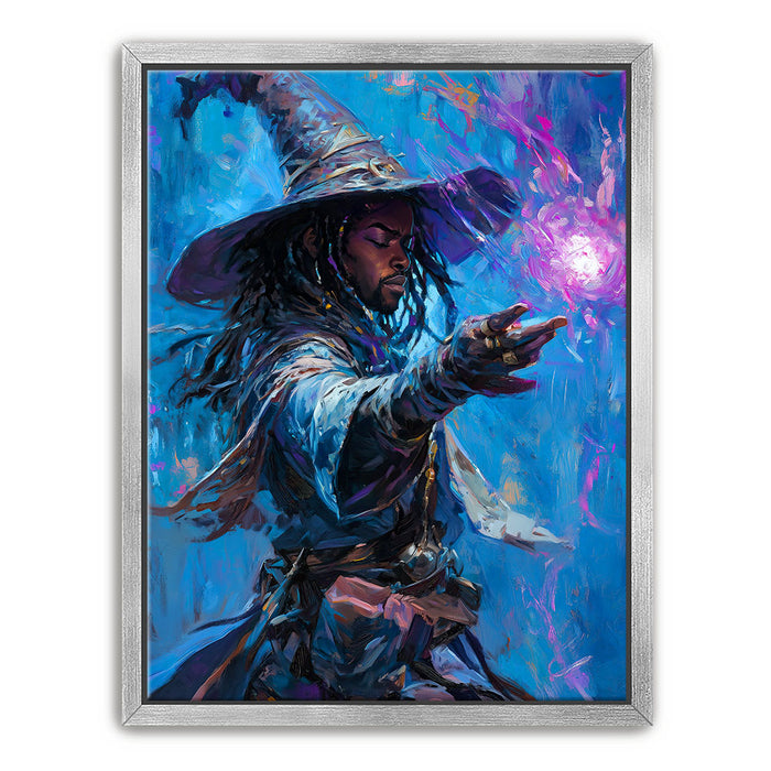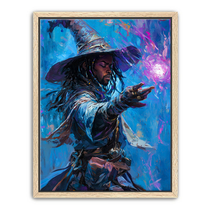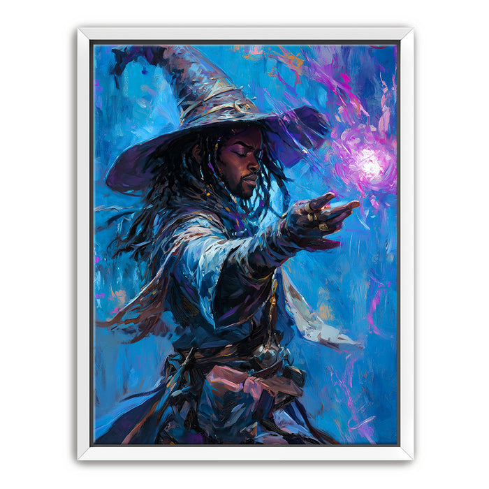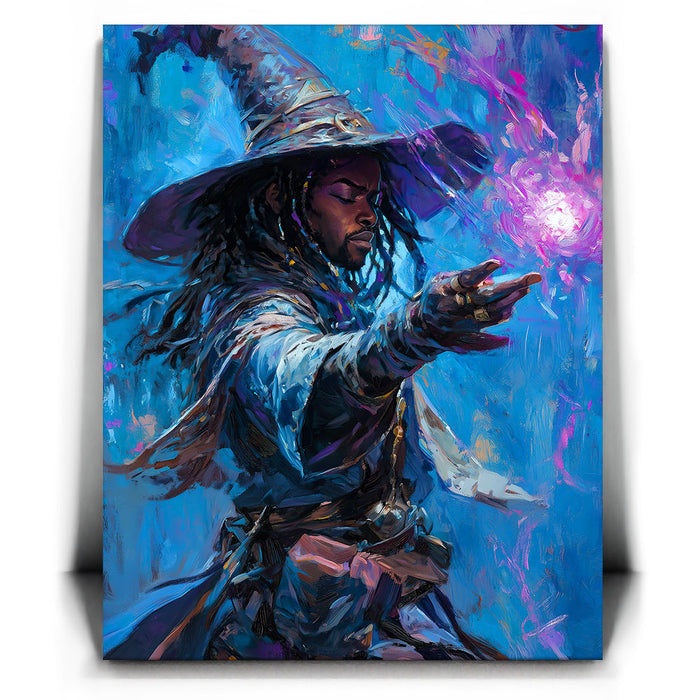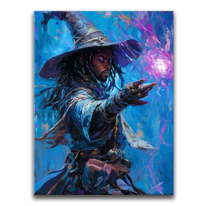 "Drexon The Mystic" by Kandise King is a mesmerizing portrayal of a powerful sorcerer commanding arcane energy. Set against a vibrant blue backdrop with streaks of radiant light, the artwork captures the intensity and grace of magic in motion. The character's detailed robes, enchanted accessories, and focused expression evoke mystery, strength, and mastery of the mystical arts.