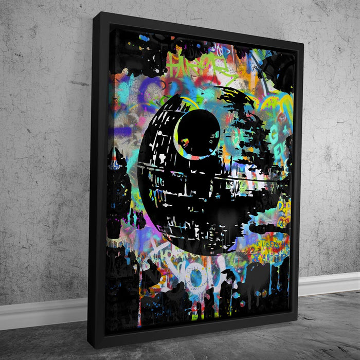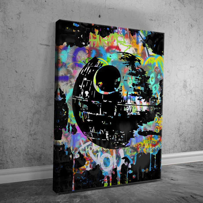 "DS-2 - Drip Graffiti" by Stephen Chambers is a vibrant, stencil-style artwork that combines the iconic imagery of *Star Wars* with modern graffiti techniques. Featuring the legendary Death Star in a colorful splatter style, this piece brings a unique twist to the beloved sci-fi universe. Its eye-catching colors and graphic art approach make it a must-have for fans of *Star Wars* and contemporary street art alike.