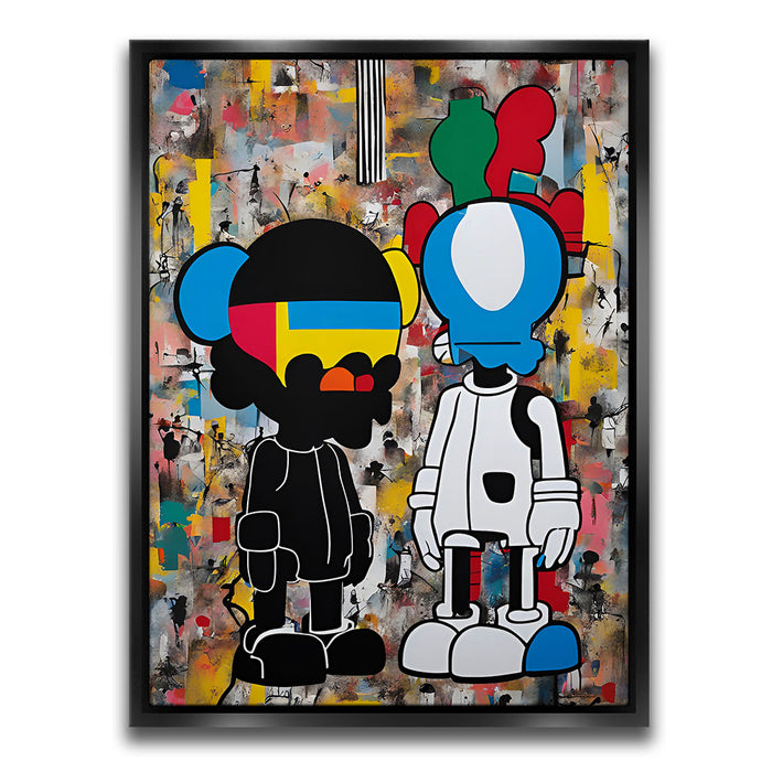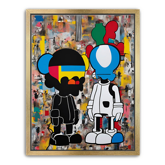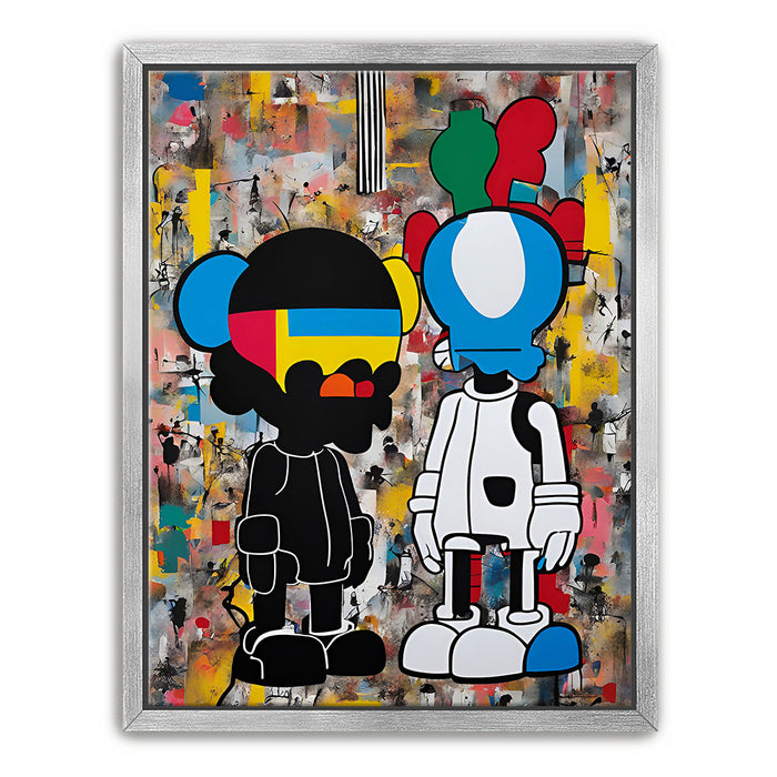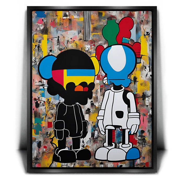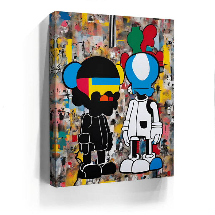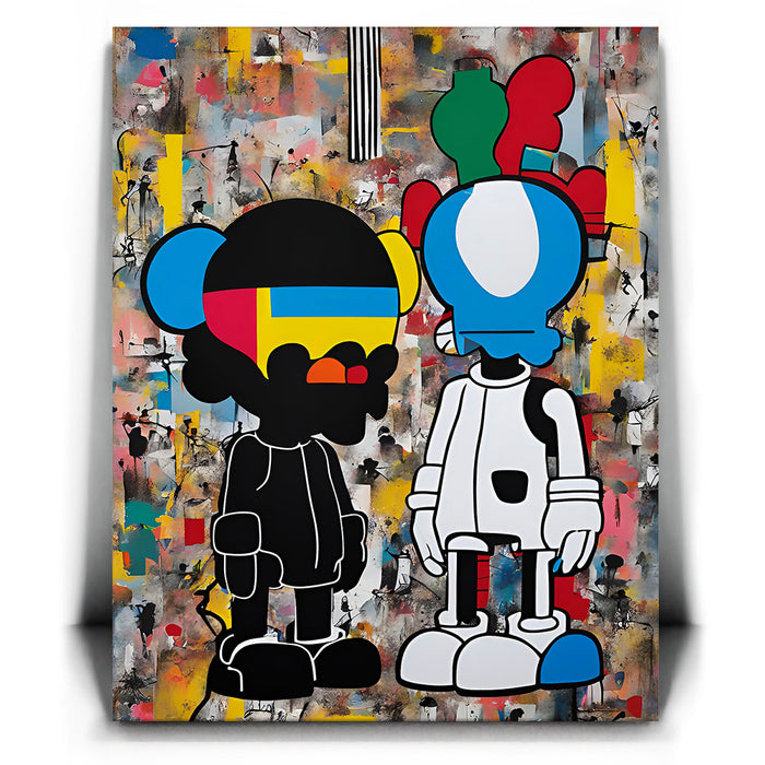 "Dualities of the Urban Mind" by George Rosaly is a powerful exploration of modern street culture and the contrast between identities in urban environments. The two contrasting figures, depicted with bold lines and vibrant colors, represent the complexities of life in a metropolitan landscape. Rosaly skillfully blends abstract backgrounds with street-art-inspired characters, offering a visual representation of the diverse thoughts and emotions that coexist in city life.