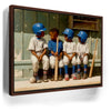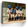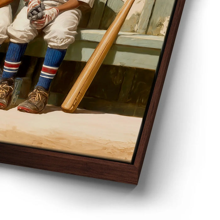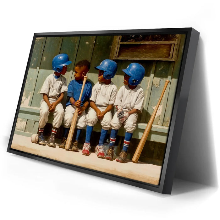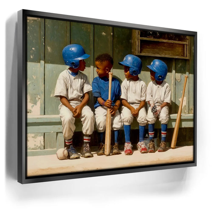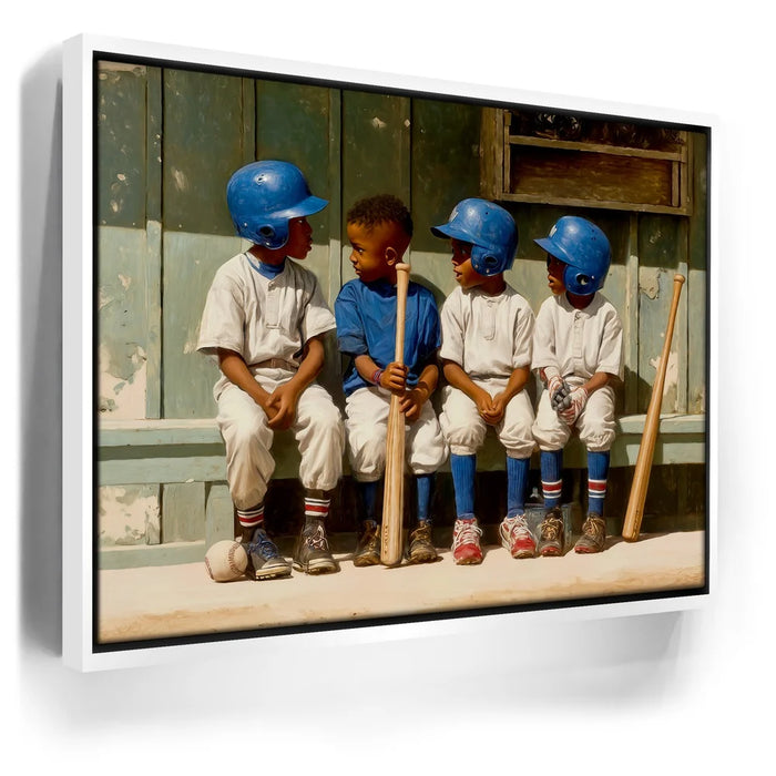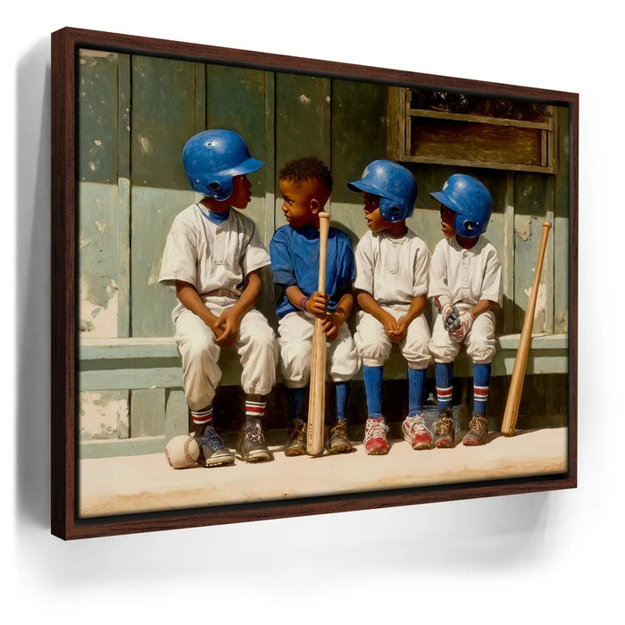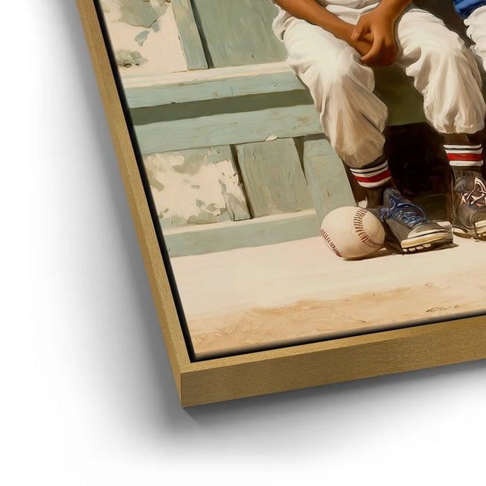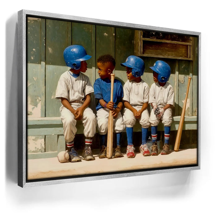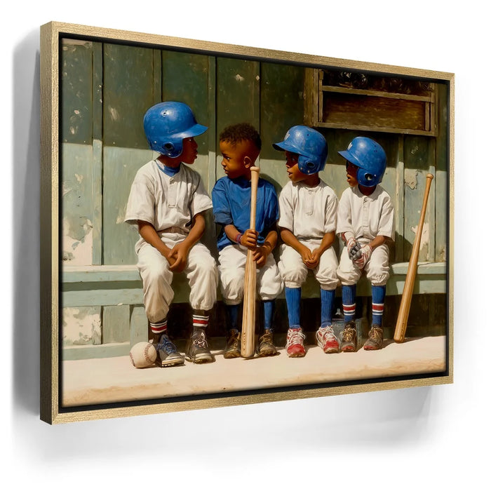 “Dugout Code” by Kandise King captures the heart of childhood sports: friendship, teamwork, and those unspoken moments that build the love of the game. Four young players sit shoulder to shoulder on a worn wooden bench, helmets shining, bats at their sides, sharing a quiet exchange that feels both innocent and important. The dusty uniforms, sunlit field, and nostalgic textures create a warm, timeless atmosphere.