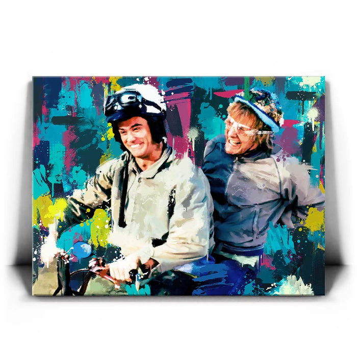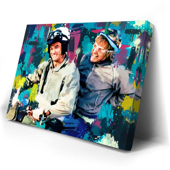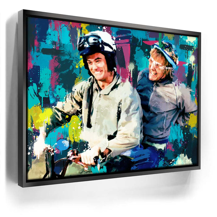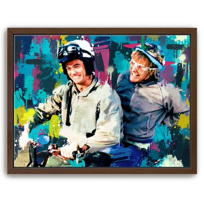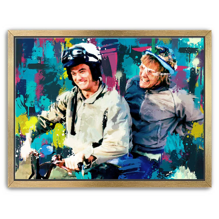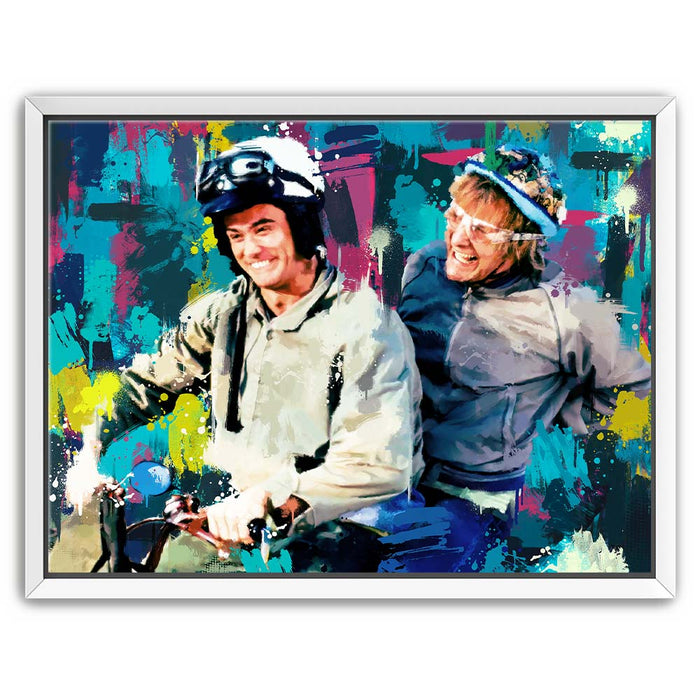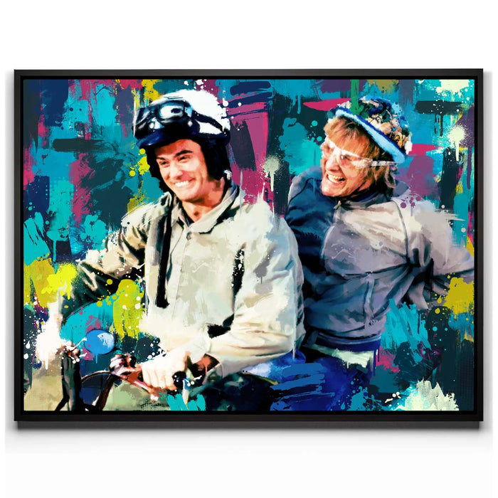 "Dumb And Dumber - The Ride To Aspen" captures a vibrant and playful scene from the iconic film, featuring the two main characters on their infamous scooter ride to Aspen. The bright, colorful splashes of paint surrounding the duo add an extra layer of fun and energy, perfectly reflecting the lighthearted and chaotic spirit of the movie. Their joyful expressions and carefree attitude bring a sense of humor and nostalgia to the artwork.
