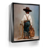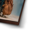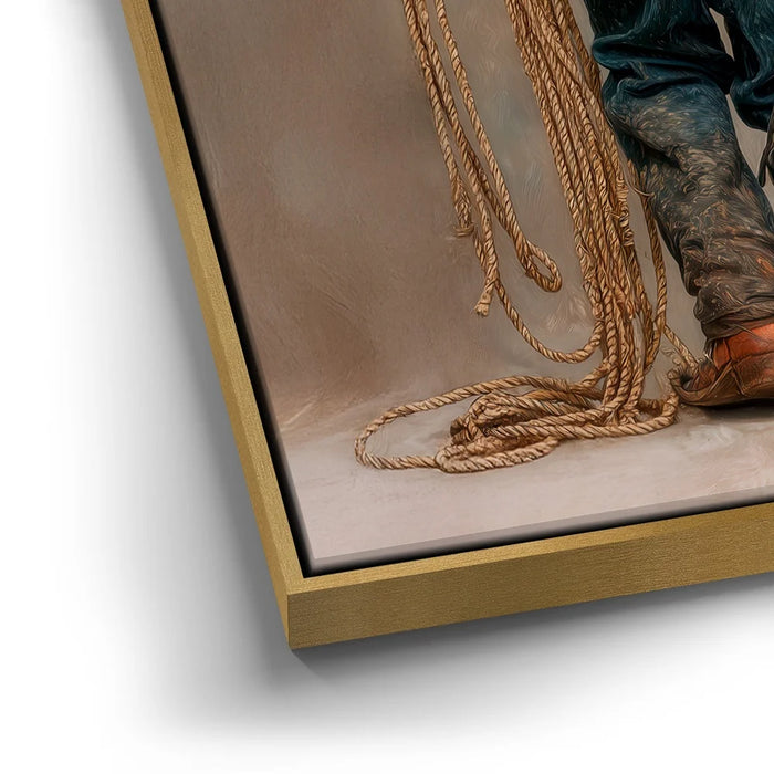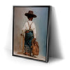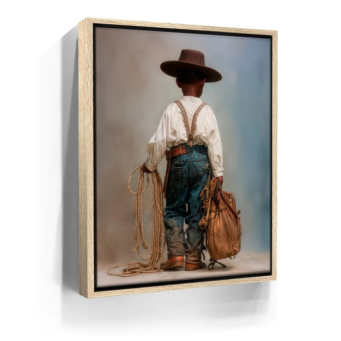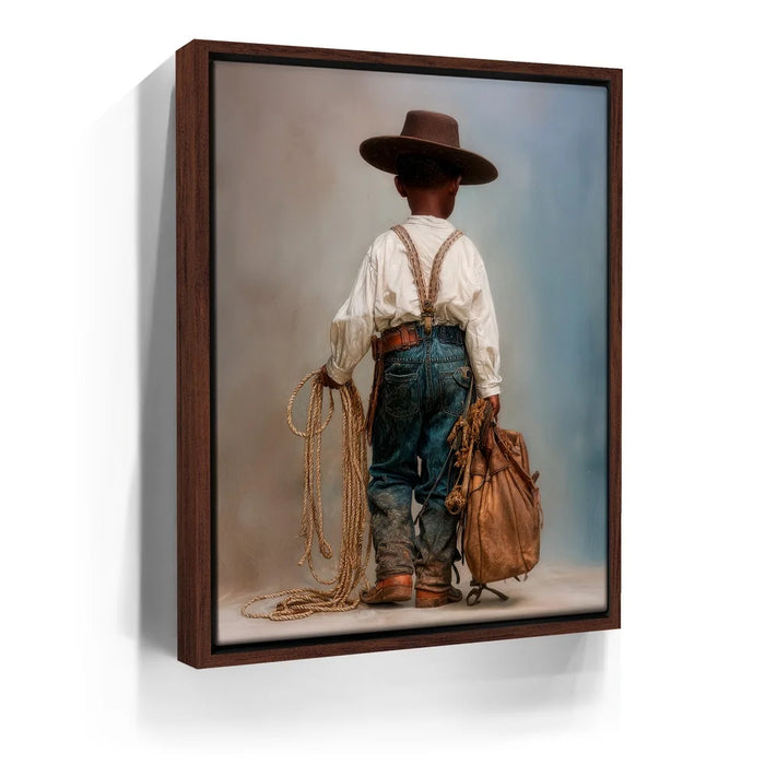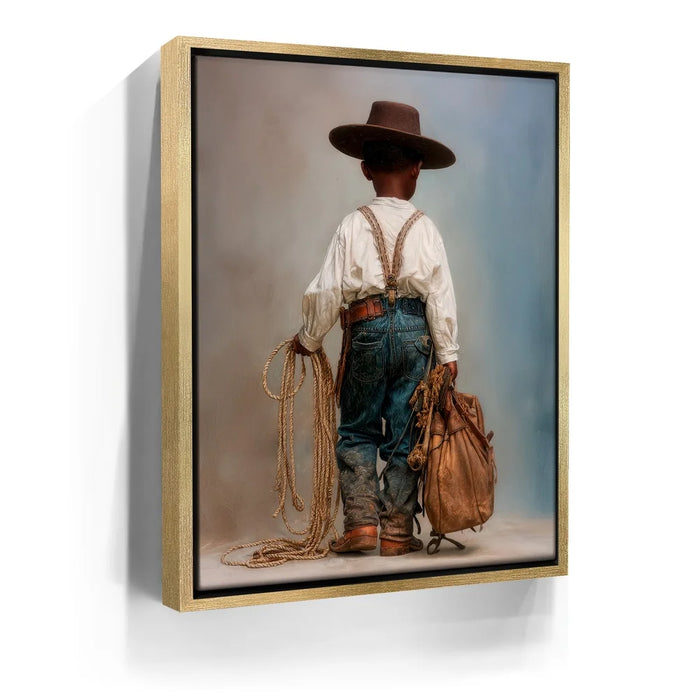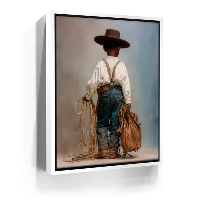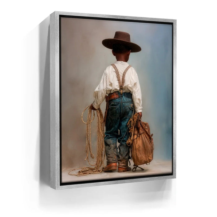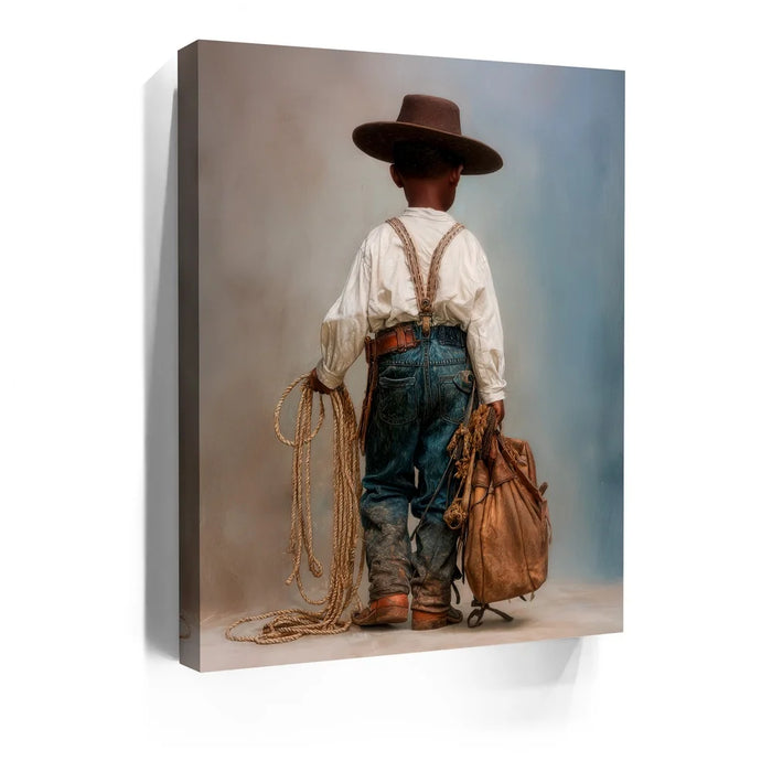 “Dust & Denim” by Kandise King captures the innocence and rugged charm of childhood through the lens of classic Western culture. The young cowboy stands with his back turned, dressed in worn boots, suspenders, and well-loved jeans, holding a coiled rope in one hand and a weathered bag in the other. Every detail—from the dust on his clothes to the oversized hat—creates a warm, nostalgic scene rooted in adventure and imagination.
