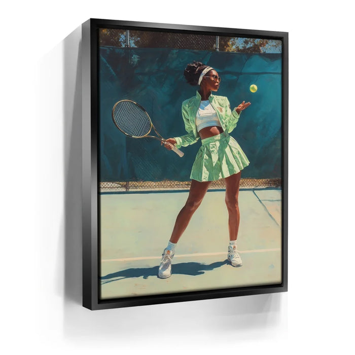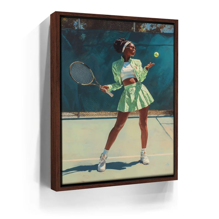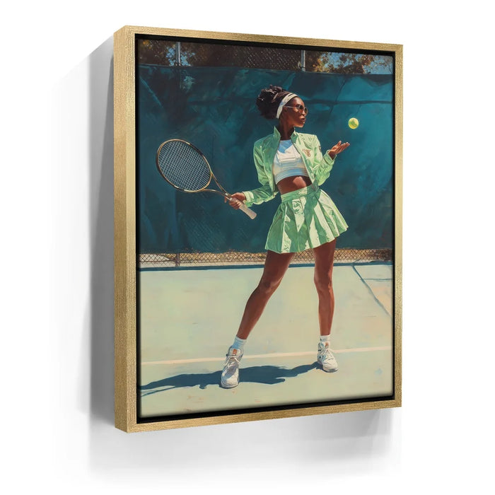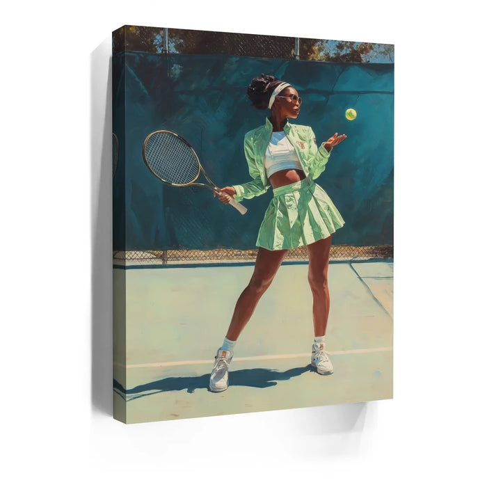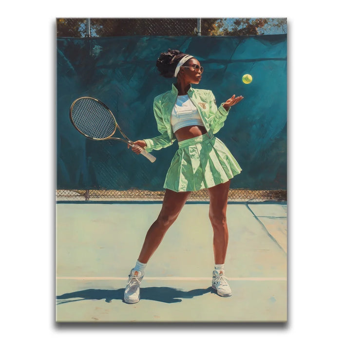 “Easy Ace” by Kandise King captures the perfect blend of athletic confidence and effortless style. The woman stands poised on the tennis court, tossing the ball with casual precision while her racquet rests ready in her other hand. Her mint-green skirt set, sunglasses, and headband give the scene a fresh, retro-inspired vibe that elevates both attitude and elegance.