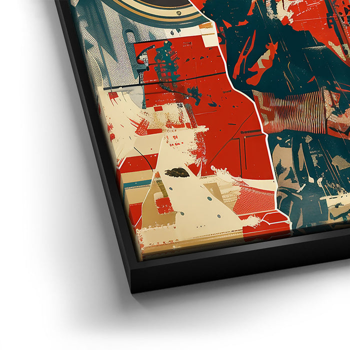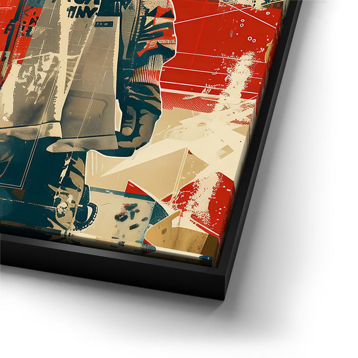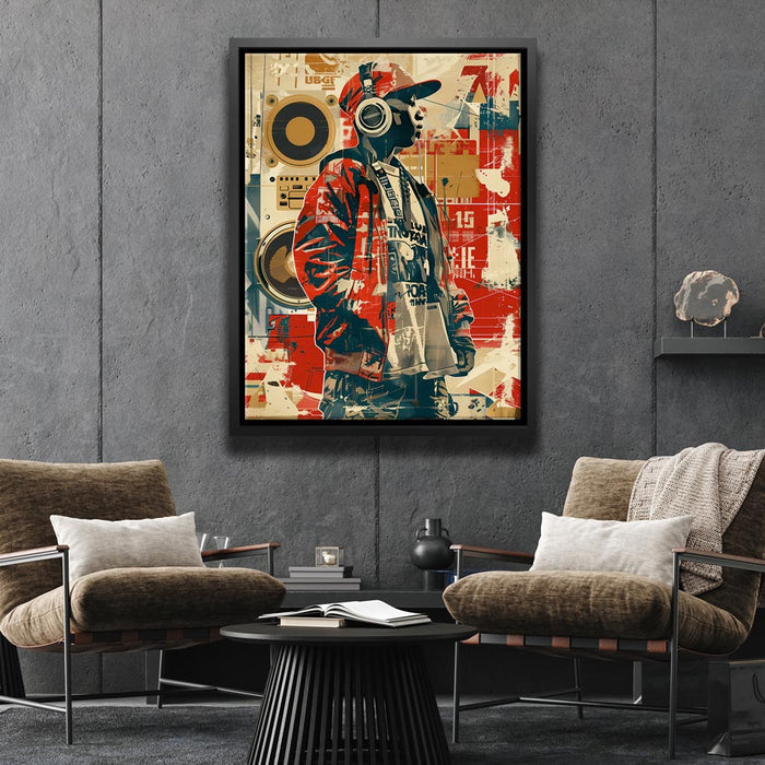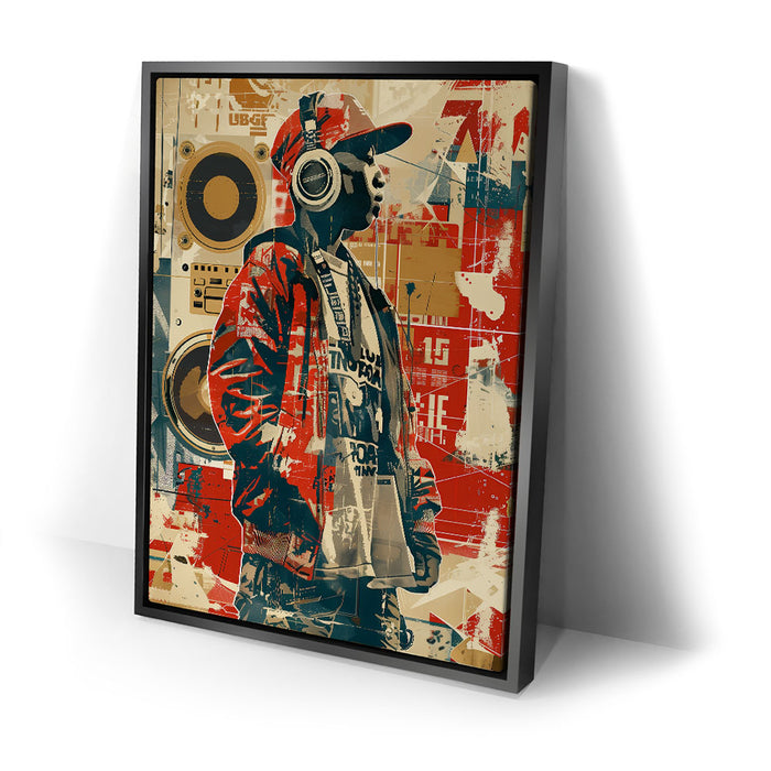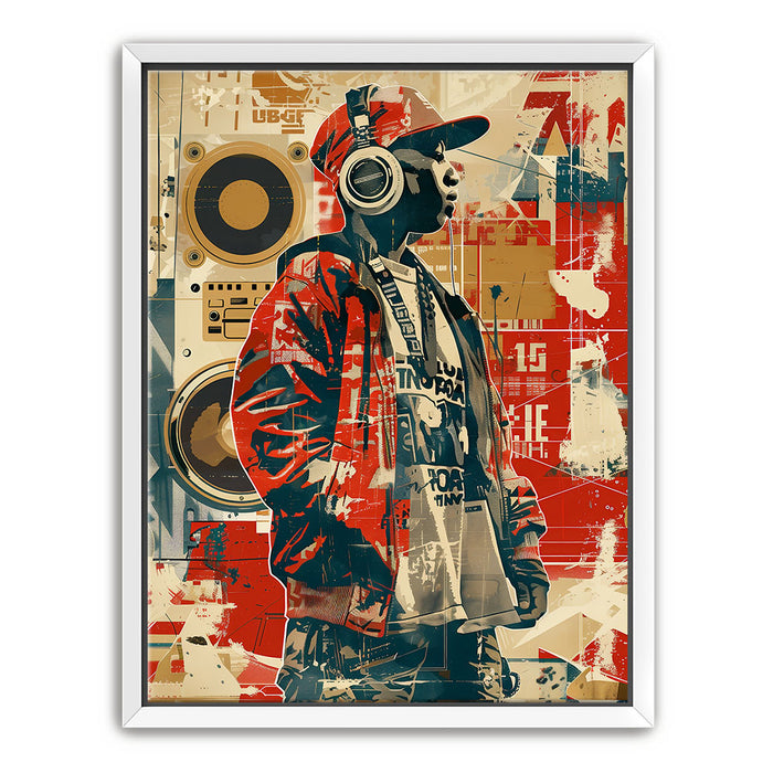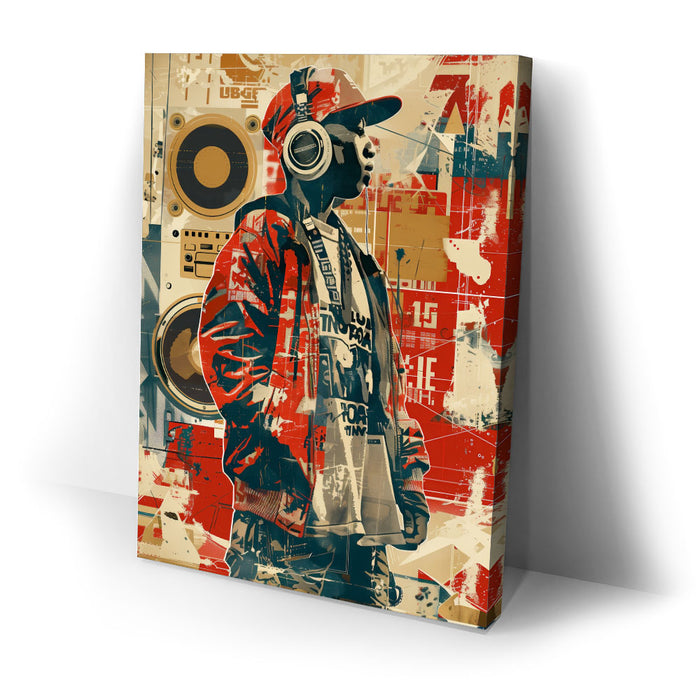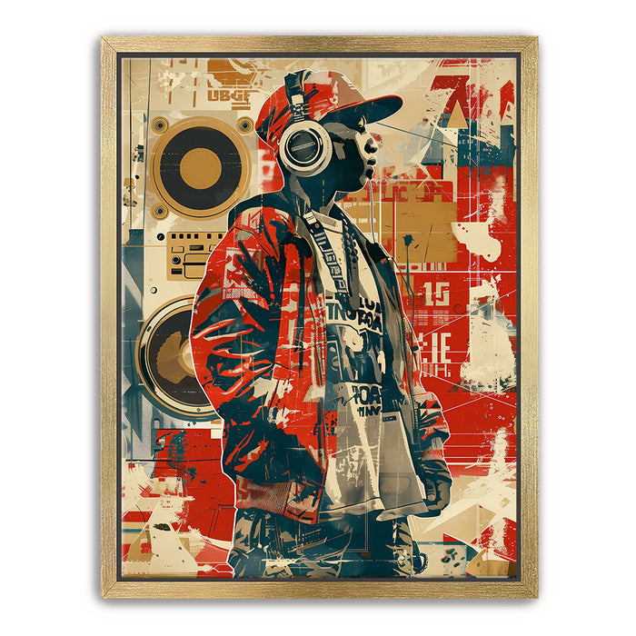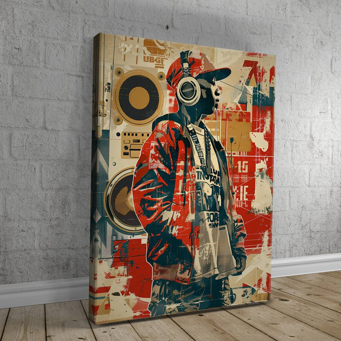 "Echoes Of The Streets" by Arend Pryer is a powerful and dynamic piece of urban art that blends elements of hip-hop culture with bold, abstract visuals. The central figure, dressed in streetwear and wearing headphones, stands confidently against a backdrop of graffiti-inspired patterns and large speakers, symbolizing the influence of music and rhythm in urban life. The mix of reds, beiges, and muted tones gives the artwork a gritty, yet vibrant energy, reflecting the essence of street culture.