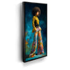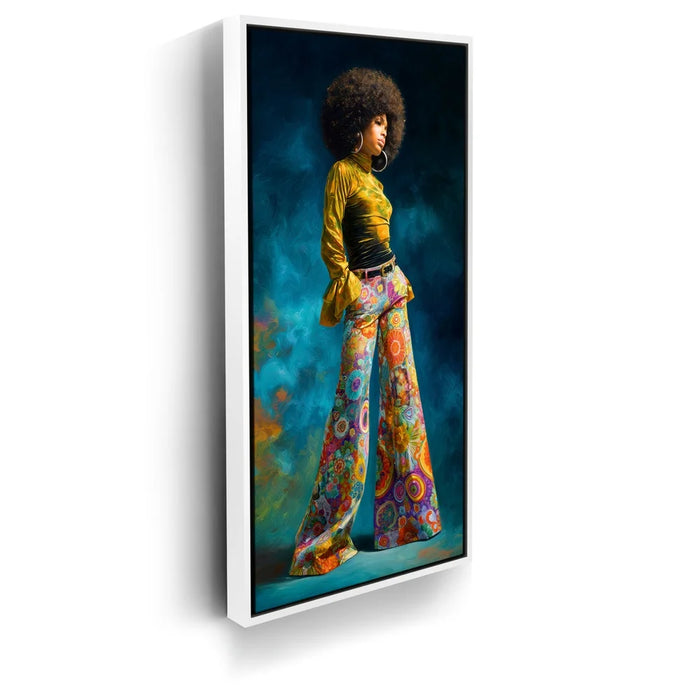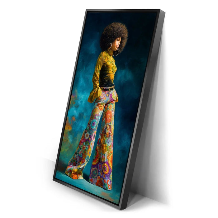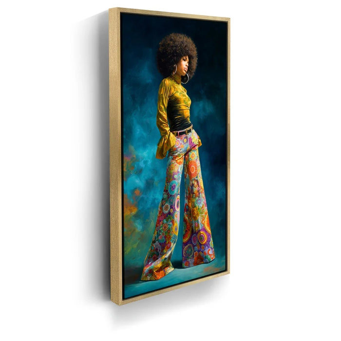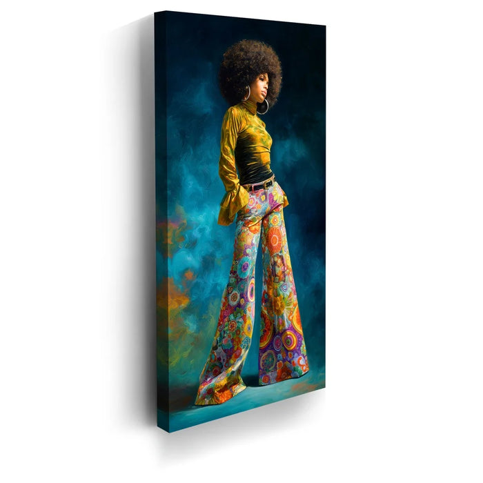 “Electric Soul” by Kandise King captures the vibrant, free-spirited essence of 70s style with bold color, movement, and personality. The woman stands confidently in bright, patterned bell-bottoms and a golden velvet top, her afro glowing against a dramatic teal backdrop. Every detail—from her pose to her hoop earrings—channels a powerful blend of retro flair and modern expression.