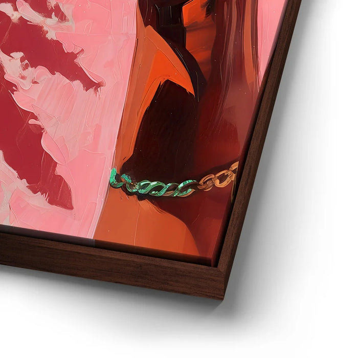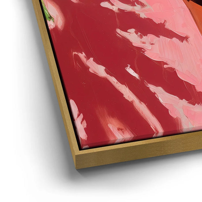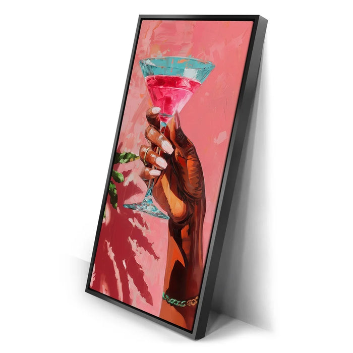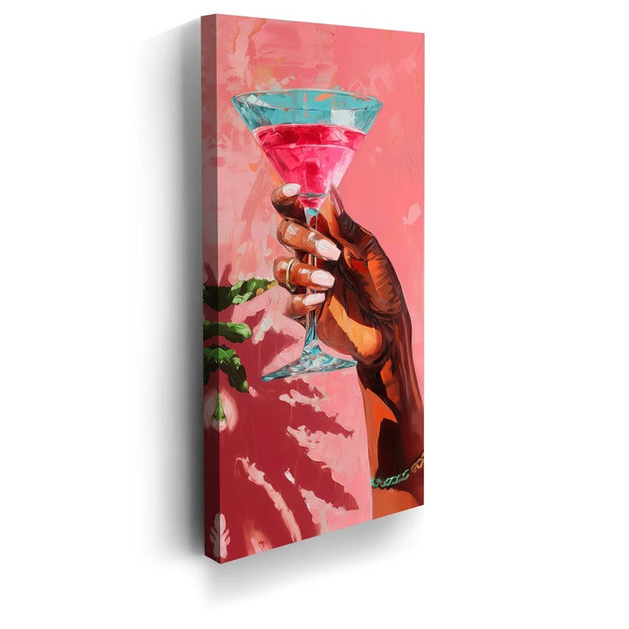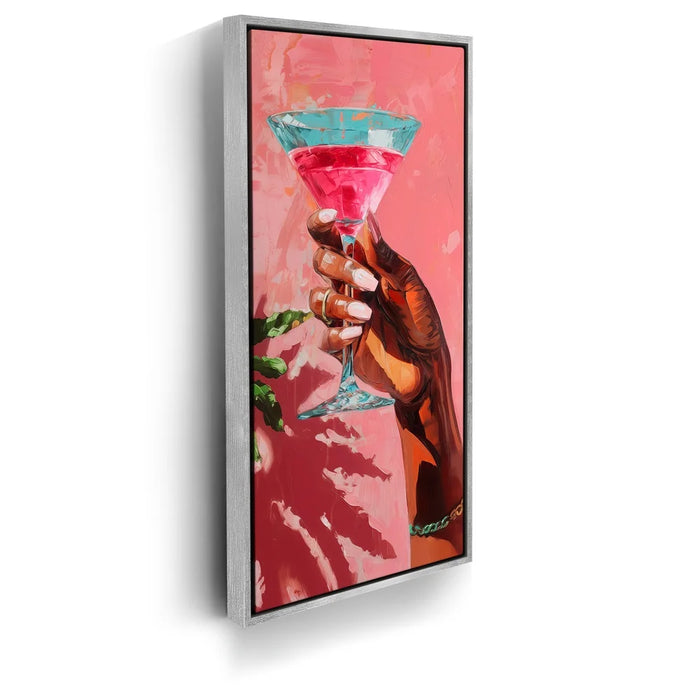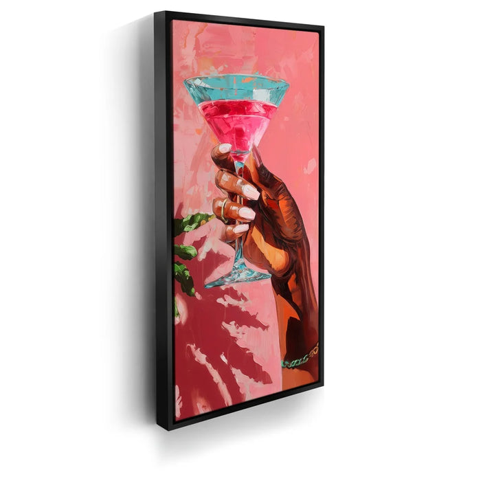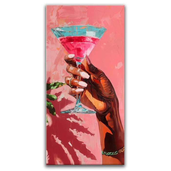 “Flamingo Fuel” by Kandise King is a vibrant, feel-good celebration of color, confidence, and carefree moments. This striking artwork centers on a hand raised in a toast, holding a bright pink cocktail against a warm, tropical-inspired backdrop. The bold brushstrokes, rich skin tones, and playful palette create an irresistible sense of summertime joy and effortless elegance.