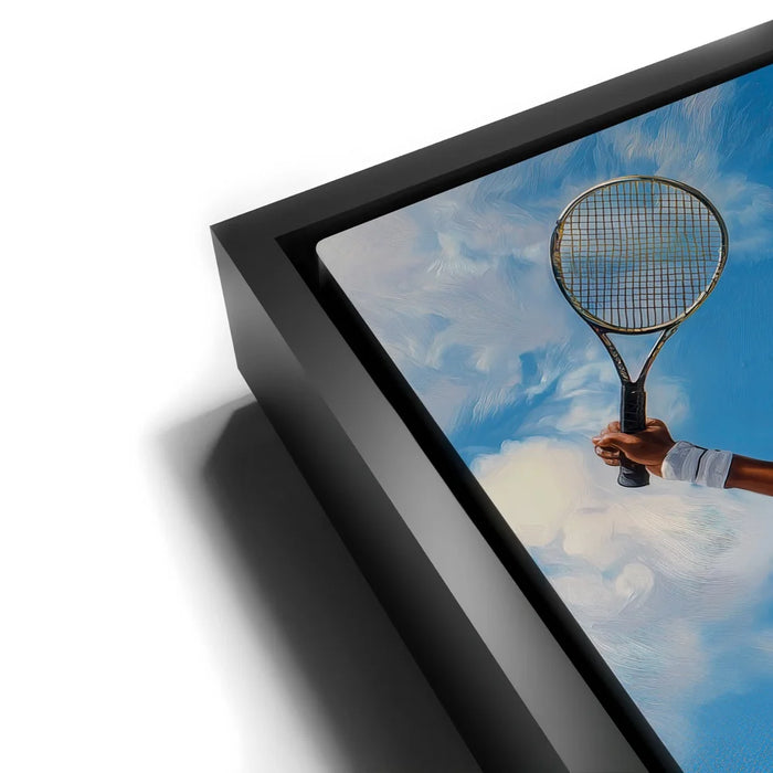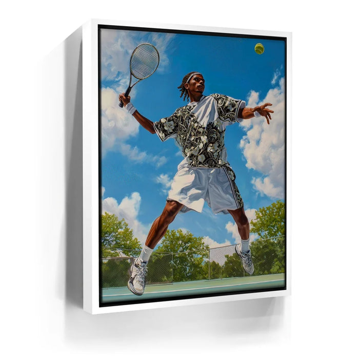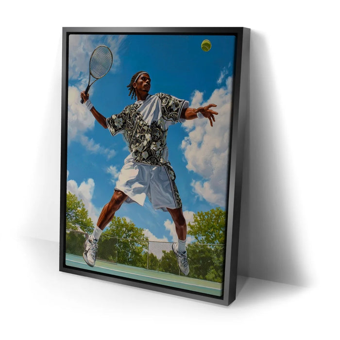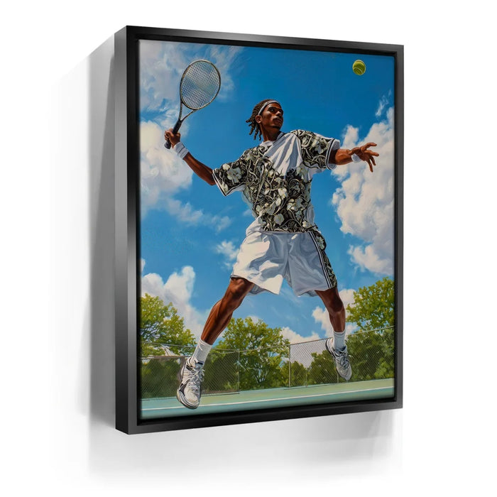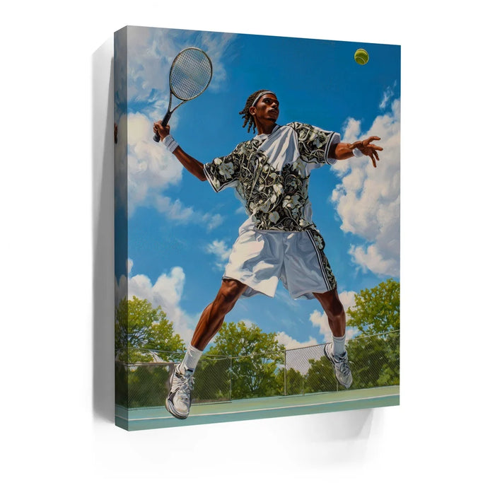 “Elevate The Game” by Kandise King captures a dynamic moment of athletic power and style as the player rises off the court, preparing for a decisive swing. His patterned shirt, braided hair, and confident form give the scene a modern edge, while the bright sky and swirling clouds amplify the sense of motion and height. The perspective and energy pull the viewer into the action, making the jump feel bold, precise, and electric.