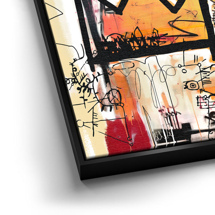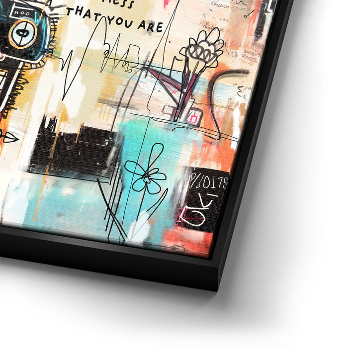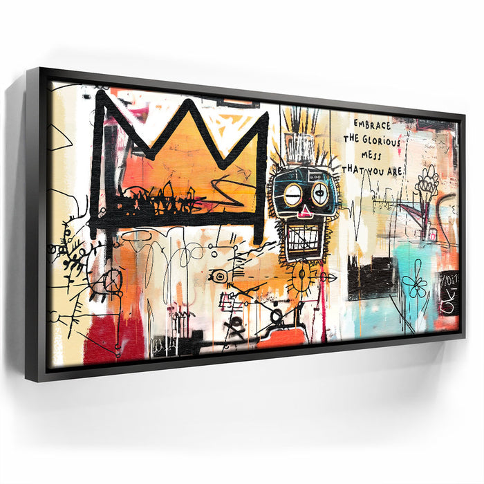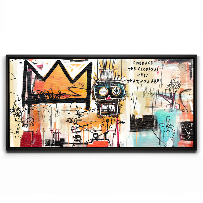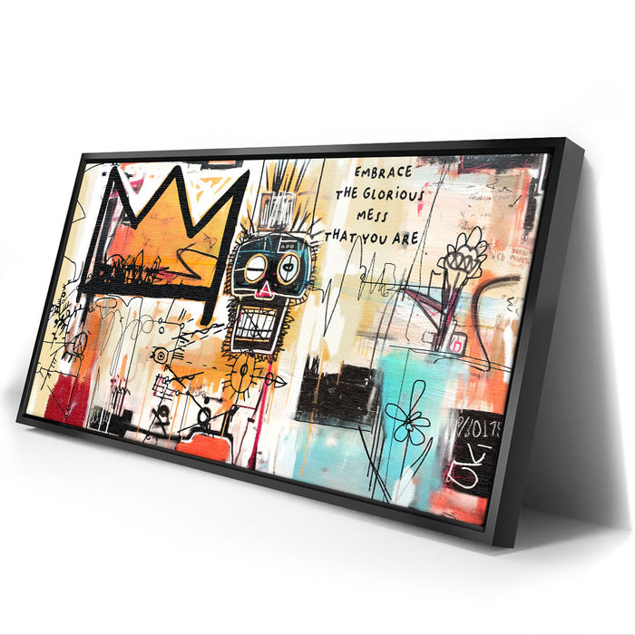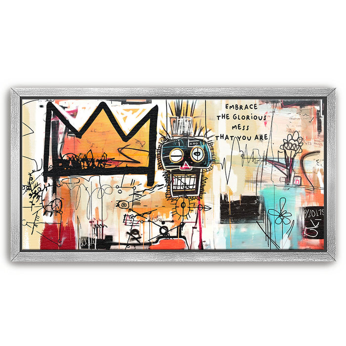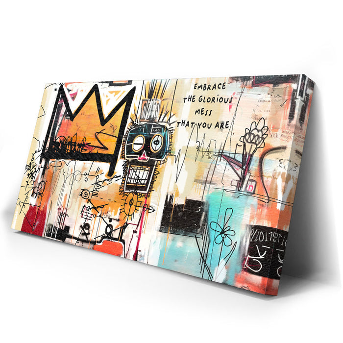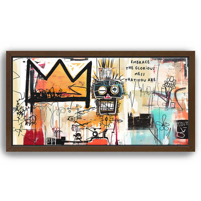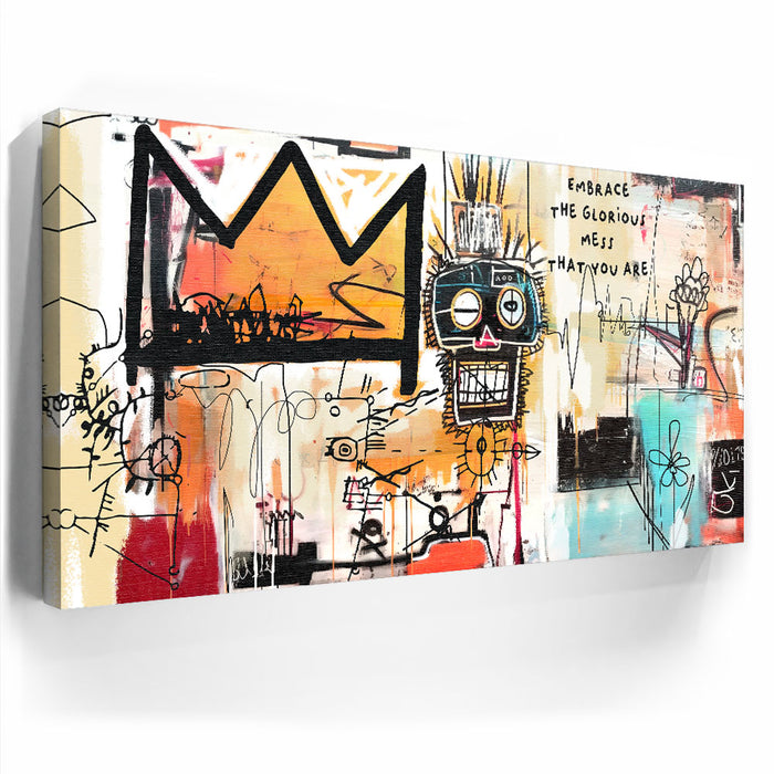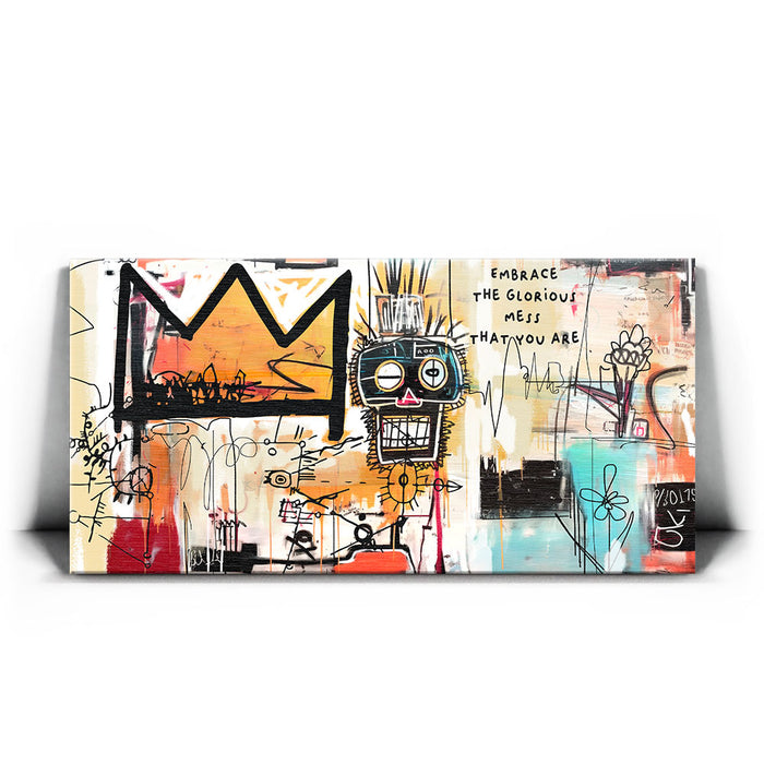 "Embrace Yourself" is an abstract piece that boldly encourages self-acceptance with the phrase "Embrace the Glorious Mess That You Are." This artwork fuses urban graffiti elements with expressive lines and colors, featuring a prominent crown and a quirky face design. It is perfect for those seeking art that celebrates individuality and self-love.