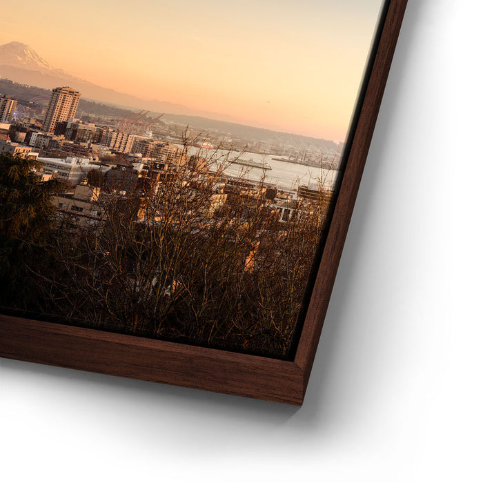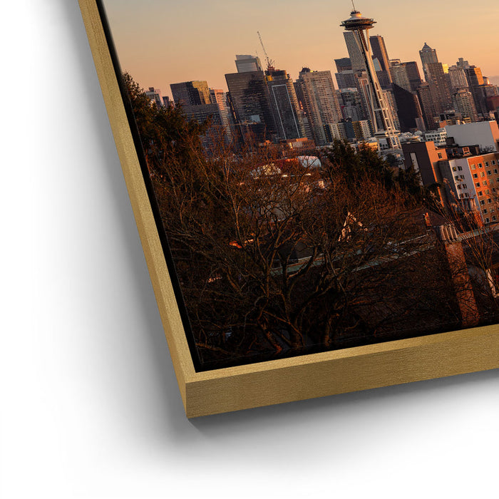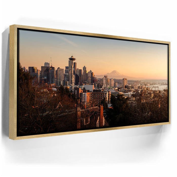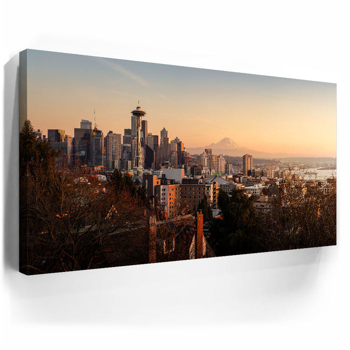 “Emerald City - Seattle, WA” by Daniel Heck showcases the stunning Seattle skyline at golden hour, with the iconic Space Needle rising above the cityscape and Mount Rainier glowing in the distance. Warm sunset light washes over the urban architecture, blending the beauty of the Pacific Northwest with the vibrance of city life.