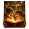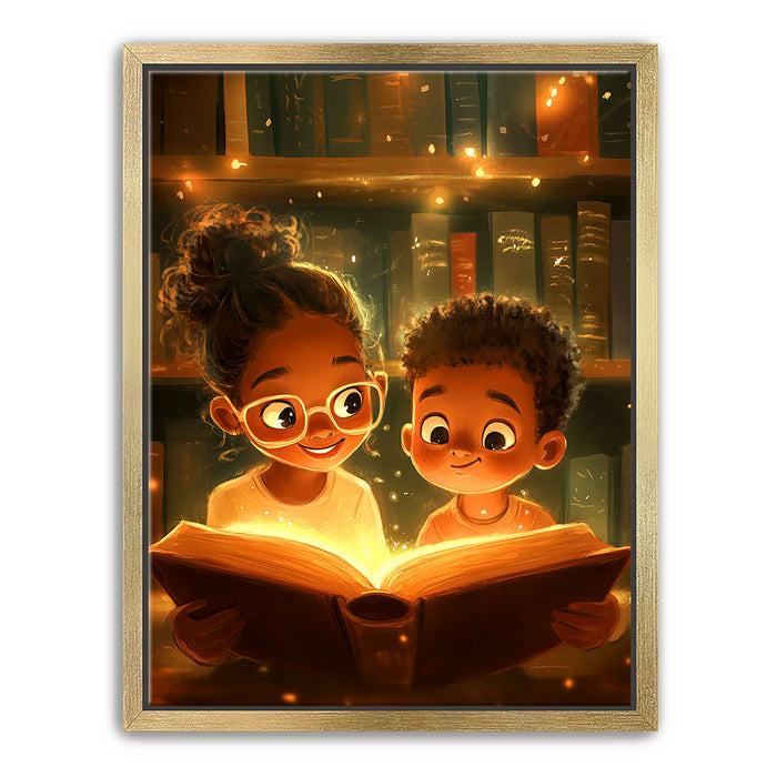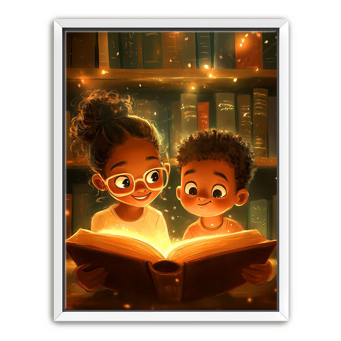 "Enchanted Pages" by Kandise King is a magical depiction of the joy and wonder found in storytelling. The artwork features two children immersed in a glowing book, their faces illuminated with excitement as the pages come to life. Set against a cozy library backdrop with warm, golden tones, this piece captures the beauty of imagination and shared moments of discovery.