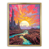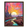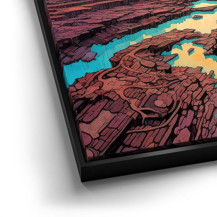 "Eternal Dusk" by MidJourney.Man presents a stunning and surreal landscape, where the sky is illuminated with a radiant sunset of pinks, purples, and oranges, casting vibrant reflections on the winding river below. The towering, jagged structures on either side of the water evoke a futuristic or otherworldly cityscape, while the craggy terrain adds depth and dimension. This piece beautifully contrasts bright, vivid skies with the more muted, earthy tones of the land, capturing the essence of a world in perpetual twilight.