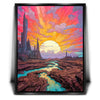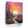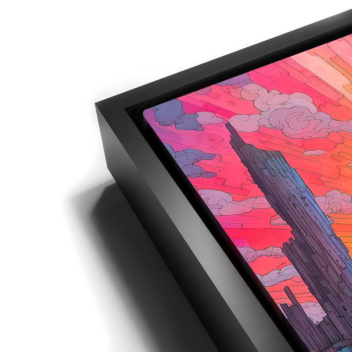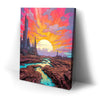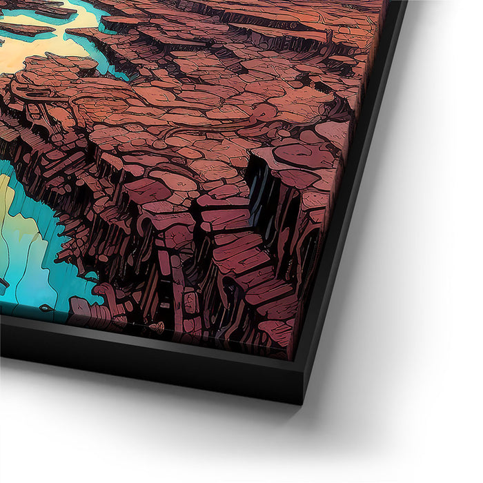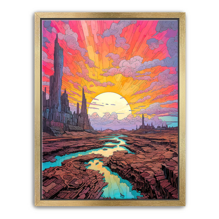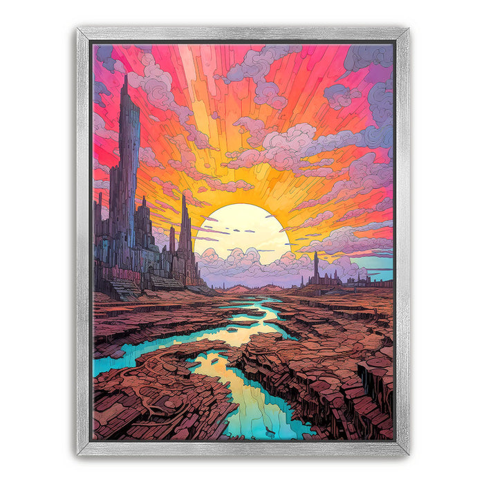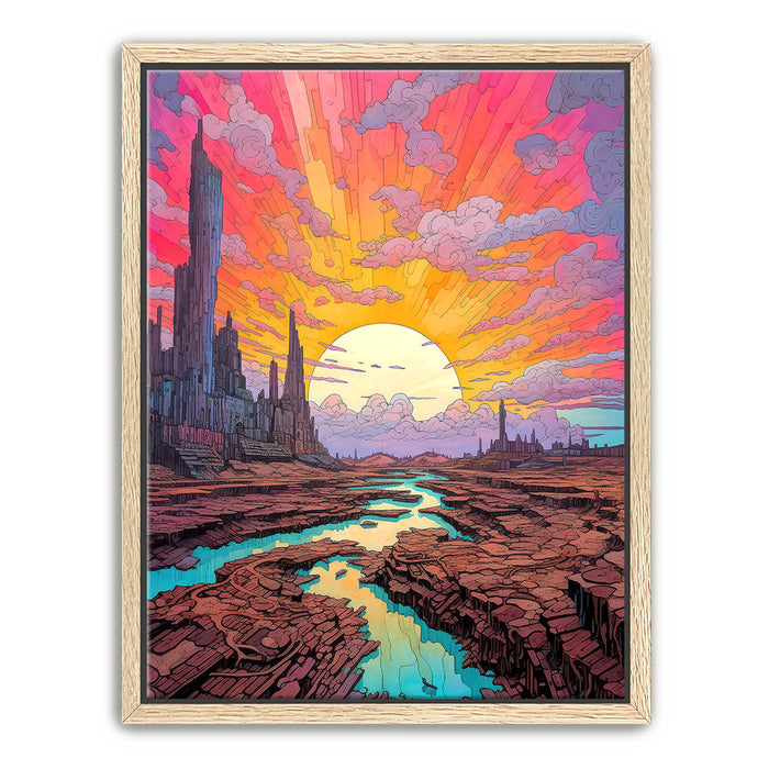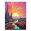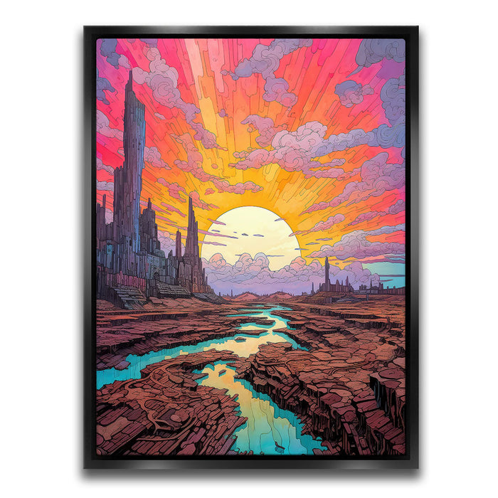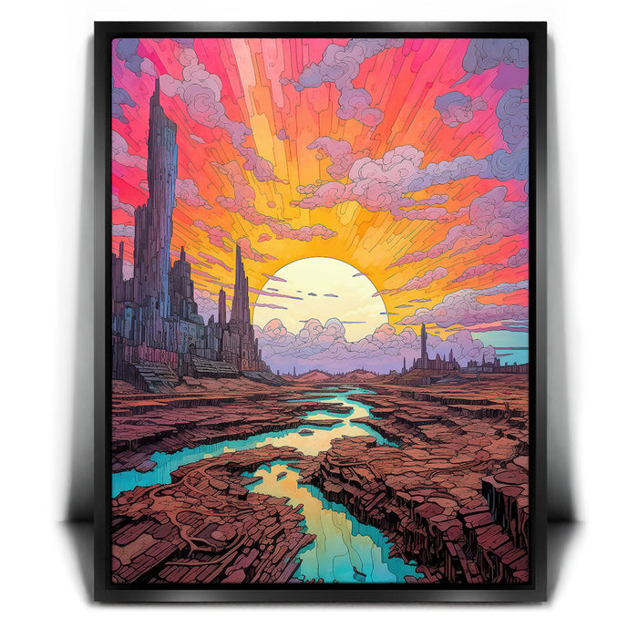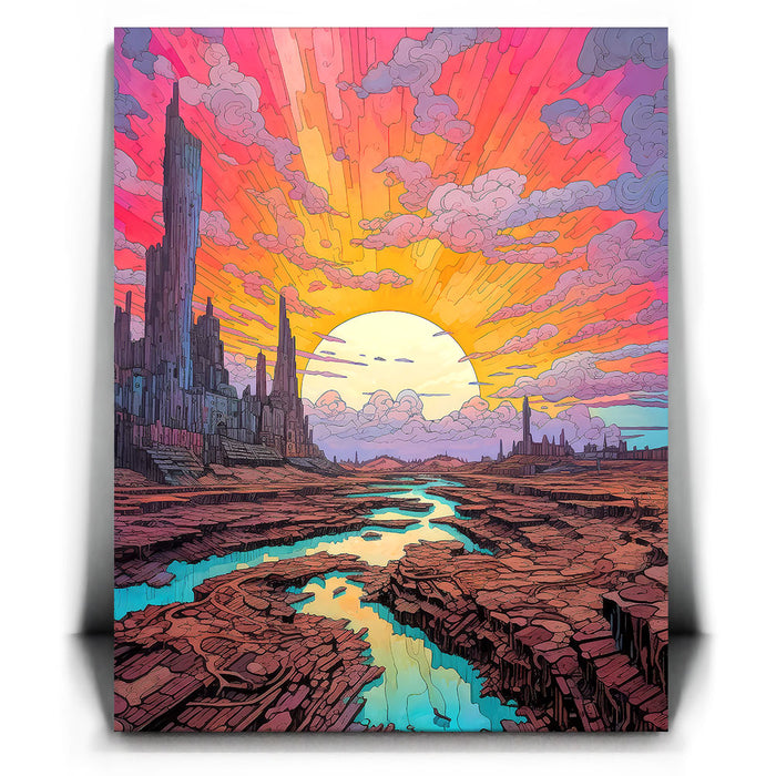 This artwork appeals to lovers of vibrant, fantasy landscapes and futuristic settings, blending imaginative architecture with a mesmerizing natural environment.