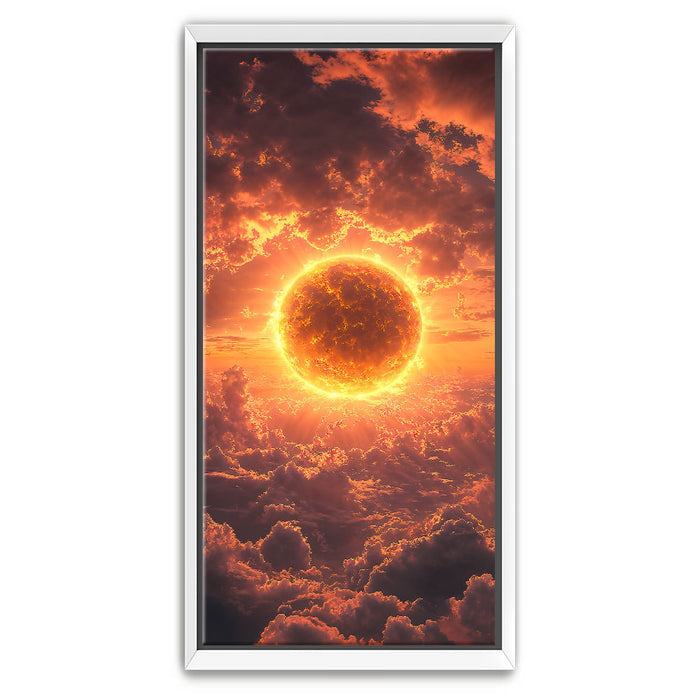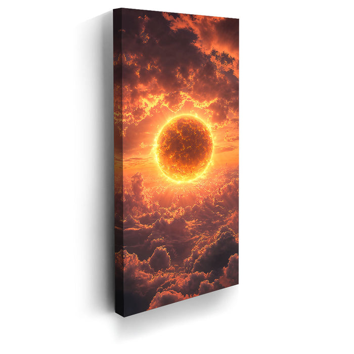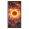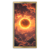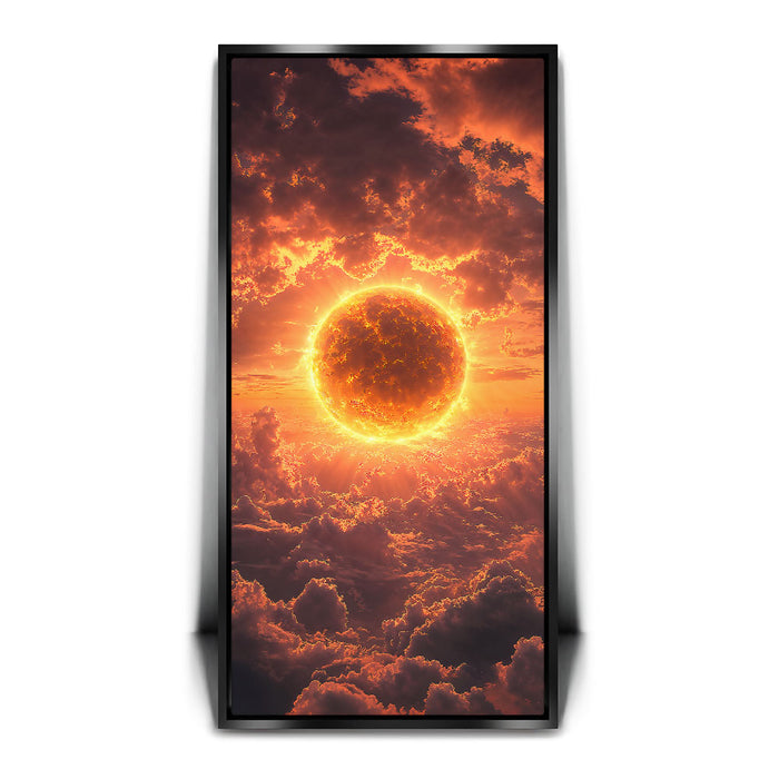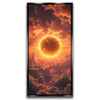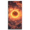 "Eternal Flame" by Midjourney.Man captures the raw, majestic power of the sun suspended among vibrant, dramatic clouds. This awe-inspiring artwork bathes the canvas in fiery hues of orange and gold, evoking themes of infinity, energy, and the universe’s untamed beauty.
