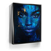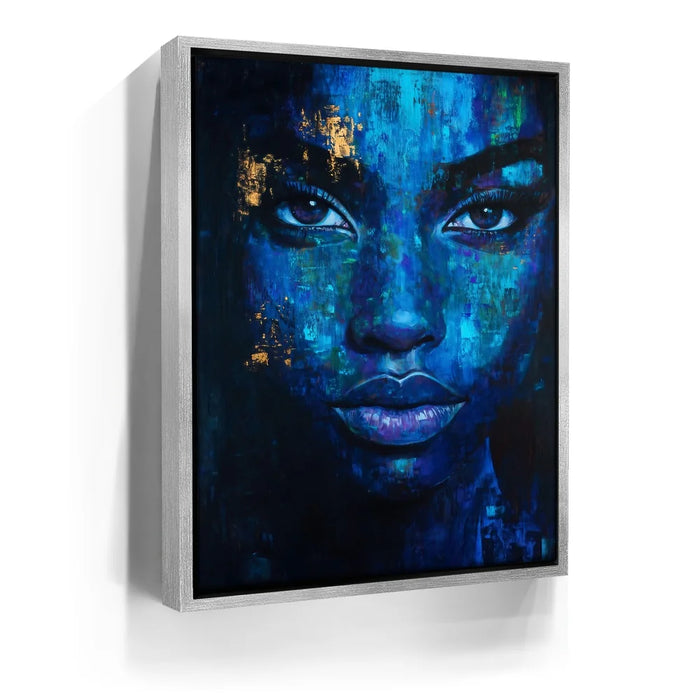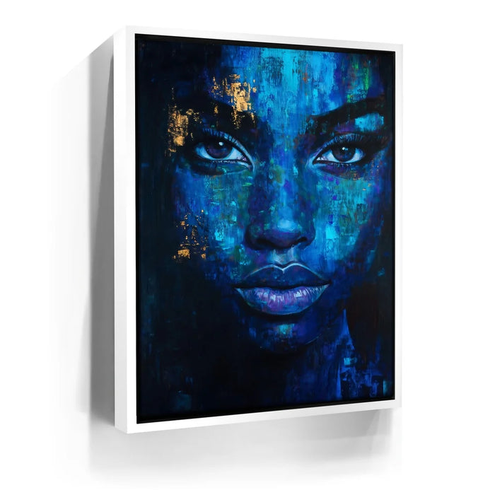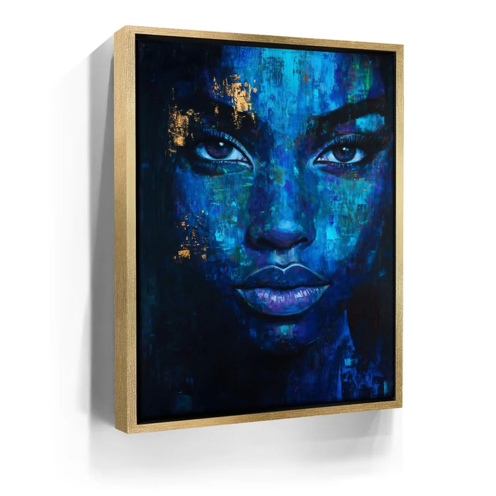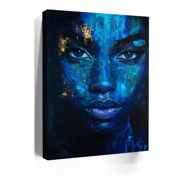 “Eyes Of Indigo” by Kandise King is a mesmerizing blend of emotion, depth, and abstract beauty. The portrait emerges from rich layers of blue, teal, and midnight tones, creating a dreamlike texture that feels both intimate and mysterious. Subtle touches of gold shimmer across the face, adding warmth and contrast that highlight the subject’s striking gaze and expressive features.