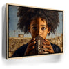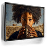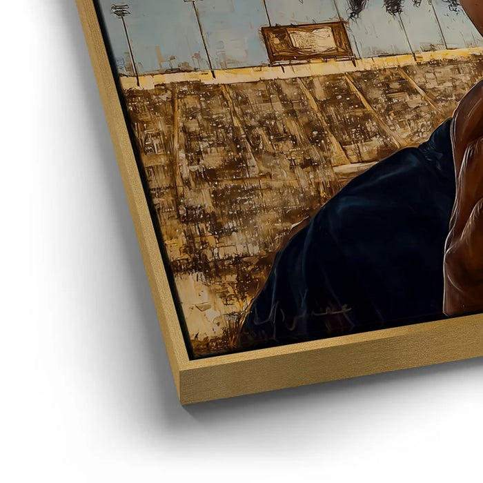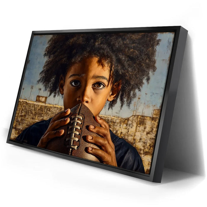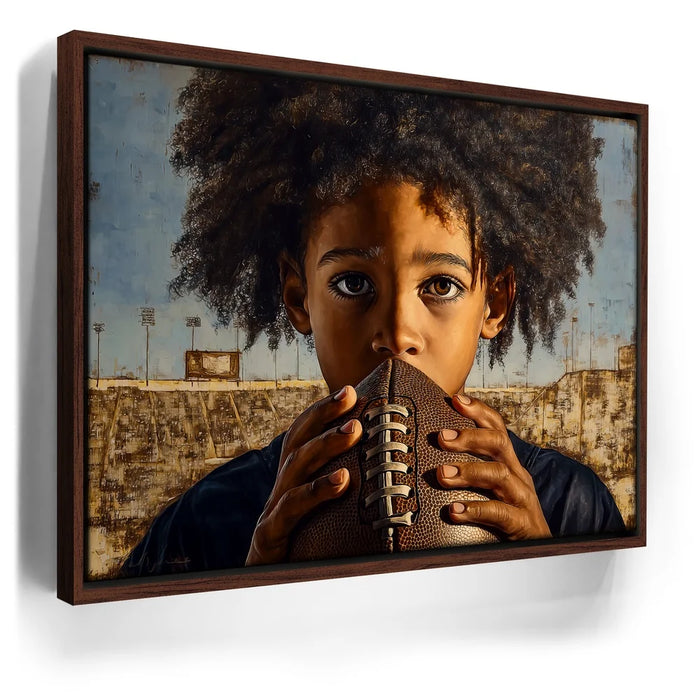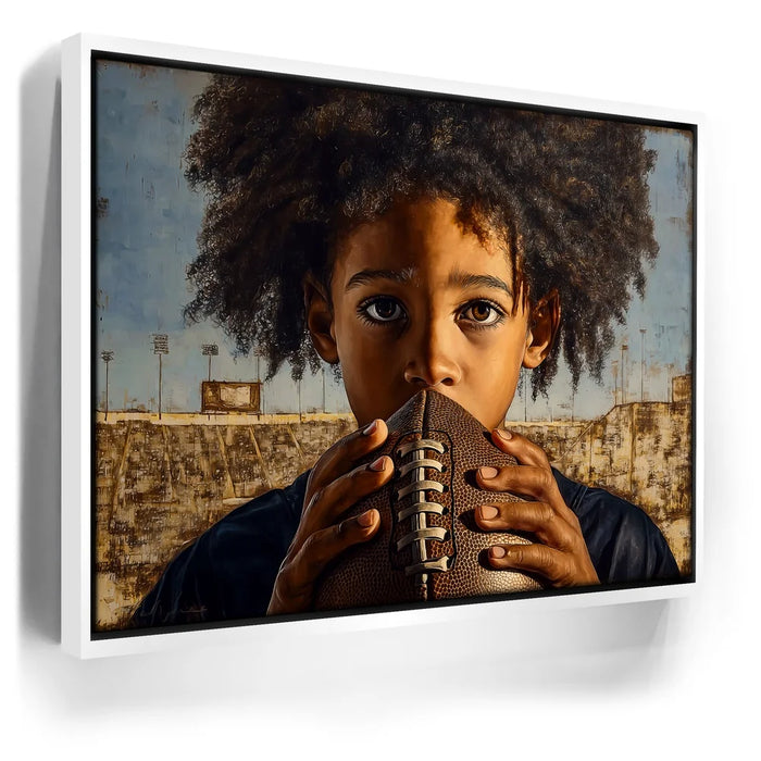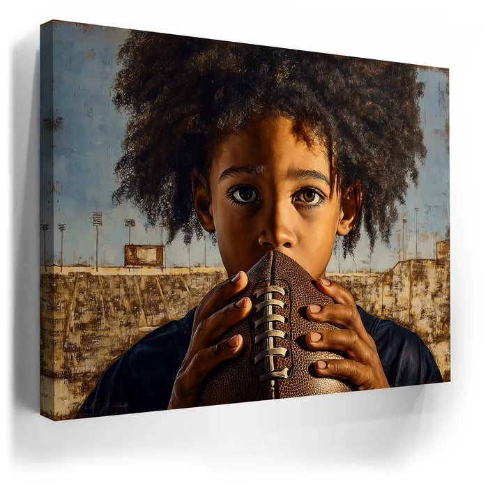 “Eyes On The Goal” by Kandise King captures the raw focus and determination of a young athlete standing at the start of his journey. The child grips a football tightly, eyes wide and locked in with a mix of ambition, nerves, and heart. His natural curls frame his face as the empty stadium behind him hints at future victories, challenges, and dreams waiting to unfold.