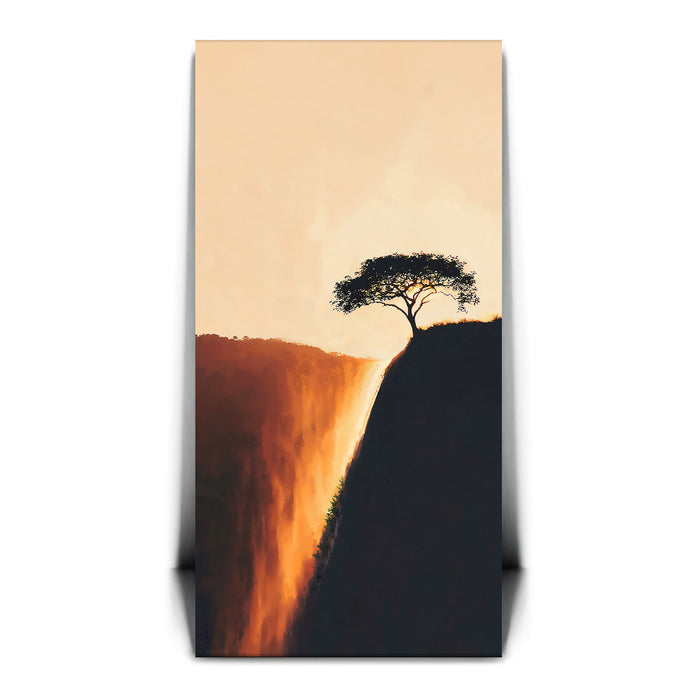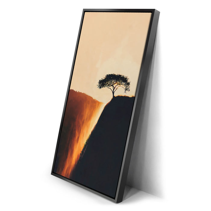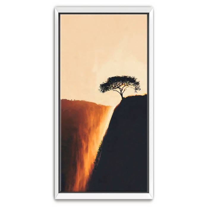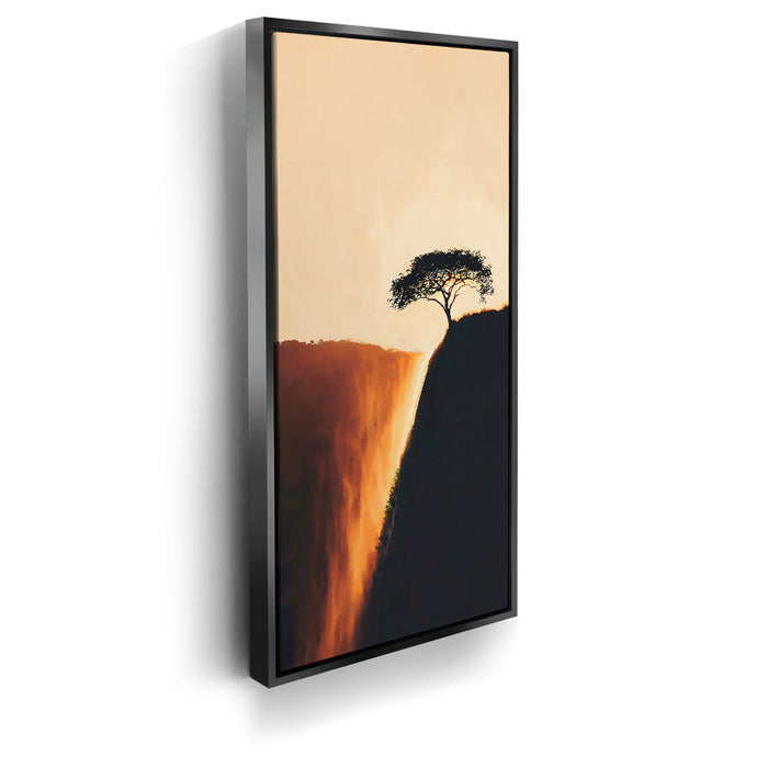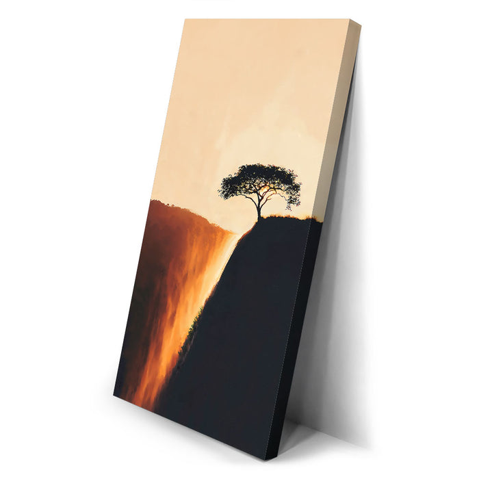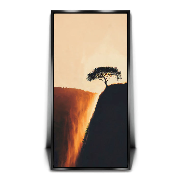 "Falls of Serenity" by Midjourney.Man is a breathtaking depiction of tranquility and natural beauty. The artwork features a solitary tree perched gracefully atop a cliff, overlooking cascading waterfalls that glow with the warm hues of a setting sun. This minimalist yet powerful composition evokes a profound sense of peace and solitude.